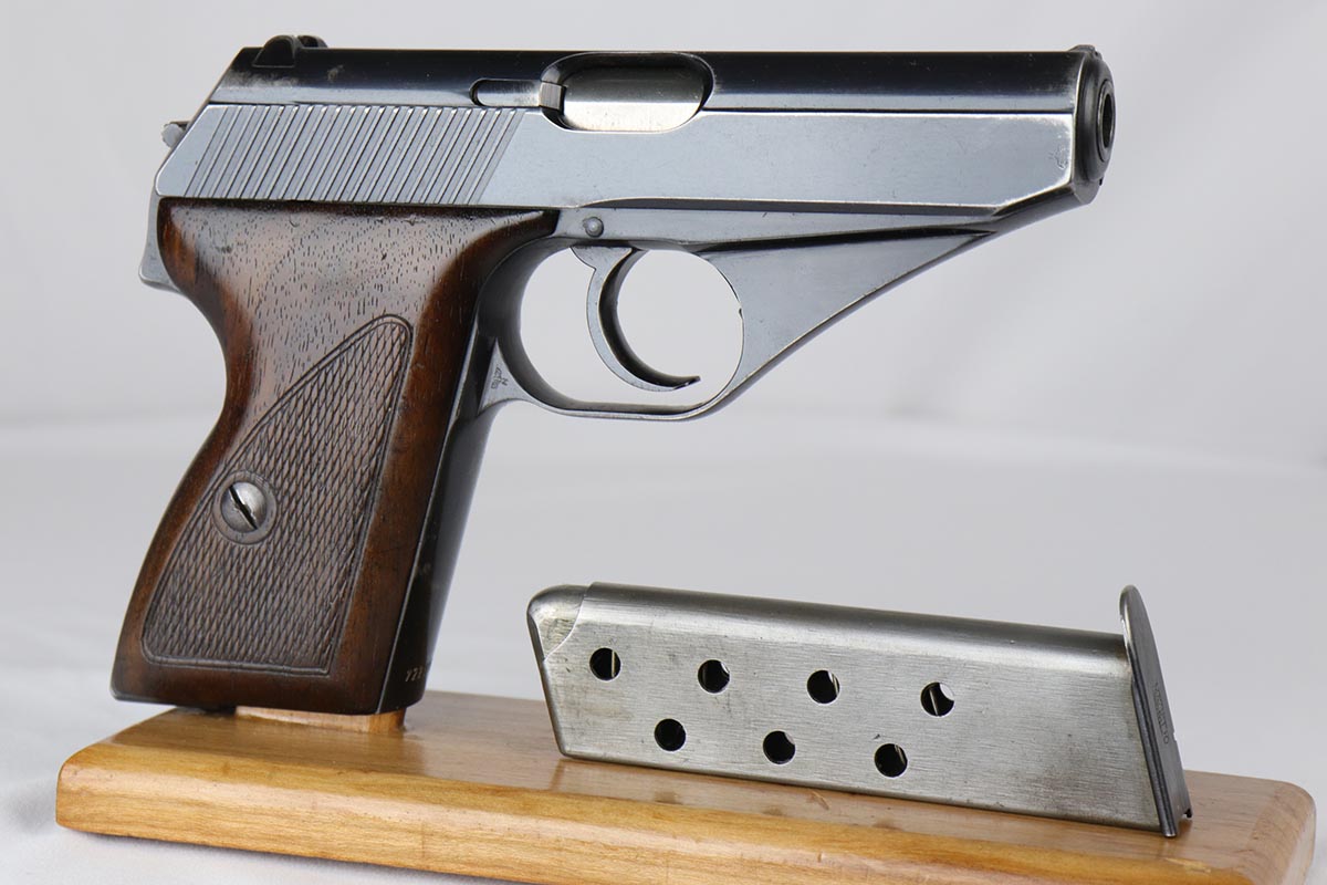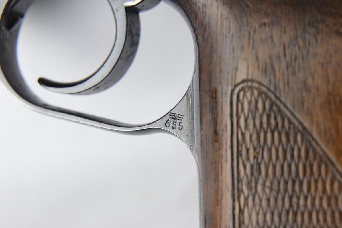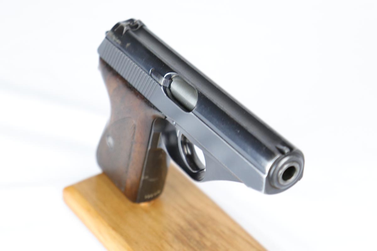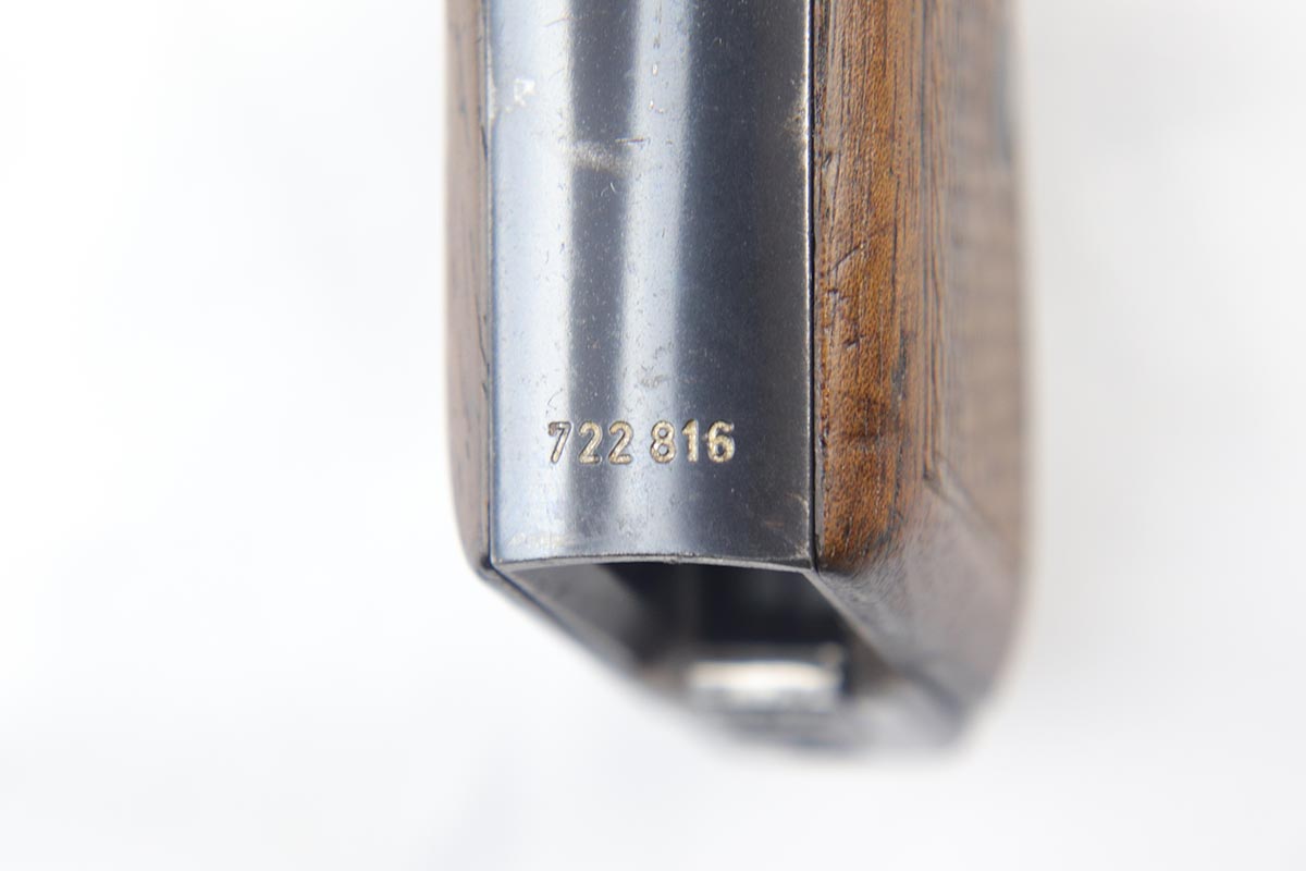 6/20/18 – This is an early Army Mauser HSc, with high-polish finish and Eagle over 655 marking on trigger guard. This is one of the first ~23,000 HSc’s ever made, likely in mid 1941. The bluing rates at about 94% with muzzle wear on both sides of the slide and a little more on the front strap. Excellent grips and Mauser banner magazine. Comes with a very nice, period original holster that is unmarked. Excellent bore.