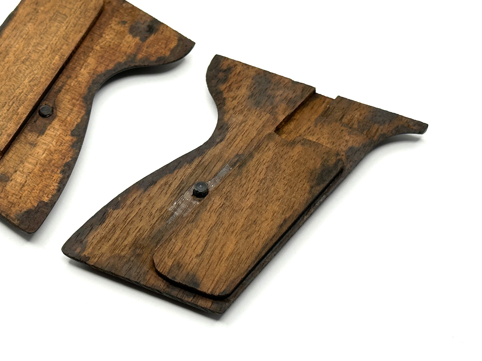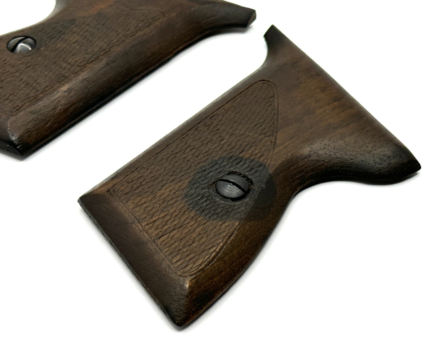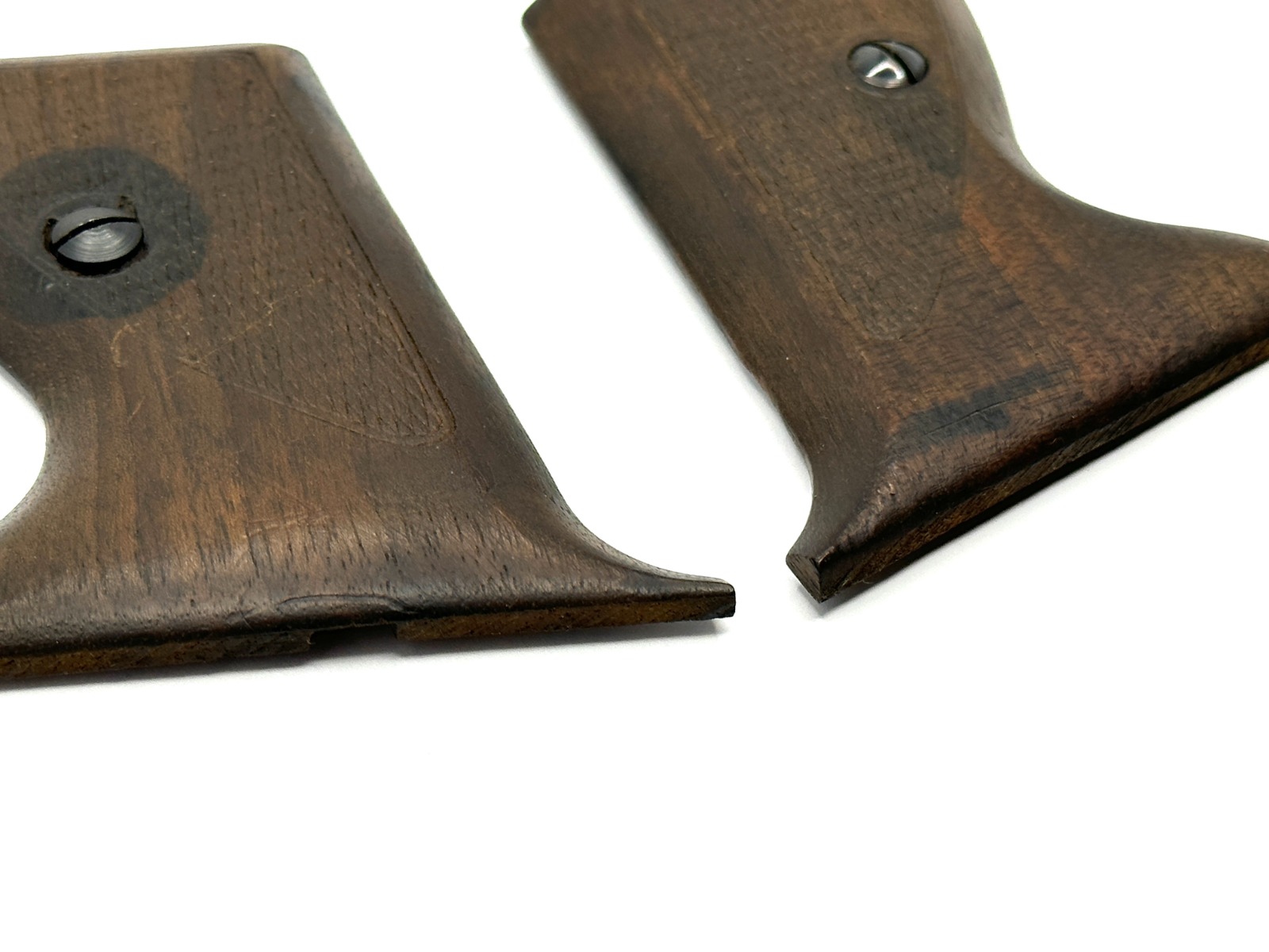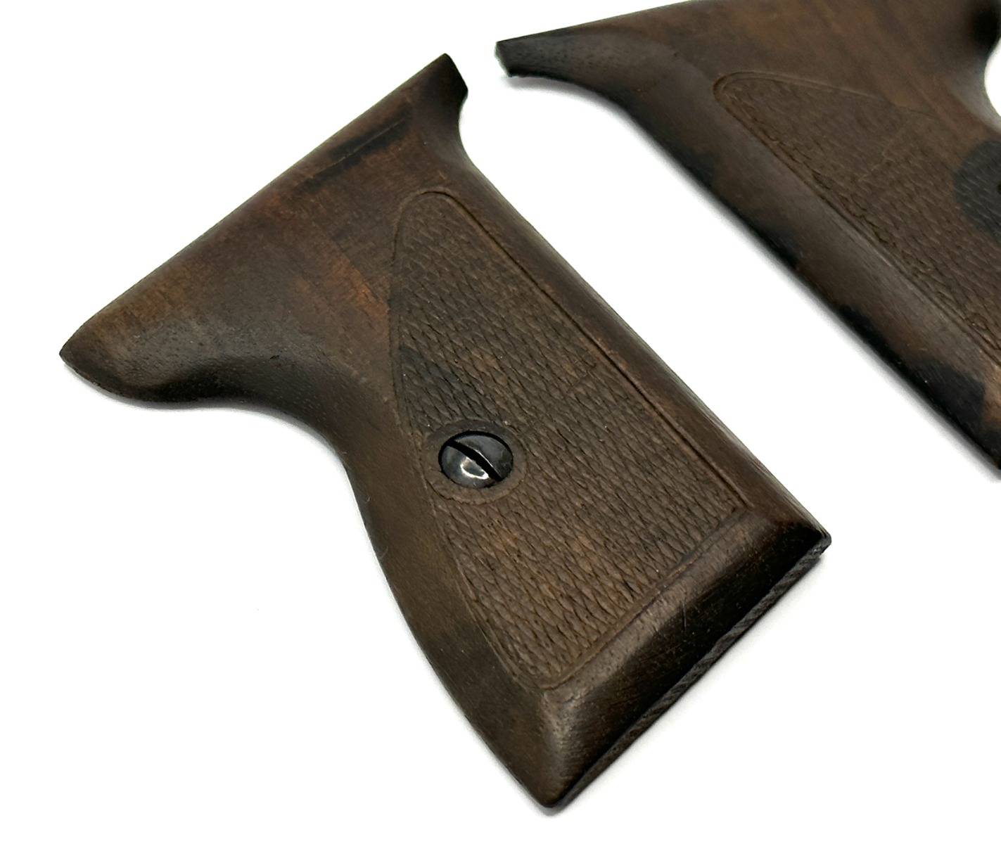 7/19/23 – This is a pair of original WW2 production Mauser HSC grip panels with screws included. These grips are in excellent condition, with only minor surface scratches on the left grip panel. The thin portion of the top wood on both panels has no chips or cracks. Very hard to find in this condition.