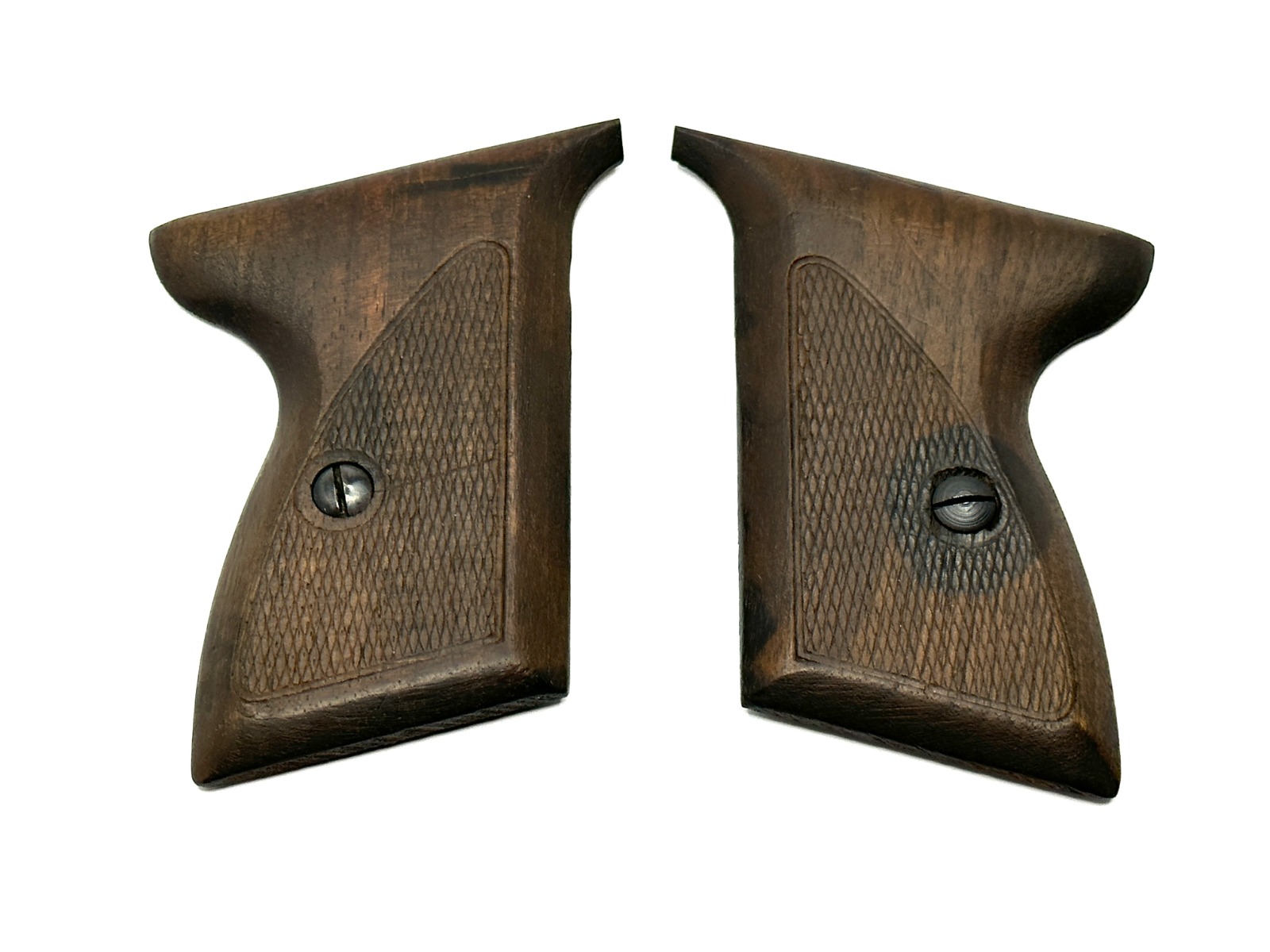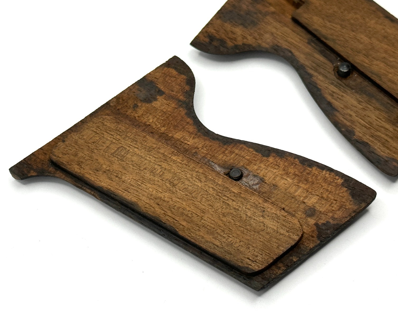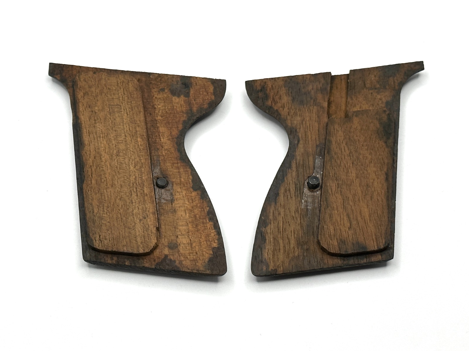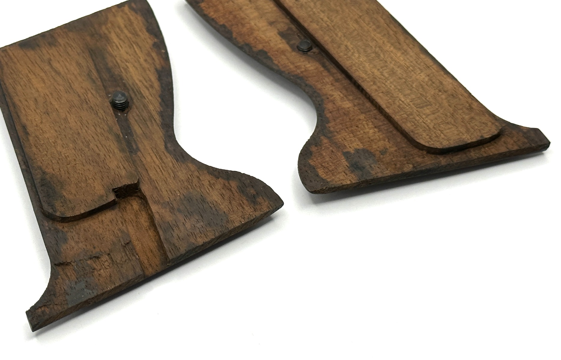 7/19/23 – This is a pair of original WW2 production Mauser HSC grip panels with screws included. These grips are in excellent condition, with only minor surface scratches on the left grip panel. The thin portion of the top wood on both panels has no chips or cracks. Very hard to find in this condition.
