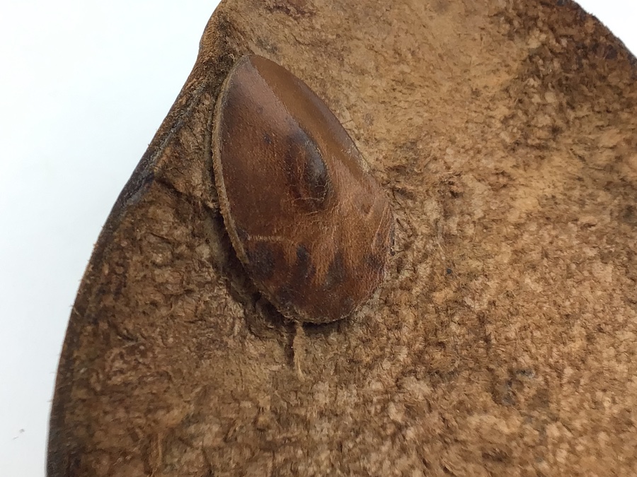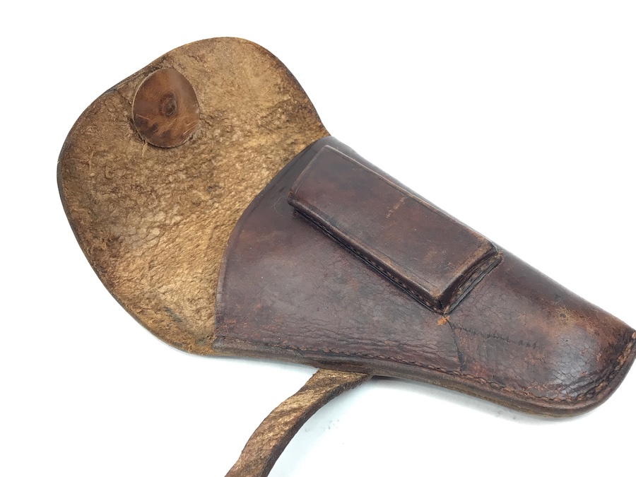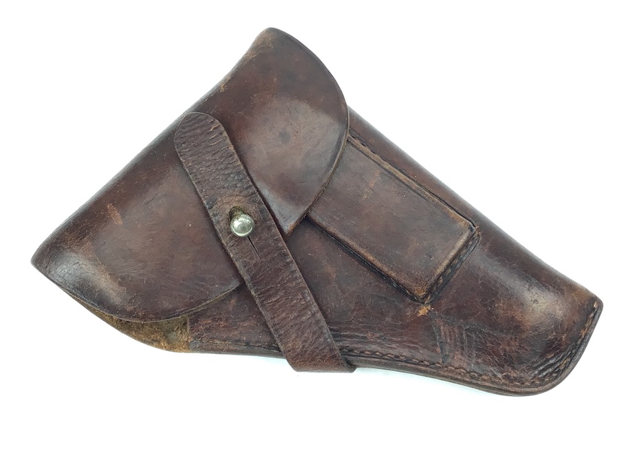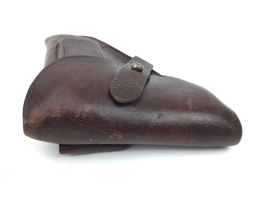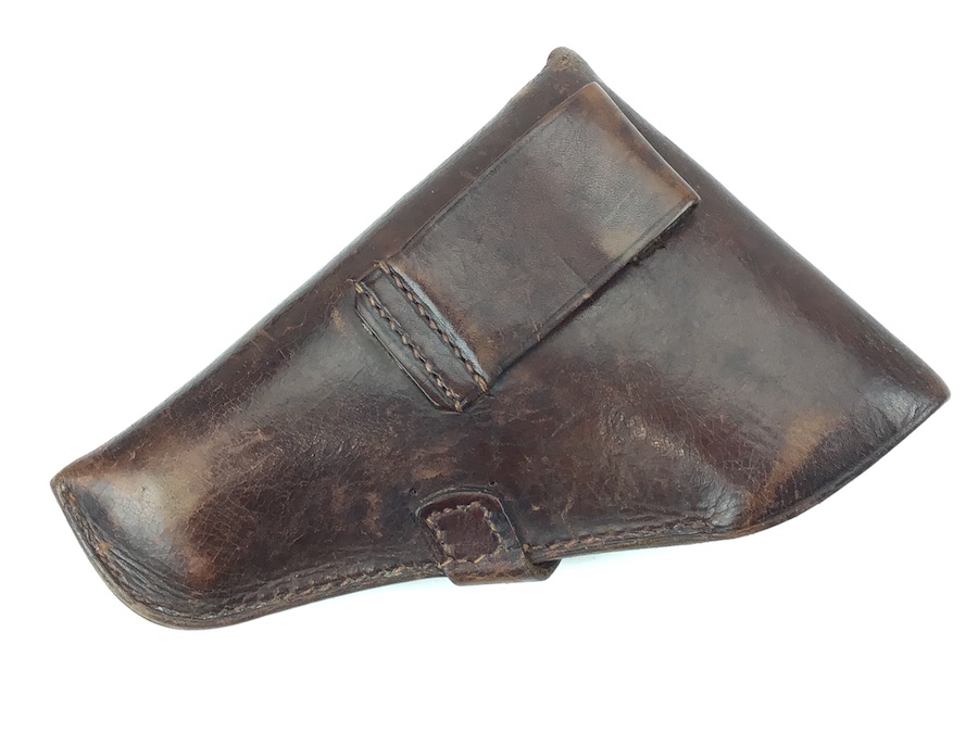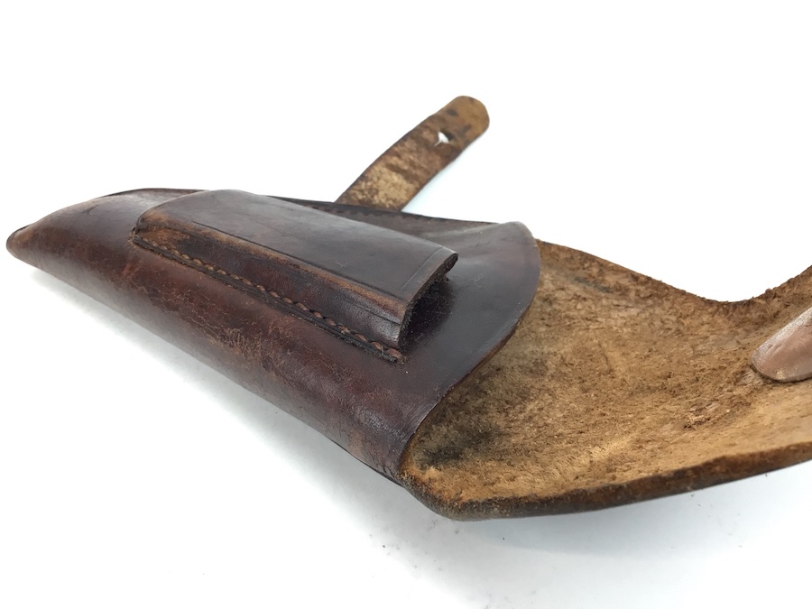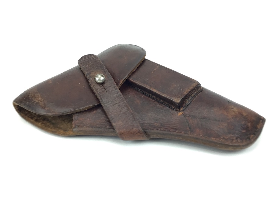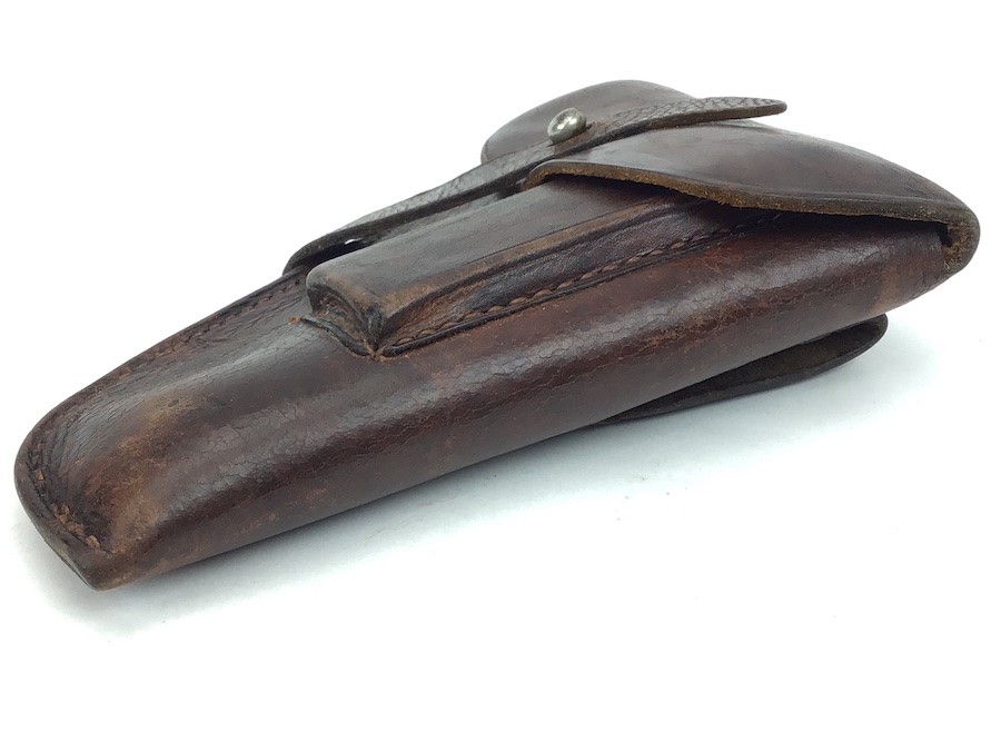 6/10/21 – This is a commercial style Mauser HSc holster. We say commercial because there are no maker stamps or markings on the leather. The holster is a style we typically see with Mauser HSC pistols, but any 7.65mm axis pistol would be appropriate. Very nice brown leather and excellent stitching. Clean leather shows normal signs of use and only mild aging. Closure stud pad under the flap is partially loose but it is secure.