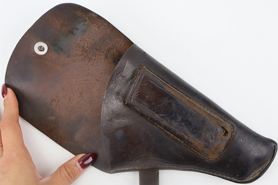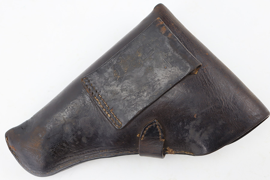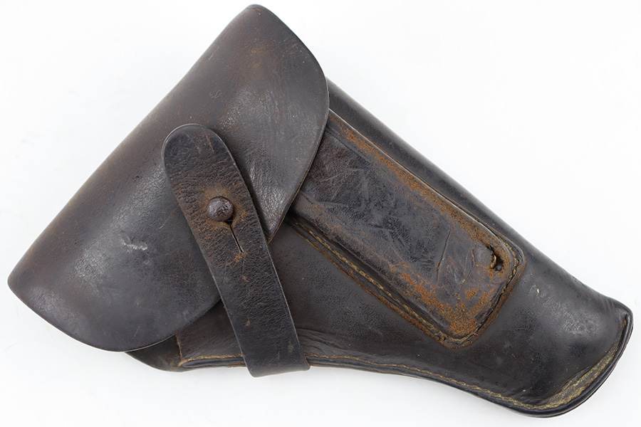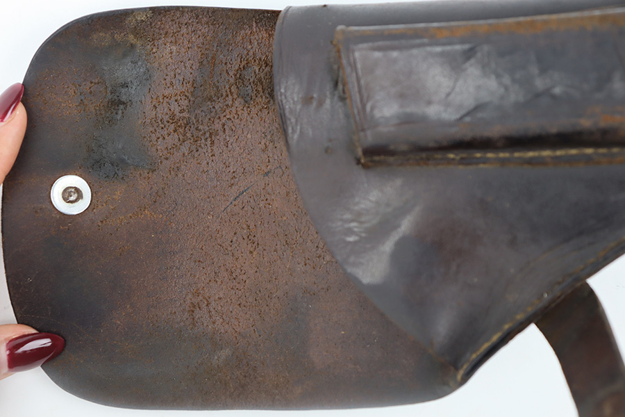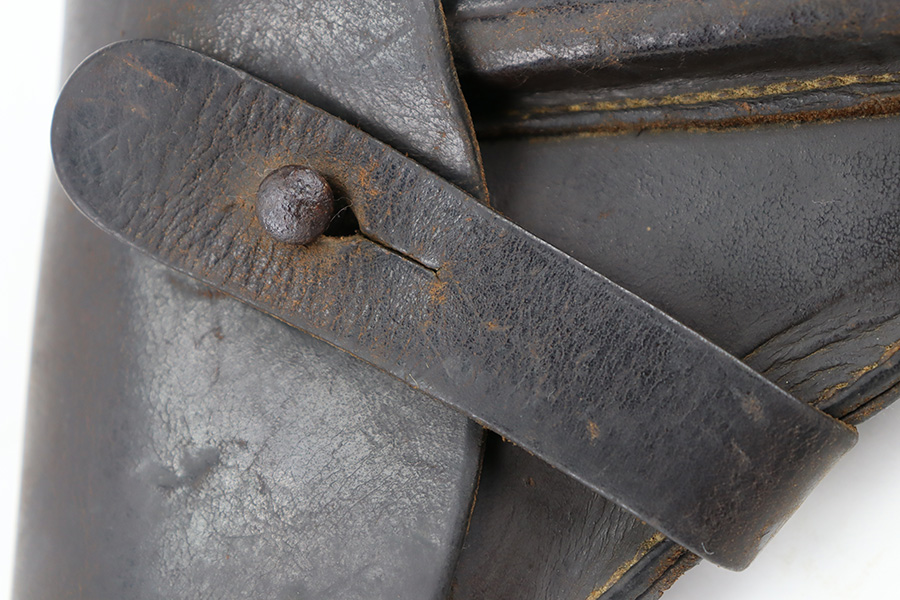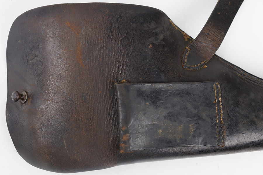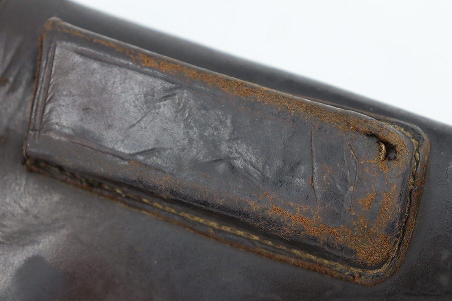 11/30/23 – This is a WW2 Mauser HSC or M1934 holster. The holster is unmarked except for a very faint “MAUSER” ink stamp on the interior leather. The holster has very good leather with surface aging and wrinkling around the top bend of leather. Some rust on the closure knob. The biggest flaw is a small hole and the wear around the magazine pouch, as shown in photos. There’s a few missing stitches on the back belt loop but the belt loop is still secure and attached. No other stitching issues. Priced according to condition.