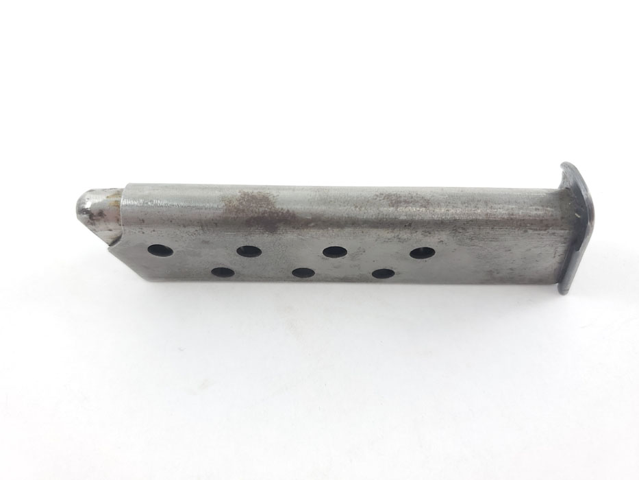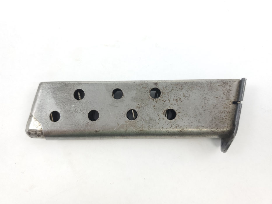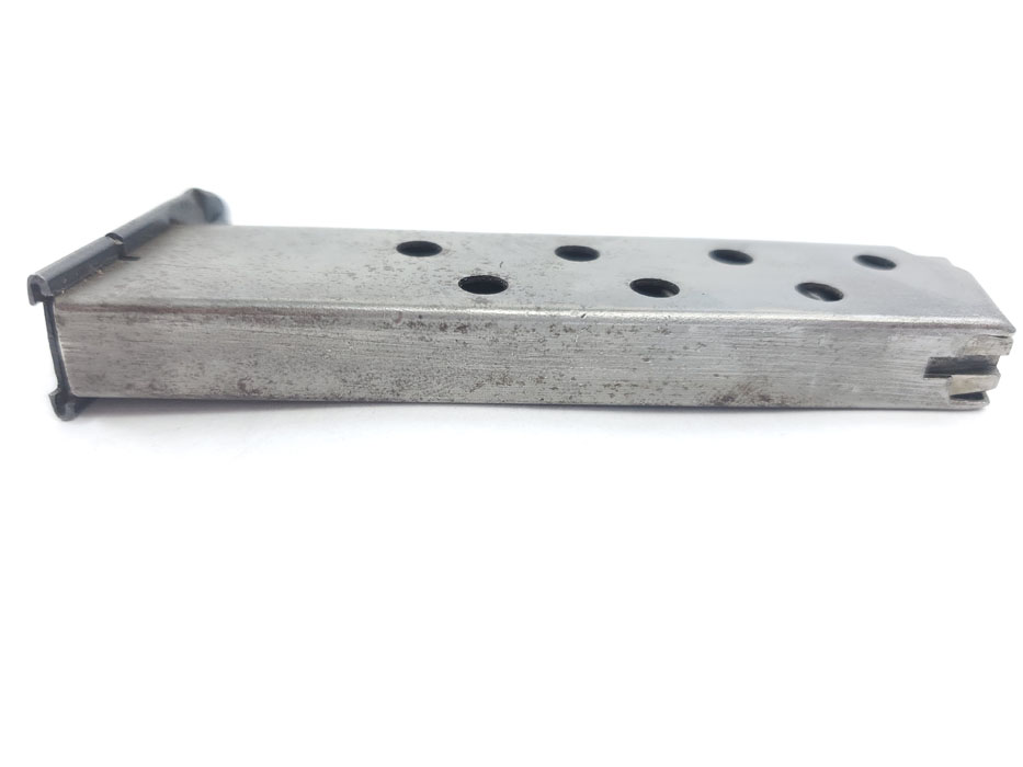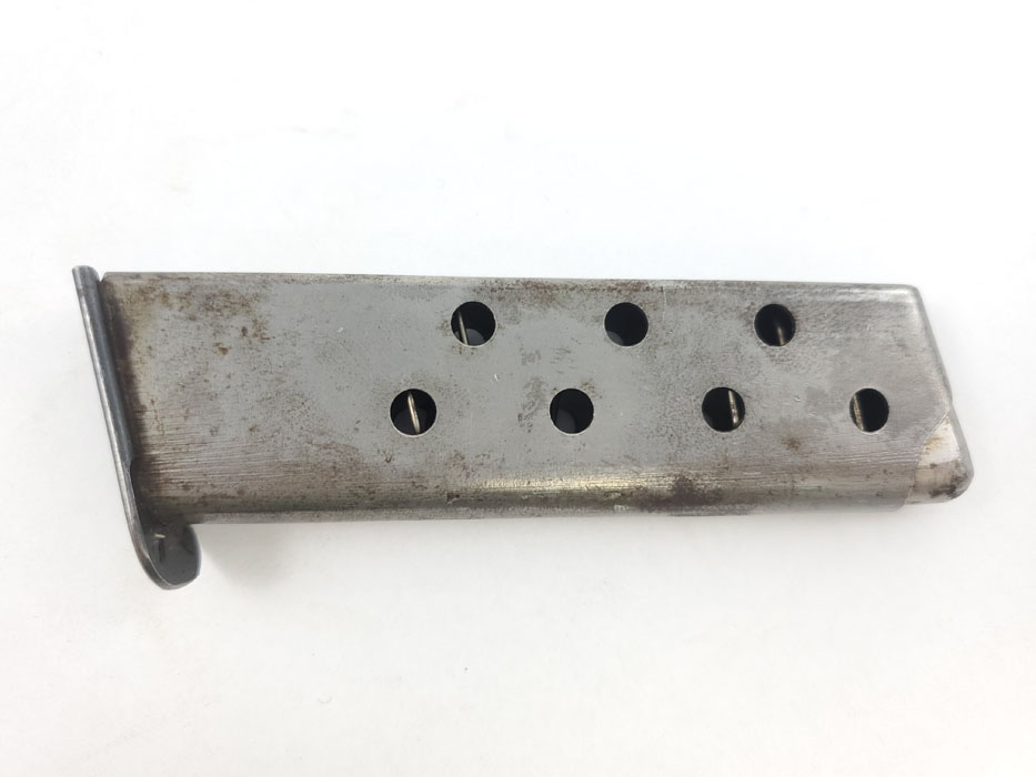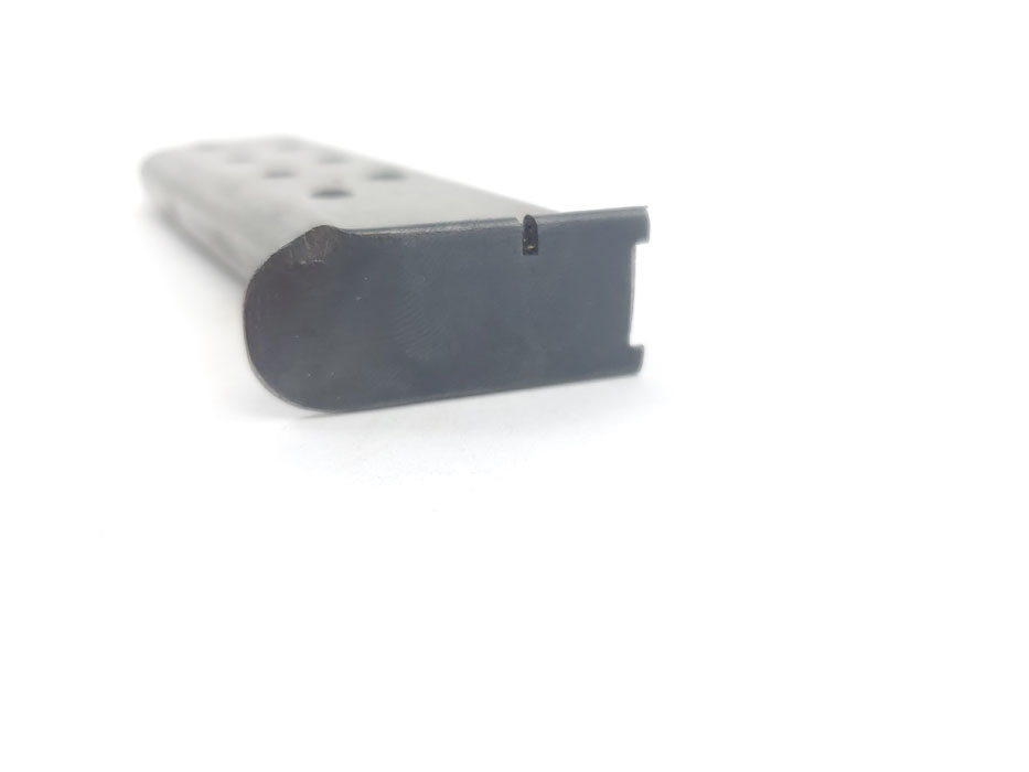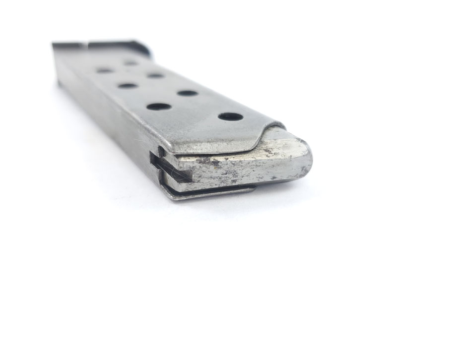 5/1/20 – This is an original WW2 era production Mauser HSc magazine. Phosphate body and blued base. The base is bent in on one corner of the lip, as shown in photos. There is some light surface wear on the tube as well, but the magazine overall feeds and functions properly. Priced based on condition.