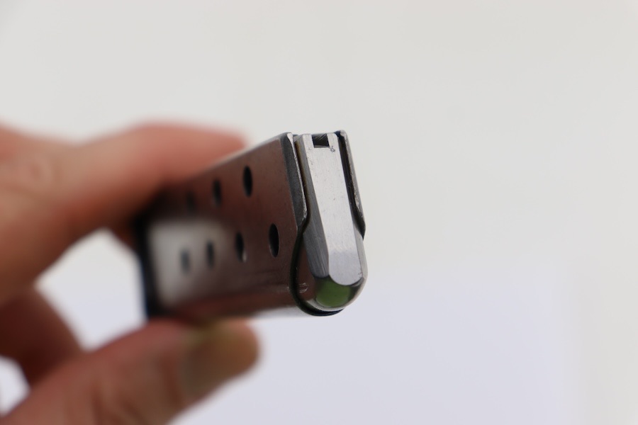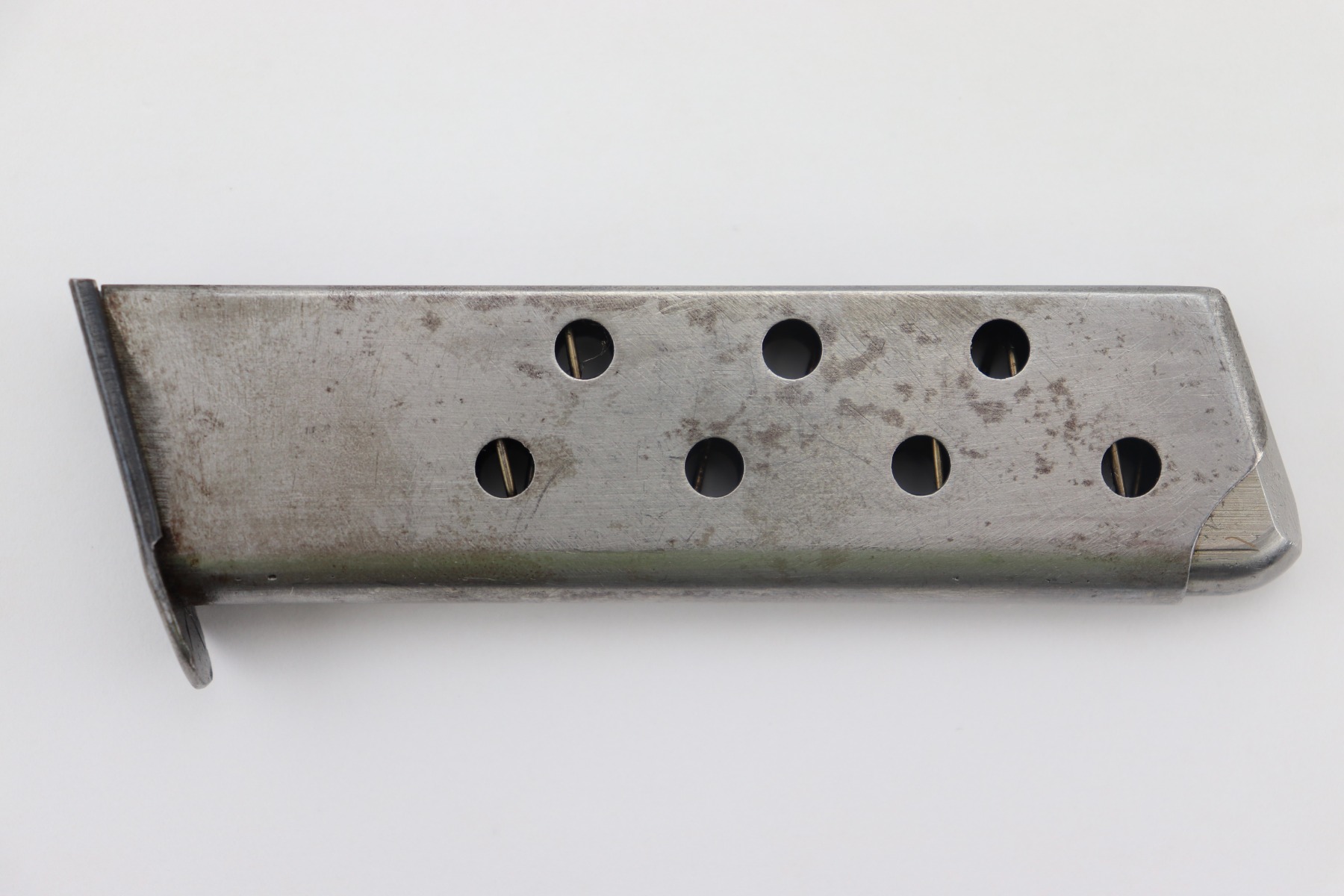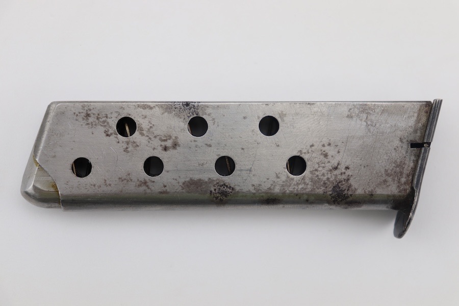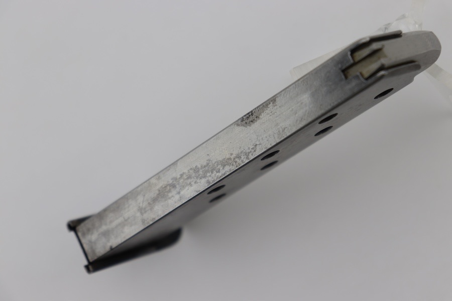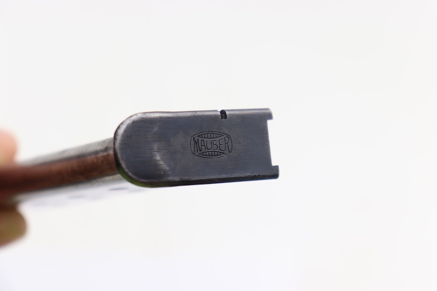 2/28/24 – This is an original Mauser model HSc magazine from early / pre WW2. The magazine has a Mauser banner stamp on the base, meaning this is an earlier commercial magazine. There is excellent bluing on the base; however, there is some pitting and a darker patina on the tube. Overall in good condition with a strong spring.