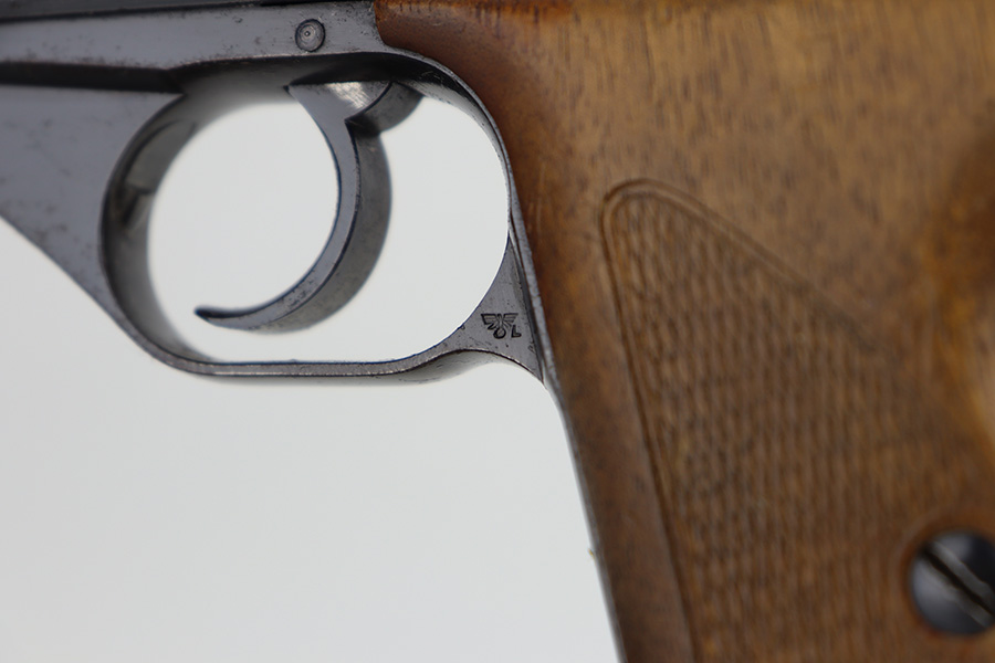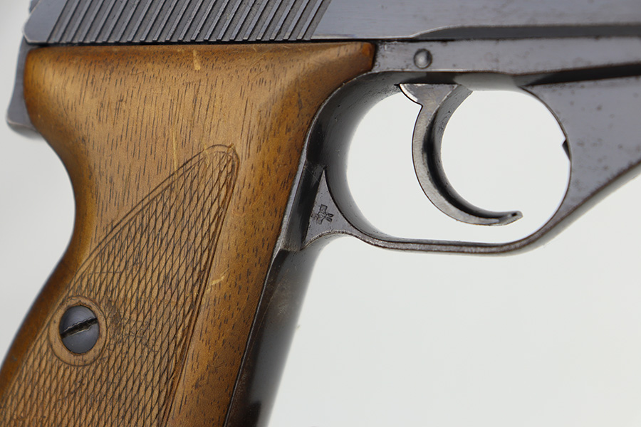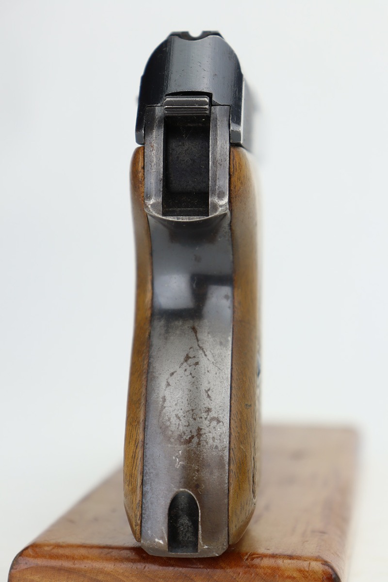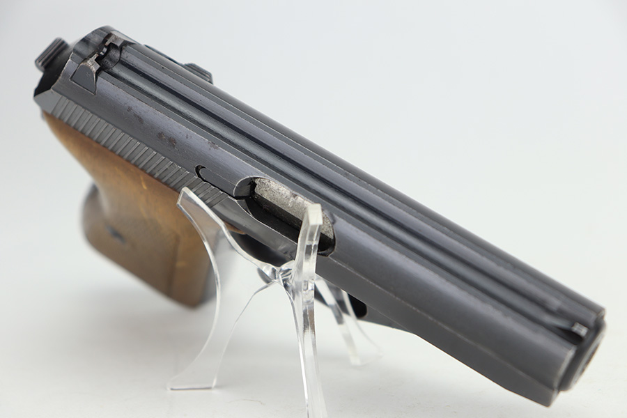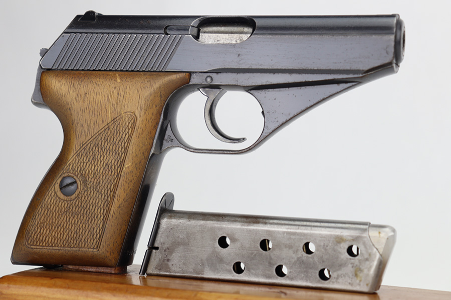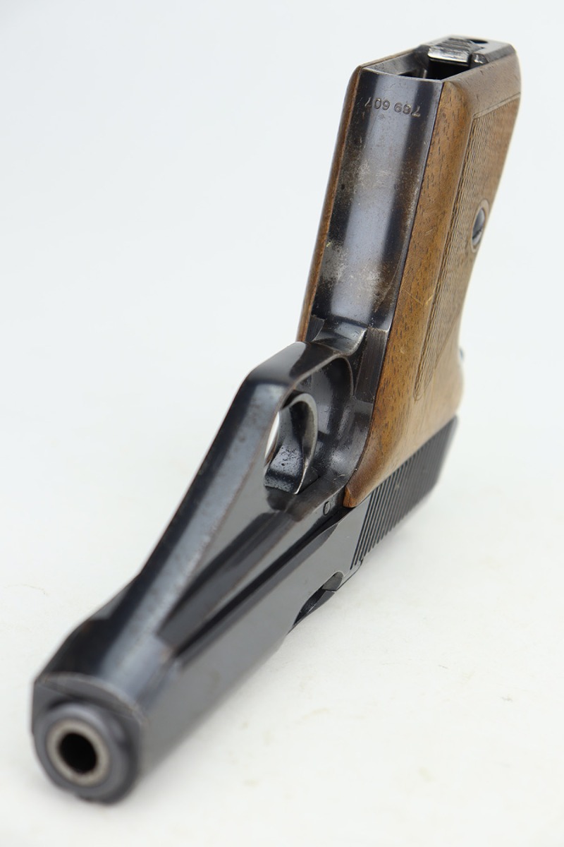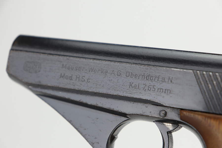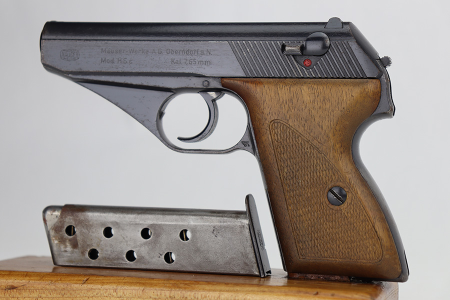 06/05/2024 – This is a very nice example of a Mauser HSC issued to the Nazi police force in 1942. The original finish rates somewhere between 85-90%. Virtually all of the wear is on the grip straps, so the profile views are minty. Very light pin-pricking on the left side of the muzzle. Fitted with period-correct wood grips and comes with a proper magazine. Mint bore. The handgun is mismatched.