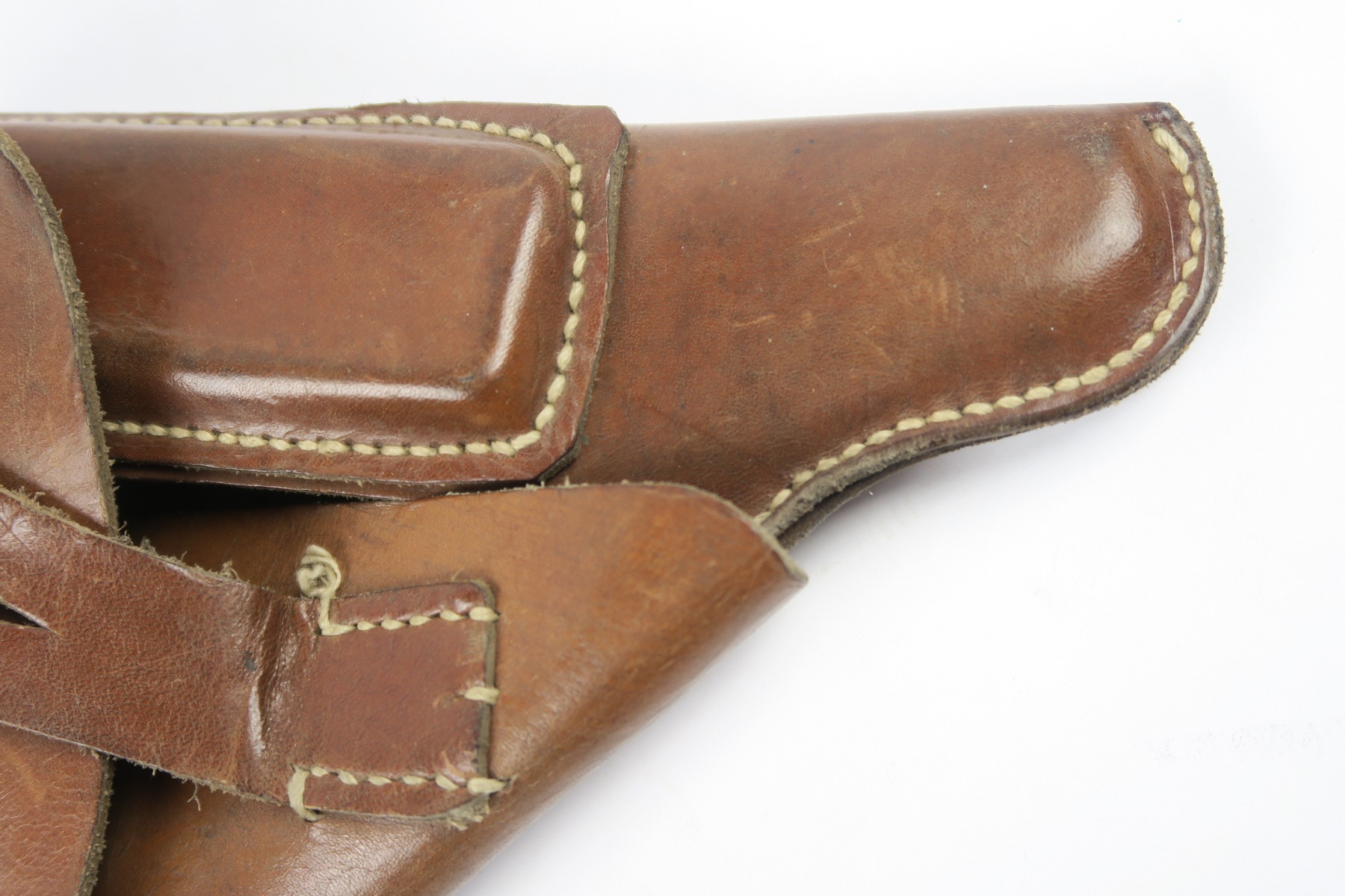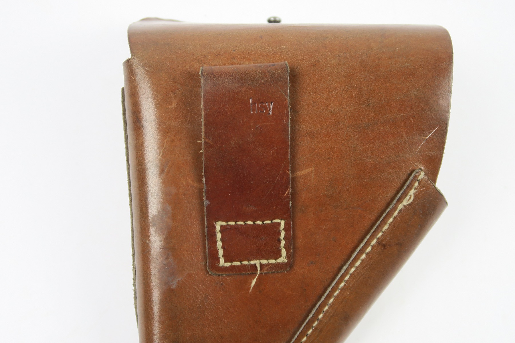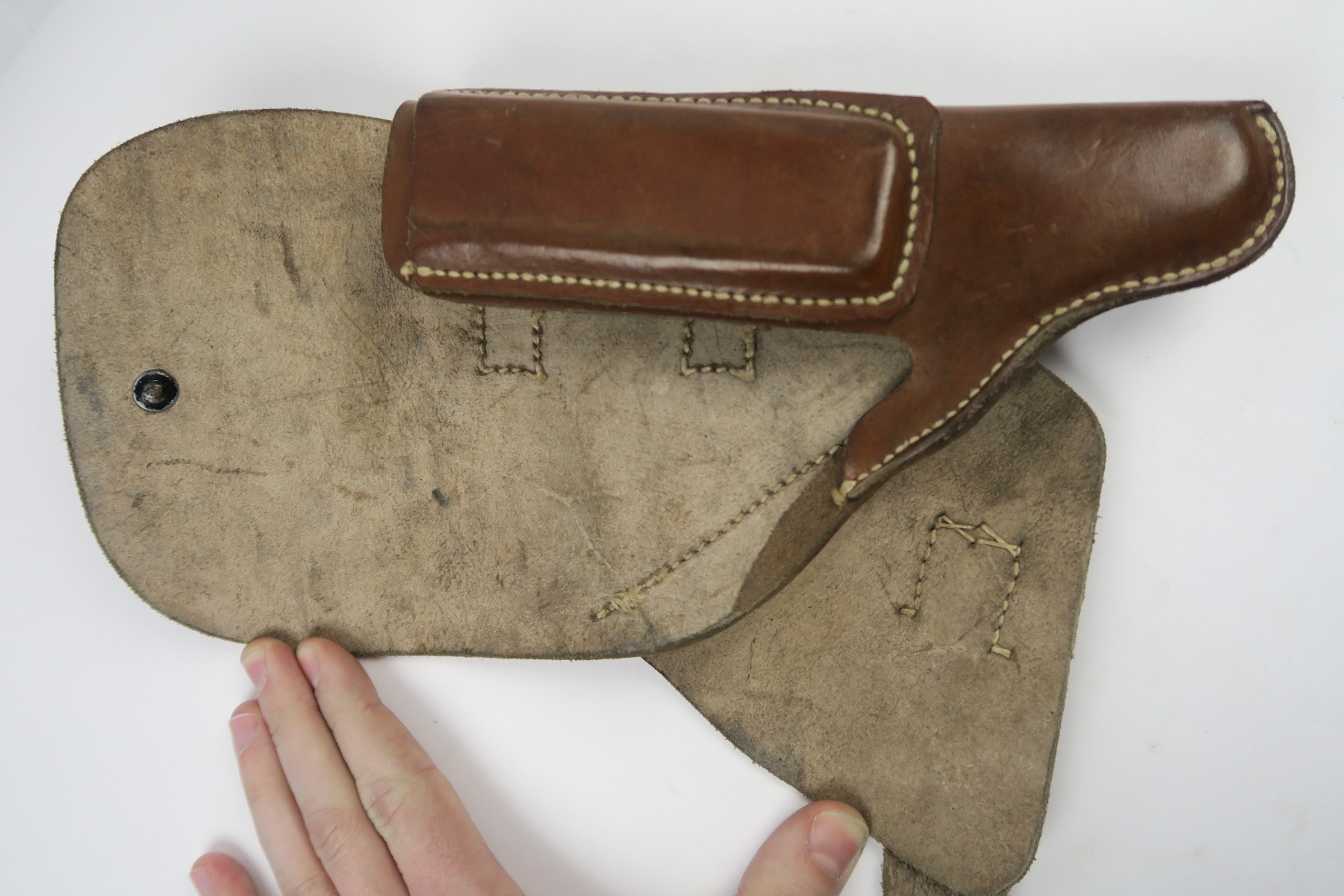 2/10/18 – This is a minty condition Mauser HSc or Sauer 38h holster. The holster is late WW2 1944 production, and most likely unissued. The holster is eagle stamped with a “4” underneath the closure strap. The back belt loop is “hsy” maker stamped. The light brown leather is firm and clean. The stitching is all original and in tact. Guaranteed original and authentic.
