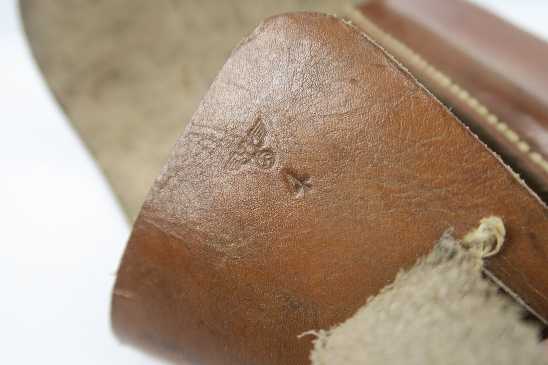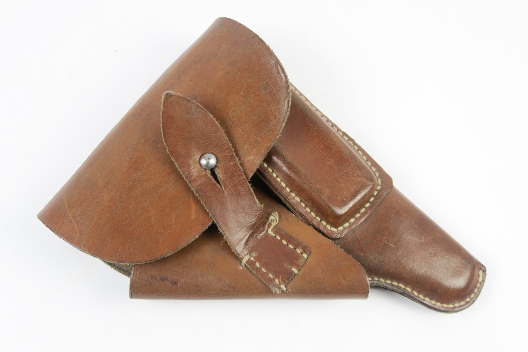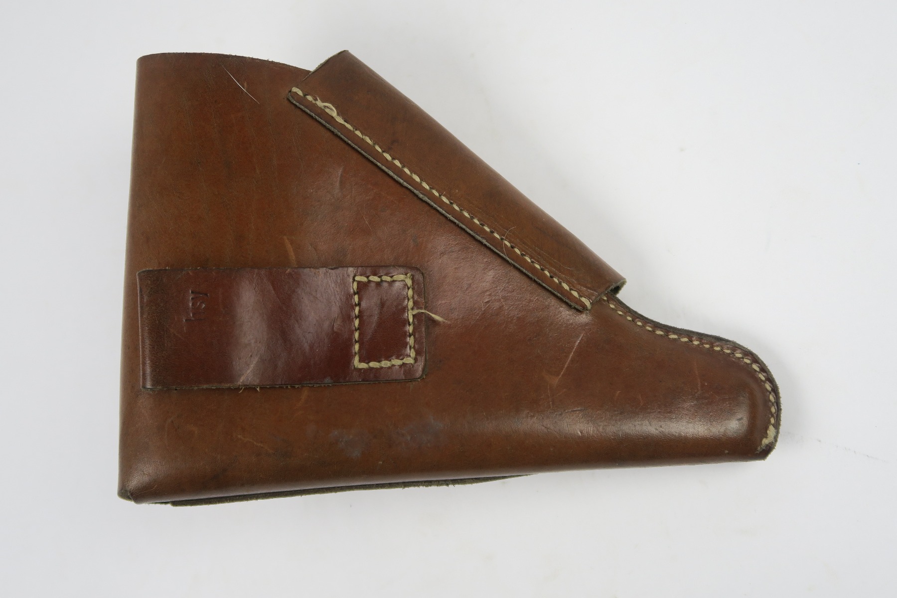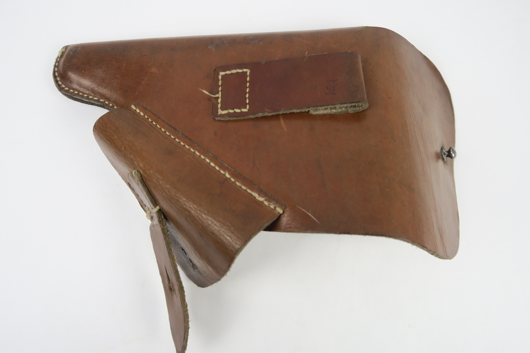 2/10/18 – This is a minty condition Mauser HSc or Sauer 38h holster. The holster is late WW2 1944 production, and most likely unissued. The holster is eagle stamped with a “4” underneath the closure strap. The back belt loop is “hsy” maker stamped. The light brown leather is firm and clean. The stitching is all original and in tact. Guaranteed original and authentic.