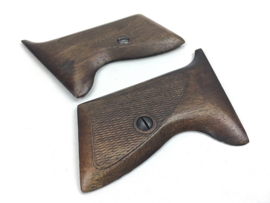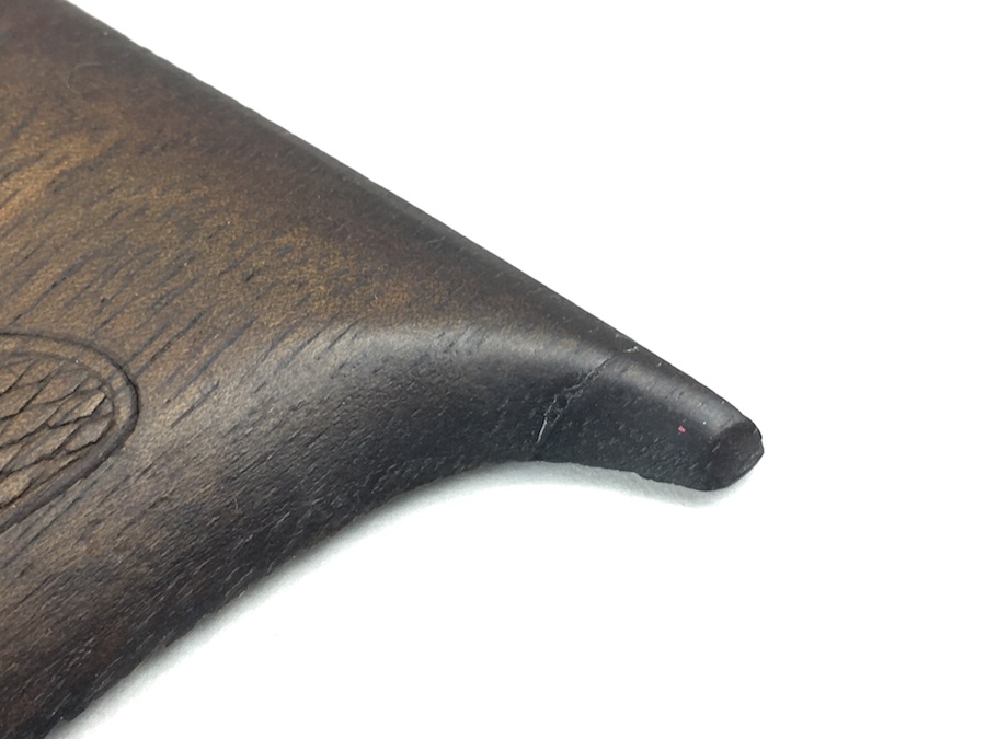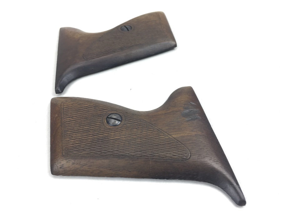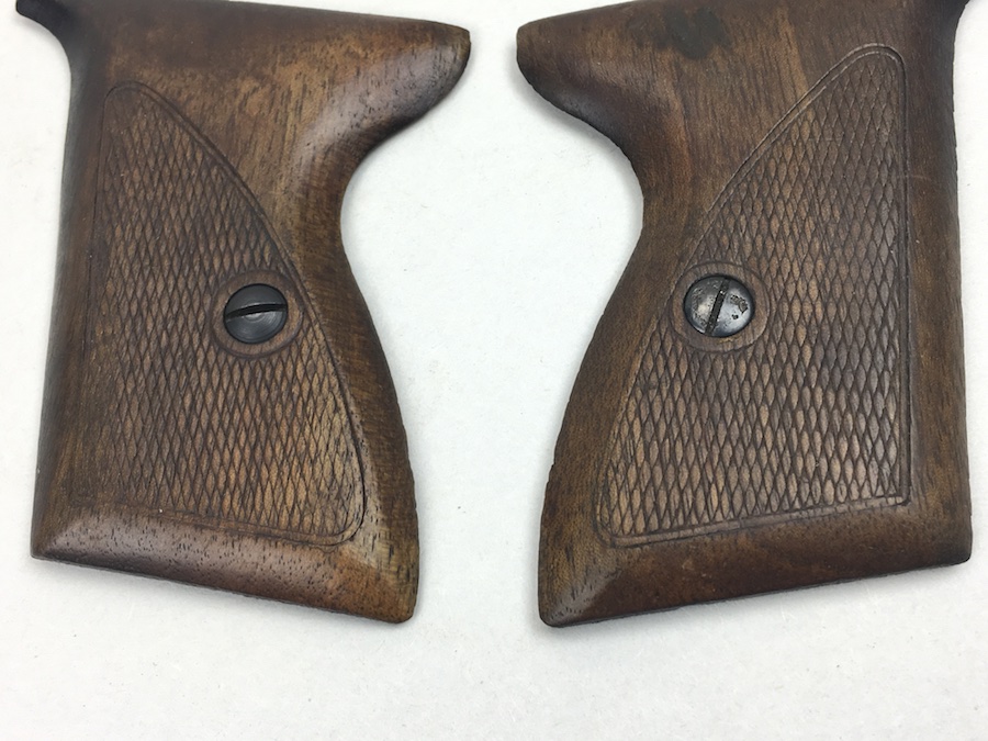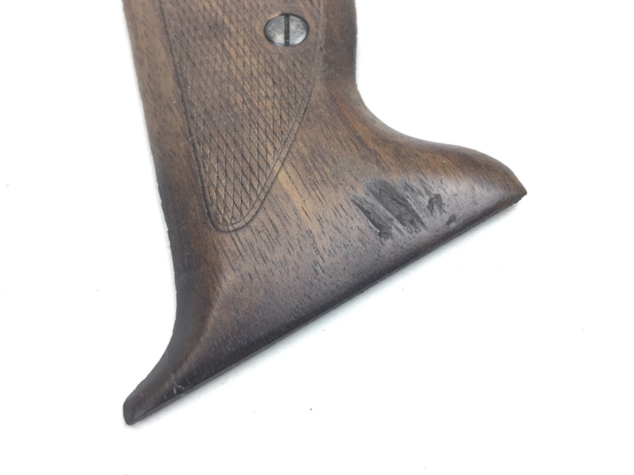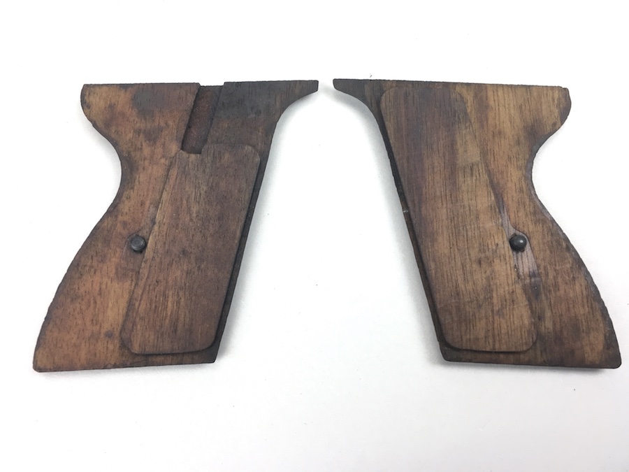 7/11/19 – This is an original pair of Mauser HSc wooden grips & screws. They are completely original from the WW2 era and in good+ condition. There are no cracks or chips in the wood, however the right panel has a scar near the top and the “tip” appears to have been repaired. Otherwise a nice pair of grips.