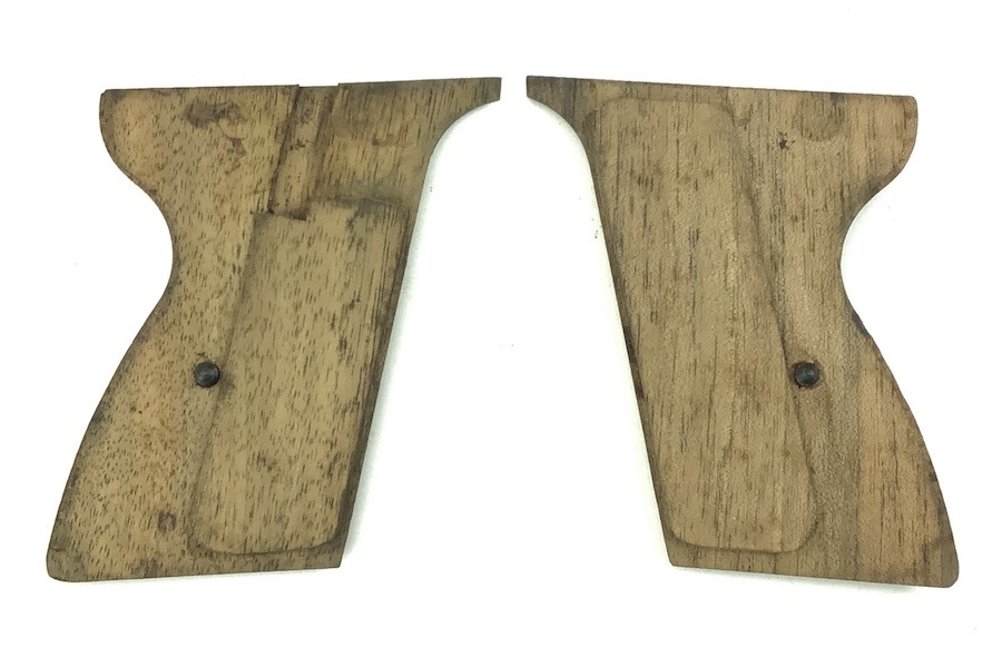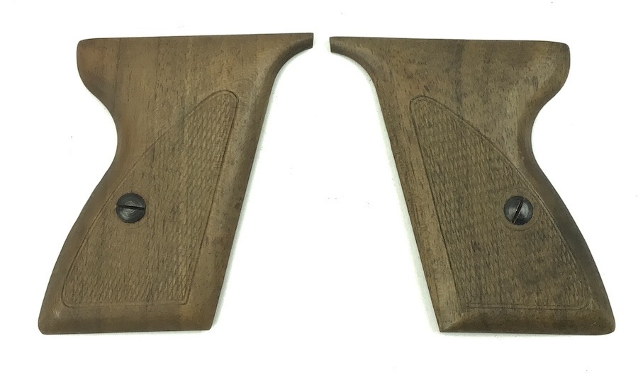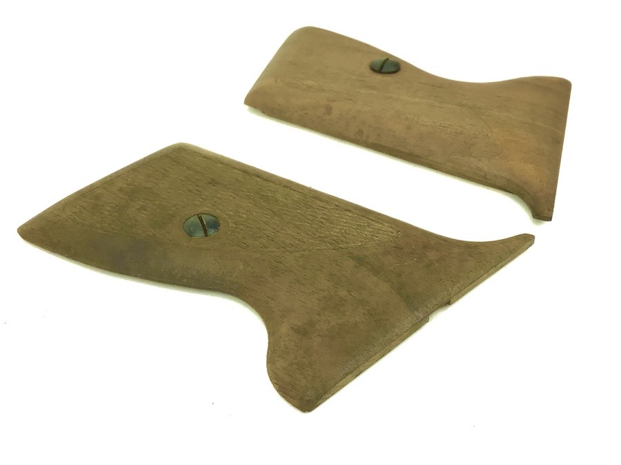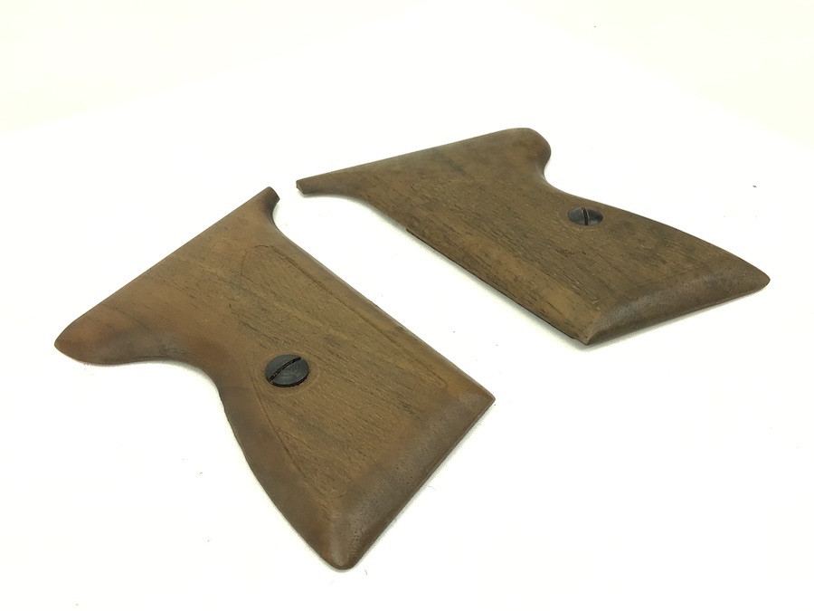 3/2/22 – This is an original and excellent condition pair of wooden Mauser HSc grips and screws. The grips are the early variation with nice checkering. They have no interior markings. The “tips” are intact, which is not a very common sight.