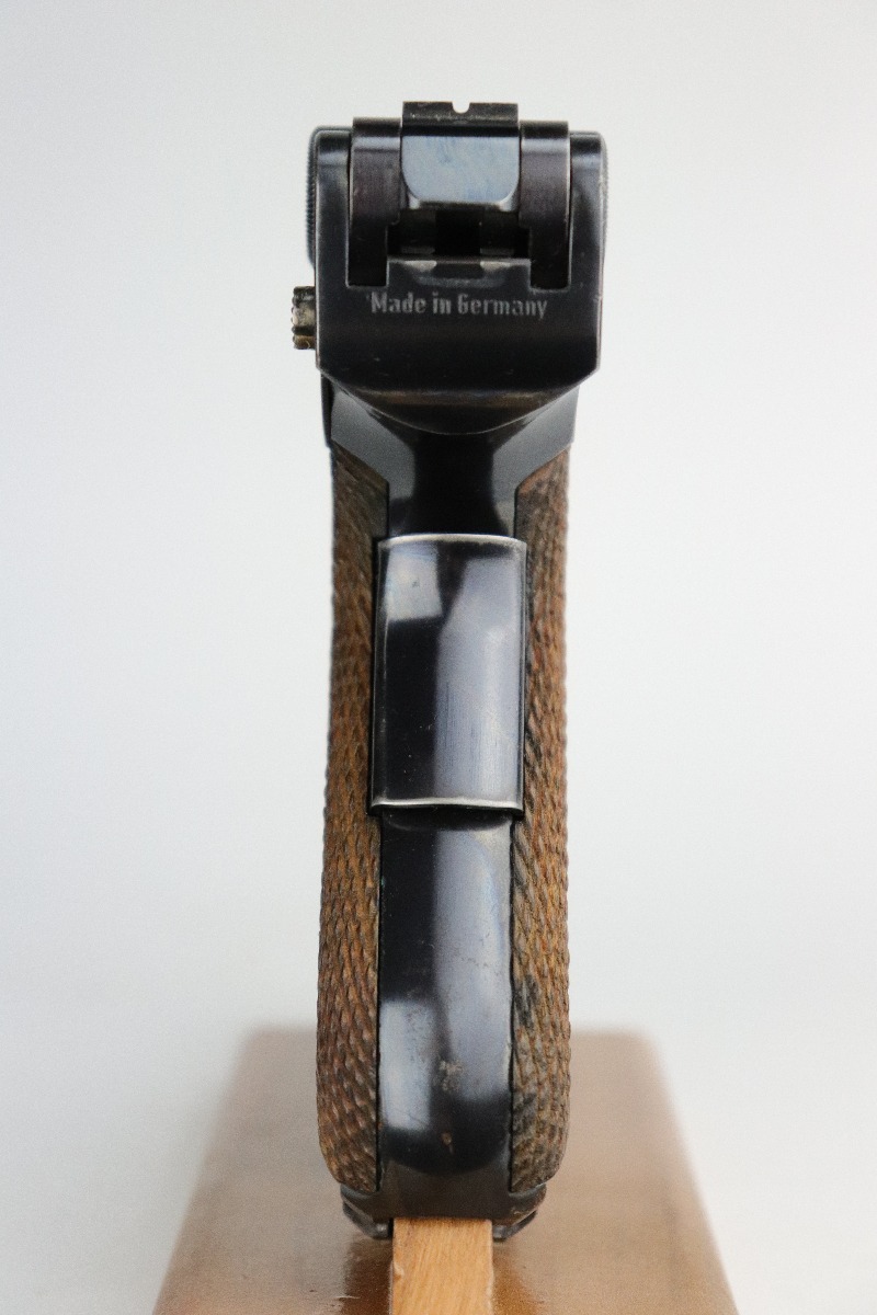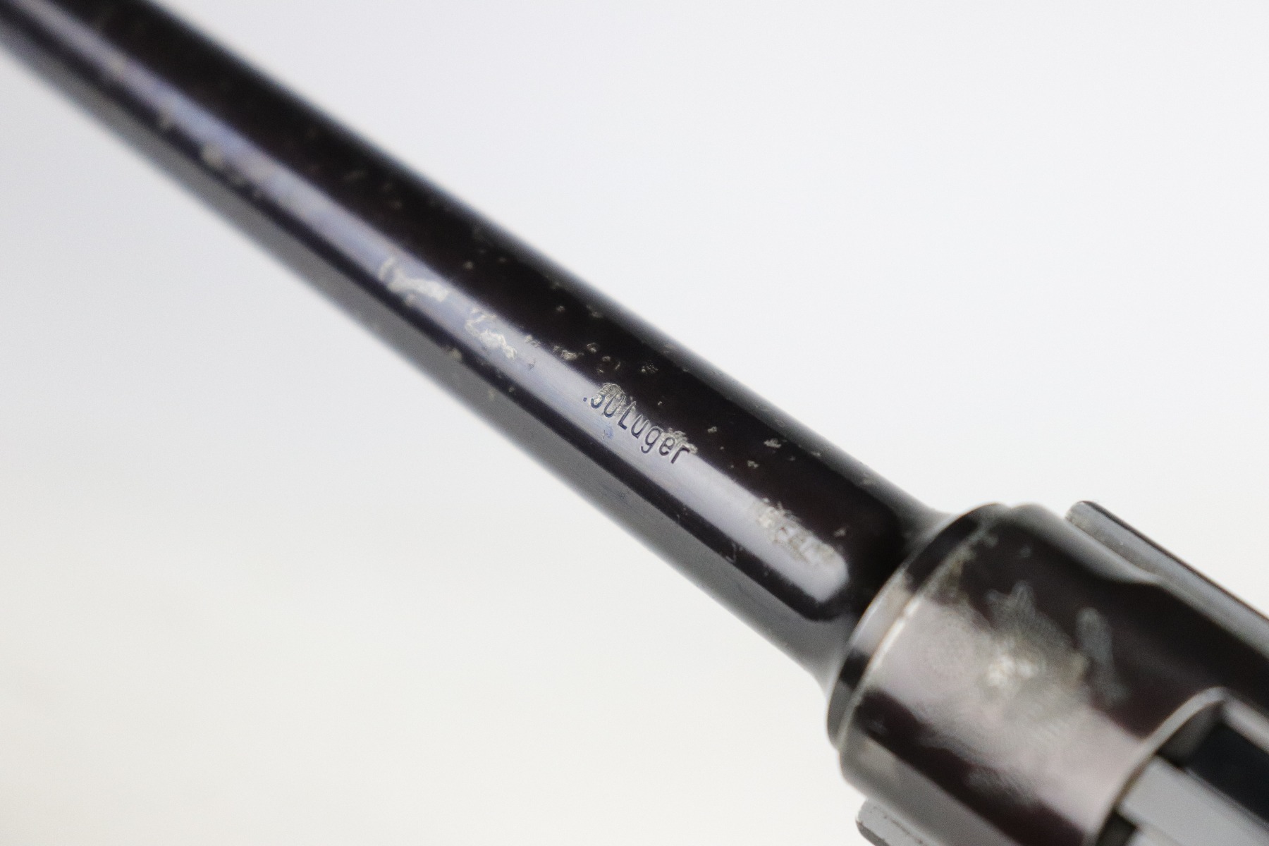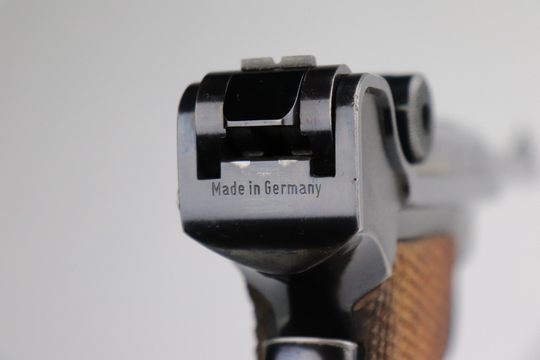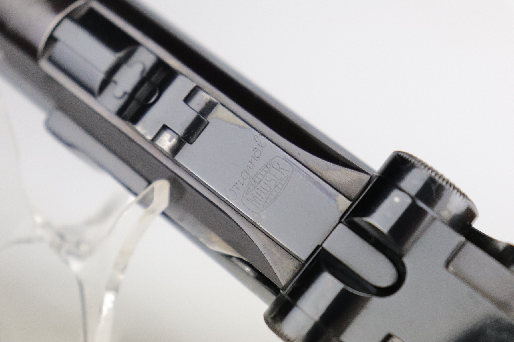 8/21/20 – This is a post-war “American Eagle” Luger, made by Mauser/Interarms of Virginia. It has a Navy-style 5″ barrel, grip safety, and the American Eagle insignia on the chamber. It has retained about 95% of its bluing. Most of the finish loss is very spotty. It is most noticeable throughout the whole barrel, on the front edge of the chamber, and smaller spots on the straps. There are also a few light scratches on the straps. and the left side of the frame. There is more even wear on the side plate. Excellent grips and magazine. The bore is minty.