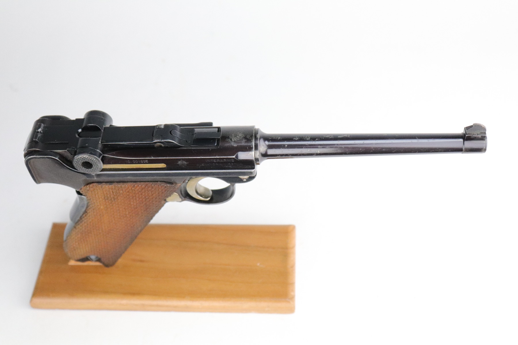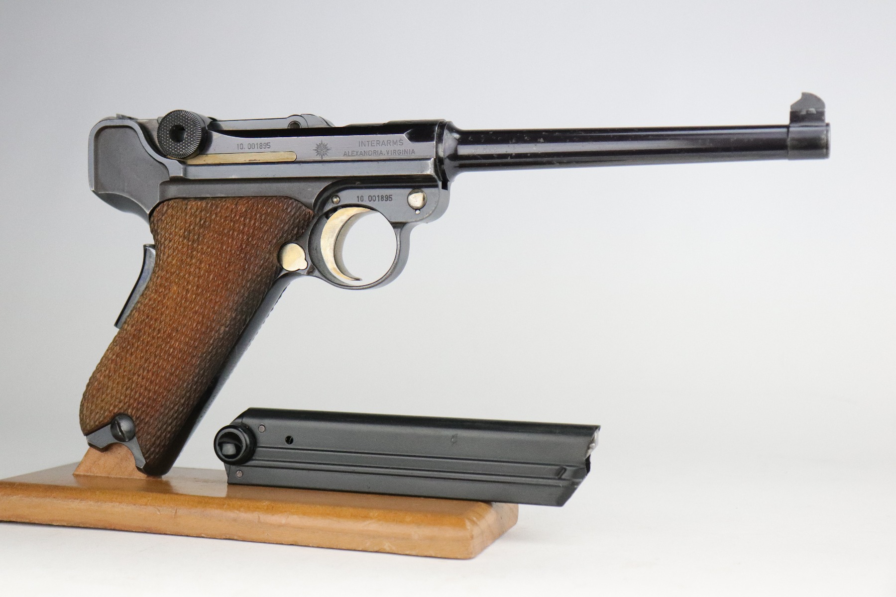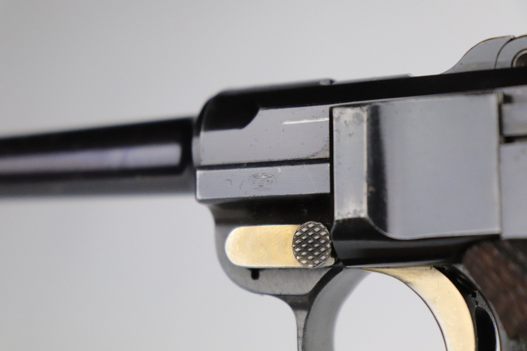 8/21/20 – This is a post-war “American Eagle” Luger, made by Mauser/Interarms of Virginia. It has a Navy-style 5″ barrel, grip safety, and the American Eagle insignia on the chamber. It has retained about 95% of its bluing. Most of the finish loss is very spotty. It is most noticeable throughout the whole barrel, on the front edge of the chamber, and smaller spots on the straps. There are also a few light scratches on the straps. and the left side of the frame. There is more even wear on the side plate. Excellent grips and magazine. The bore is minty.