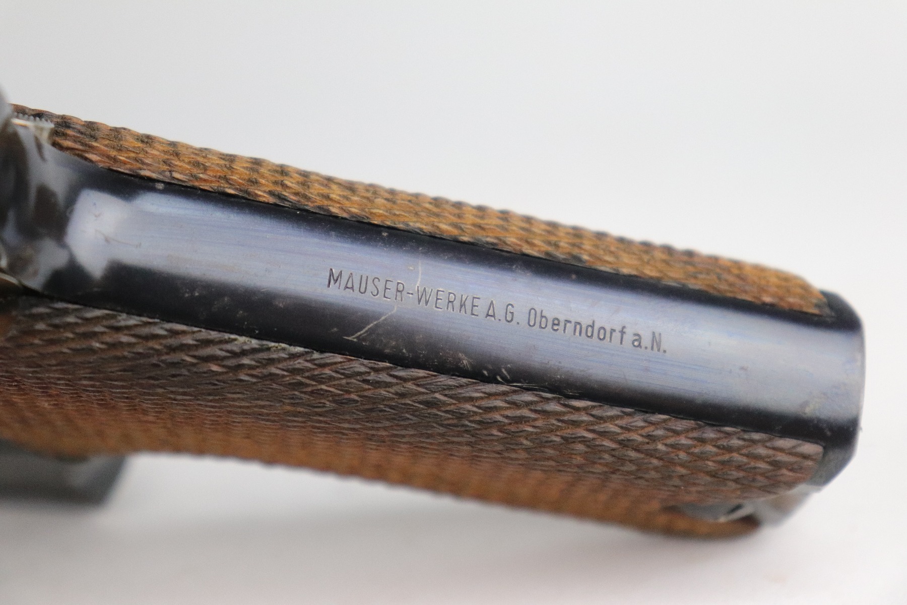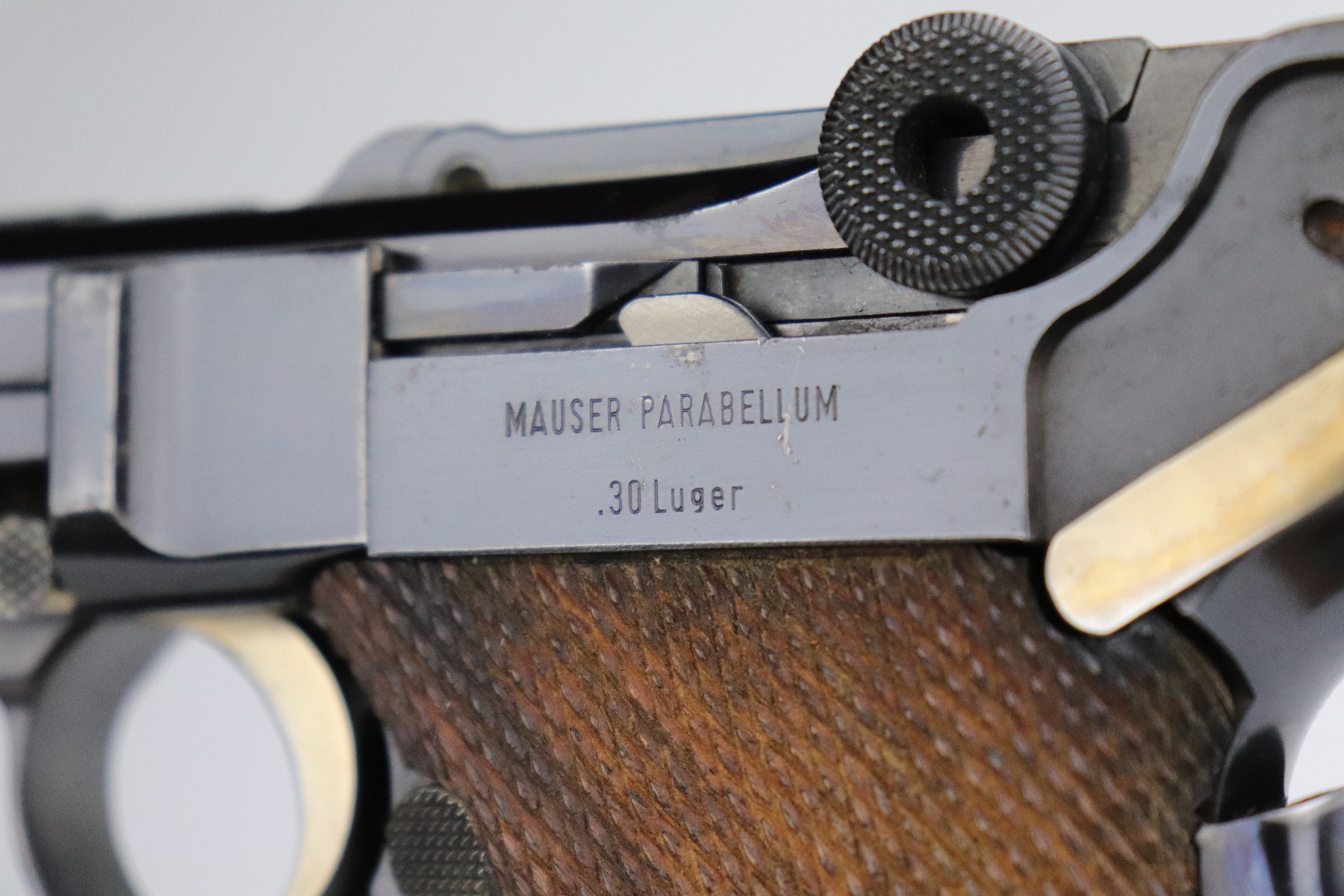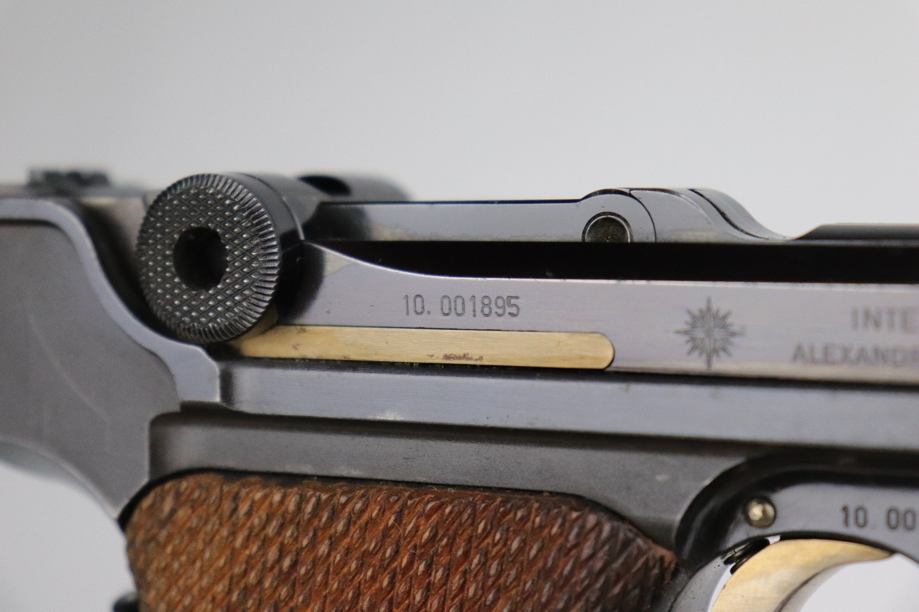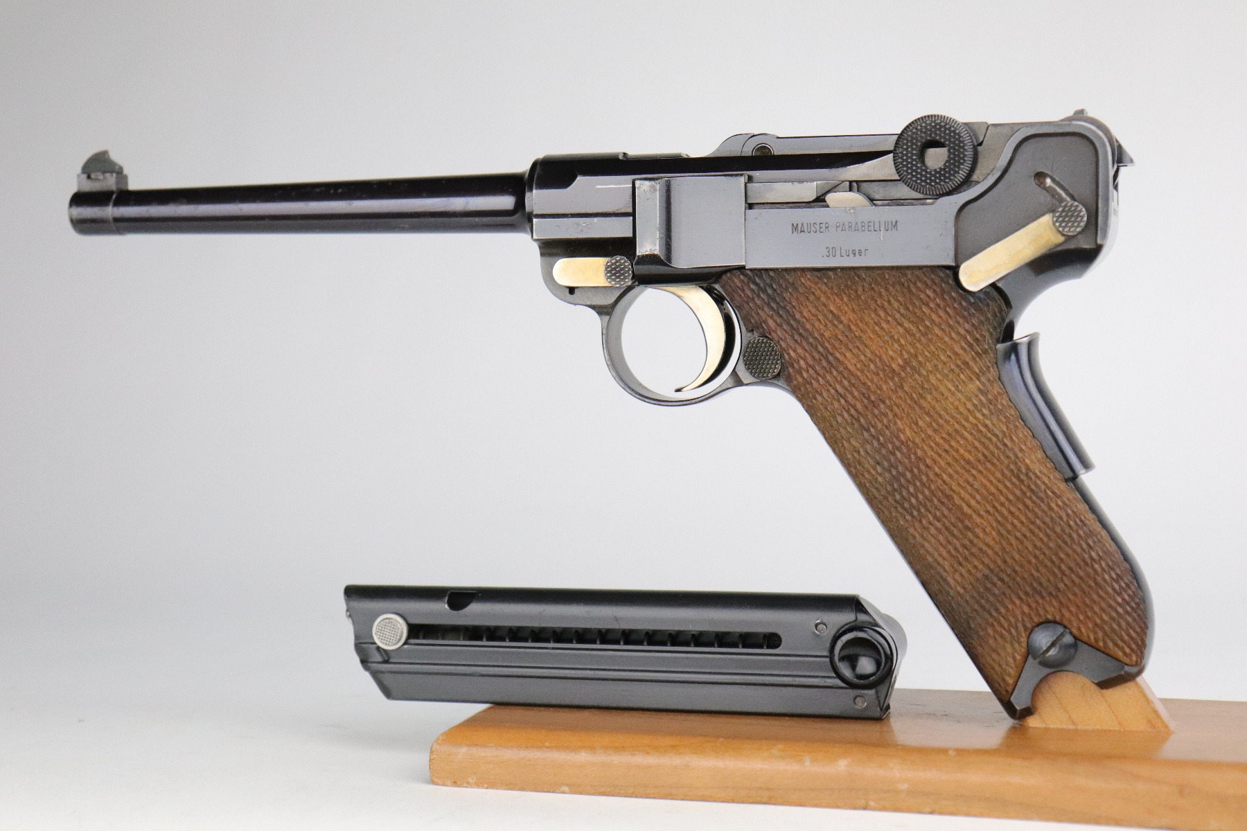 8/21/20 – This is a post-war “American Eagle” Luger, made by Mauser/Interarms of Virginia. It has a Navy-style 5″ barrel, grip safety, and the American Eagle insignia on the chamber. It has retained about 95% of its bluing. Most of the finish loss is very spotty. It is most noticeable throughout the whole barrel, on the front edge of the chamber, and smaller spots on the straps. There are also a few light scratches on the straps. and the left side of the frame. There is more even wear on the side plate. Excellent grips and magazine. The bore is minty.