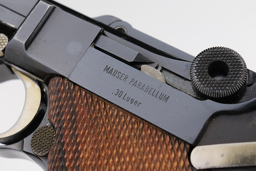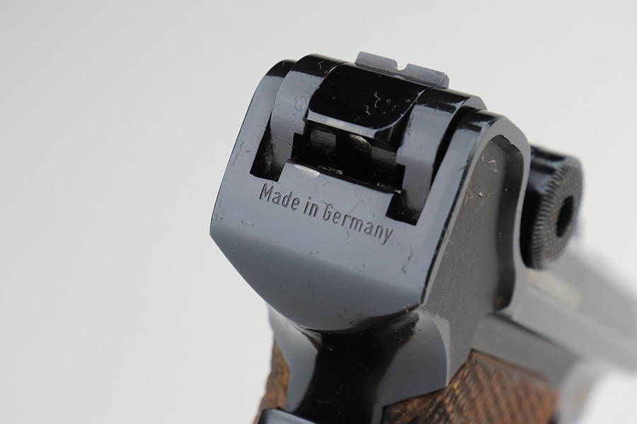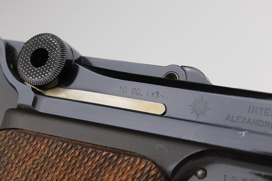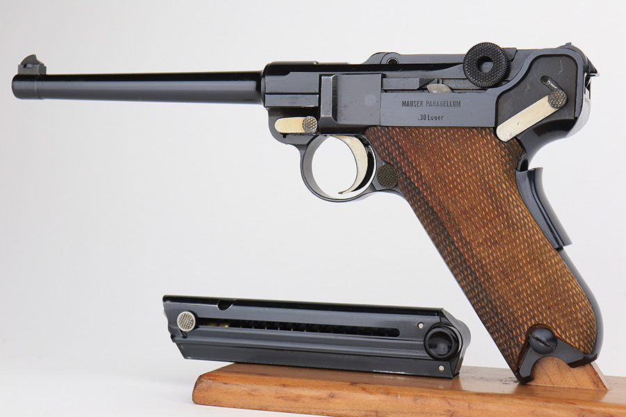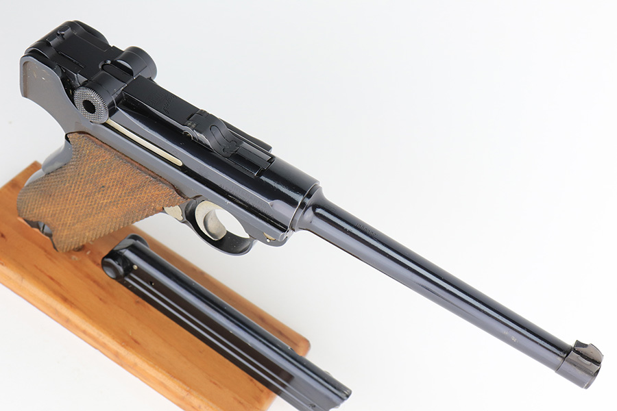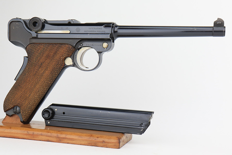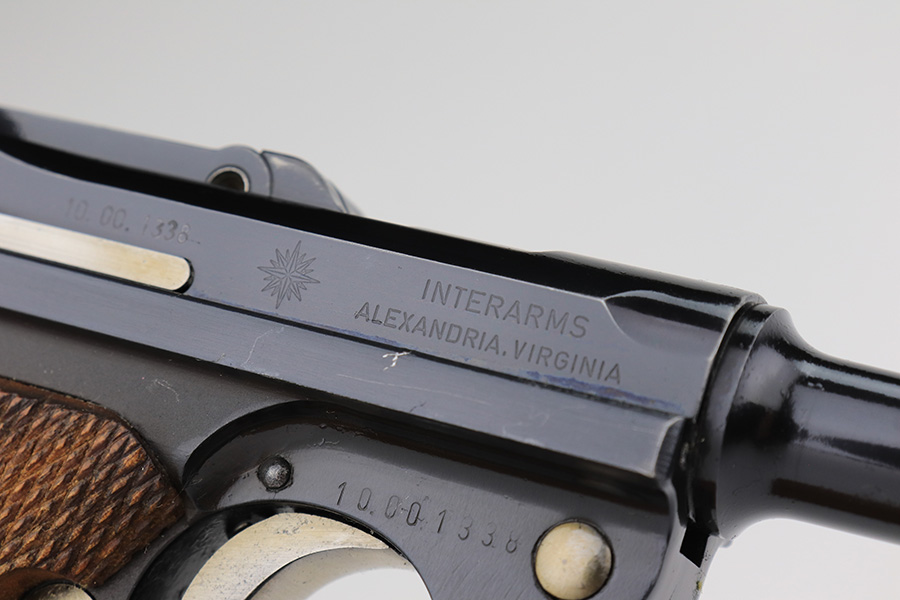 3/2/23 – This is a near-mint example of a Mauser/Interarms Luger manufactured in 1970’s and chambered in .30 Luger. 5″ barrel. It is all matching, has the American Eagle seal on the chamber, and has an Interarms marking on the right side of the slide. The gun has retained virtually all of its finish with just some tiny handling marks here and there and two tiny spots of wear on the right side of the barrel. Fitted with mint wood grips. Comes with one proper magazine. The bore is like-new.