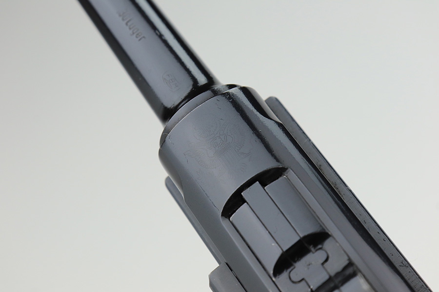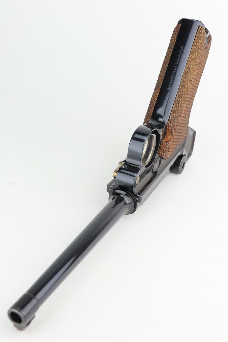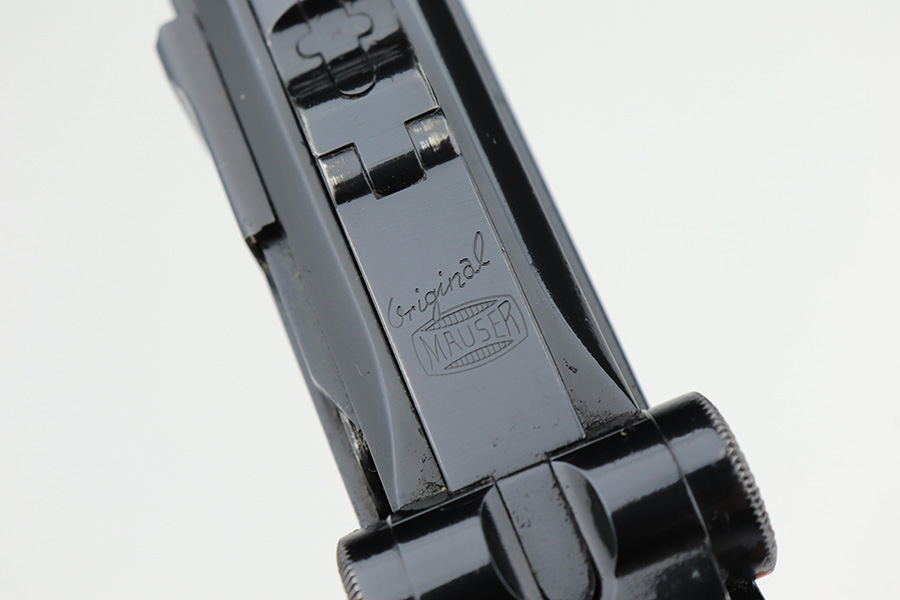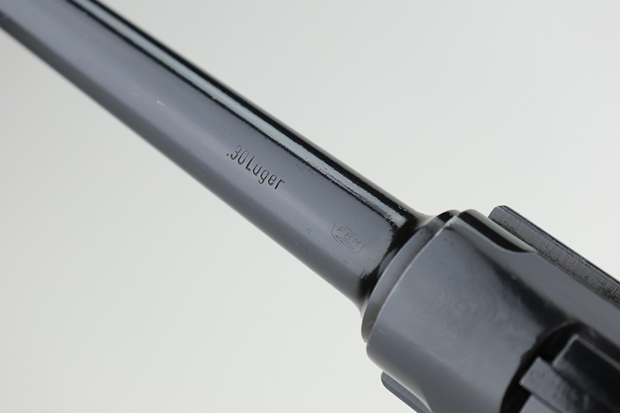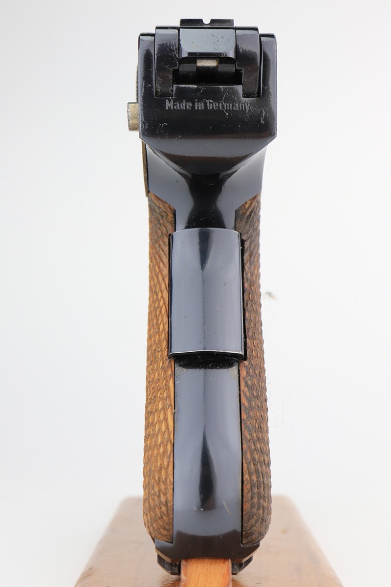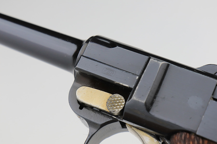 3/2/23 – This is a near-mint example of a Mauser/Interarms Luger manufactured in 1970’s and chambered in .30 Luger. 5″ barrel. It is all matching, has the American Eagle seal on the chamber, and has an Interarms marking on the right side of the slide. The gun has retained virtually all of its finish with just some tiny handling marks here and there and two tiny spots of wear on the right side of the barrel. Fitted with mint wood grips. Comes with one proper magazine. The bore is like-new.