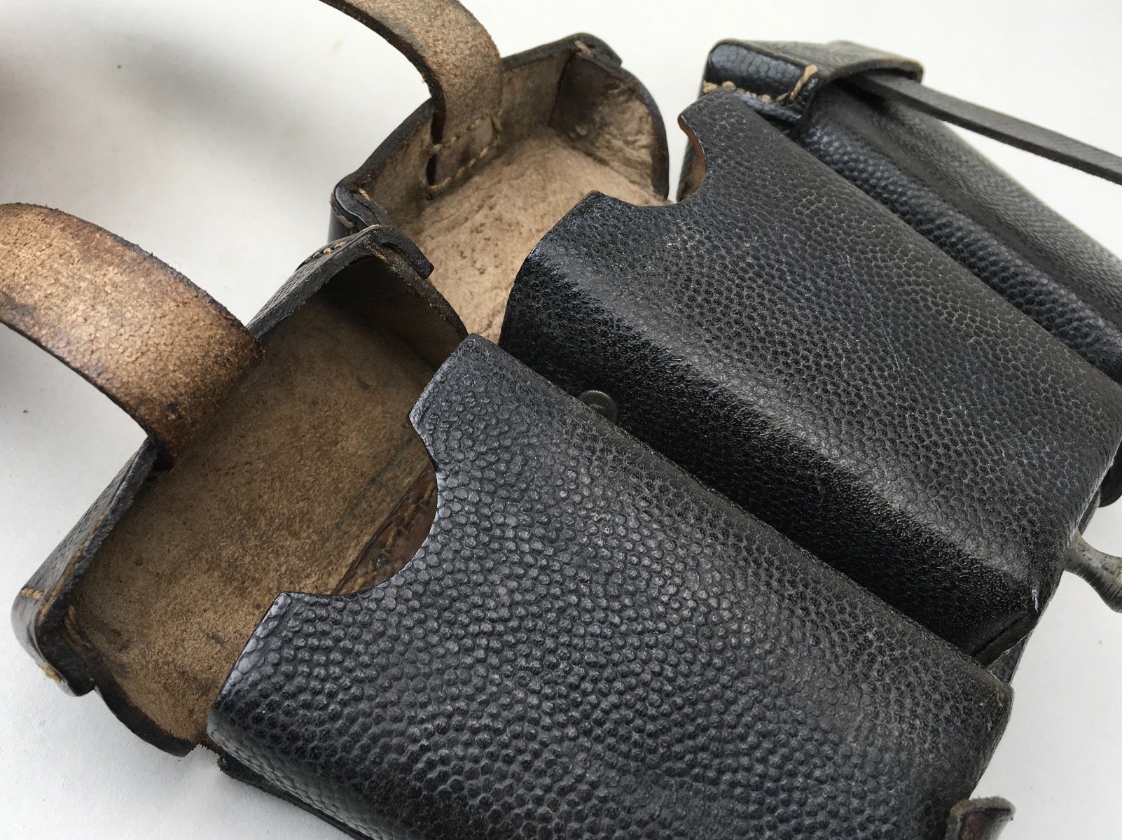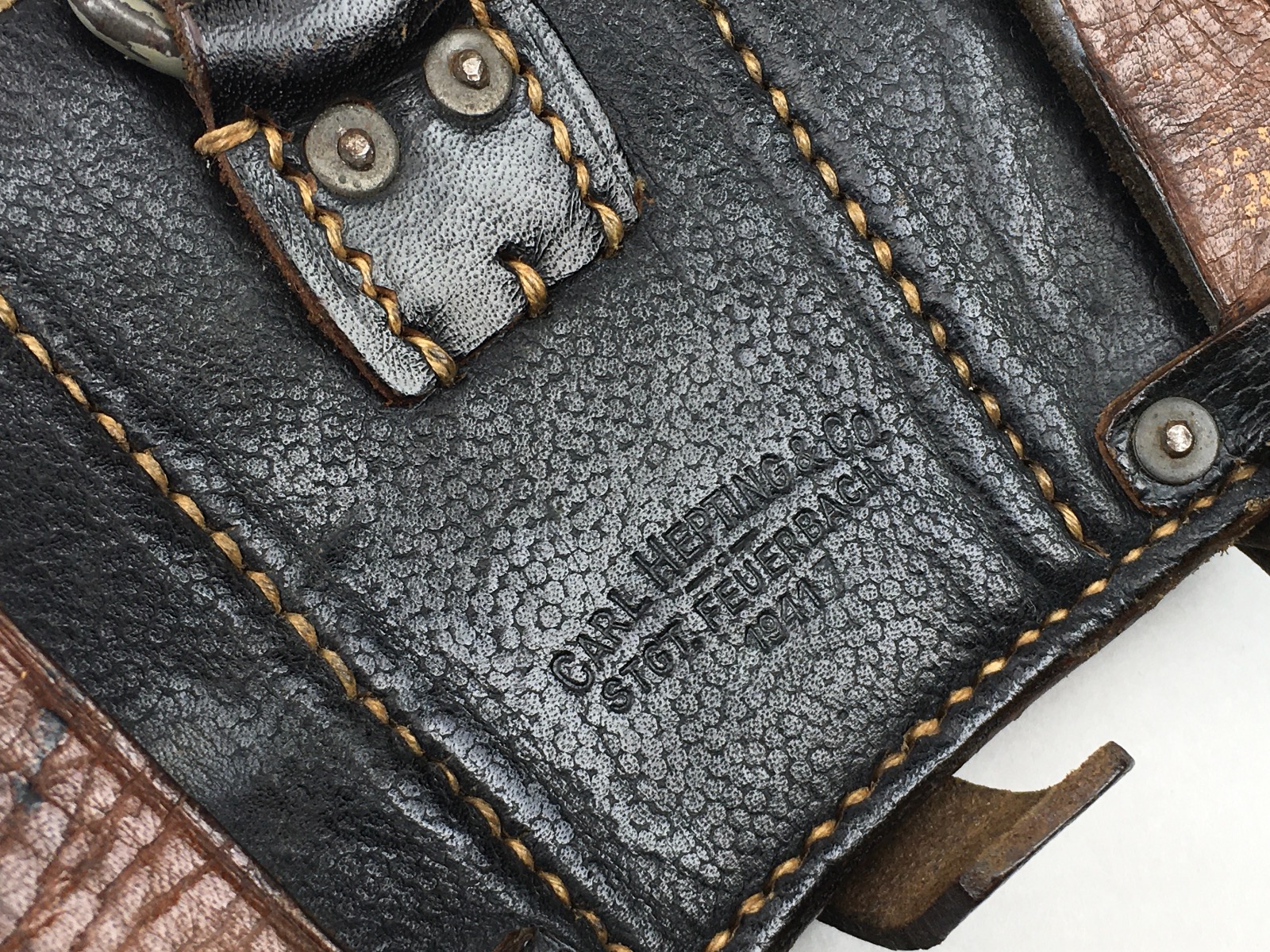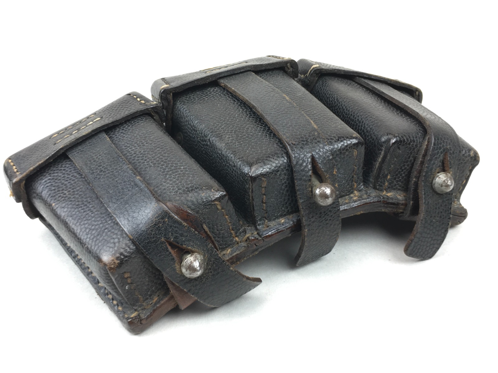11/21/19 – This is an original and excellent K98 leather ammo pouch. Pebble grain leather is clean and in tact. The back of the pouch is maker stamped “Carl Hepting & Co.” and “1941” dated. Stitching and studs are completely secure and intact. Very clean interior with secure dividers. Some use wear around the high edges of the closure flaps. Guaranteed original.