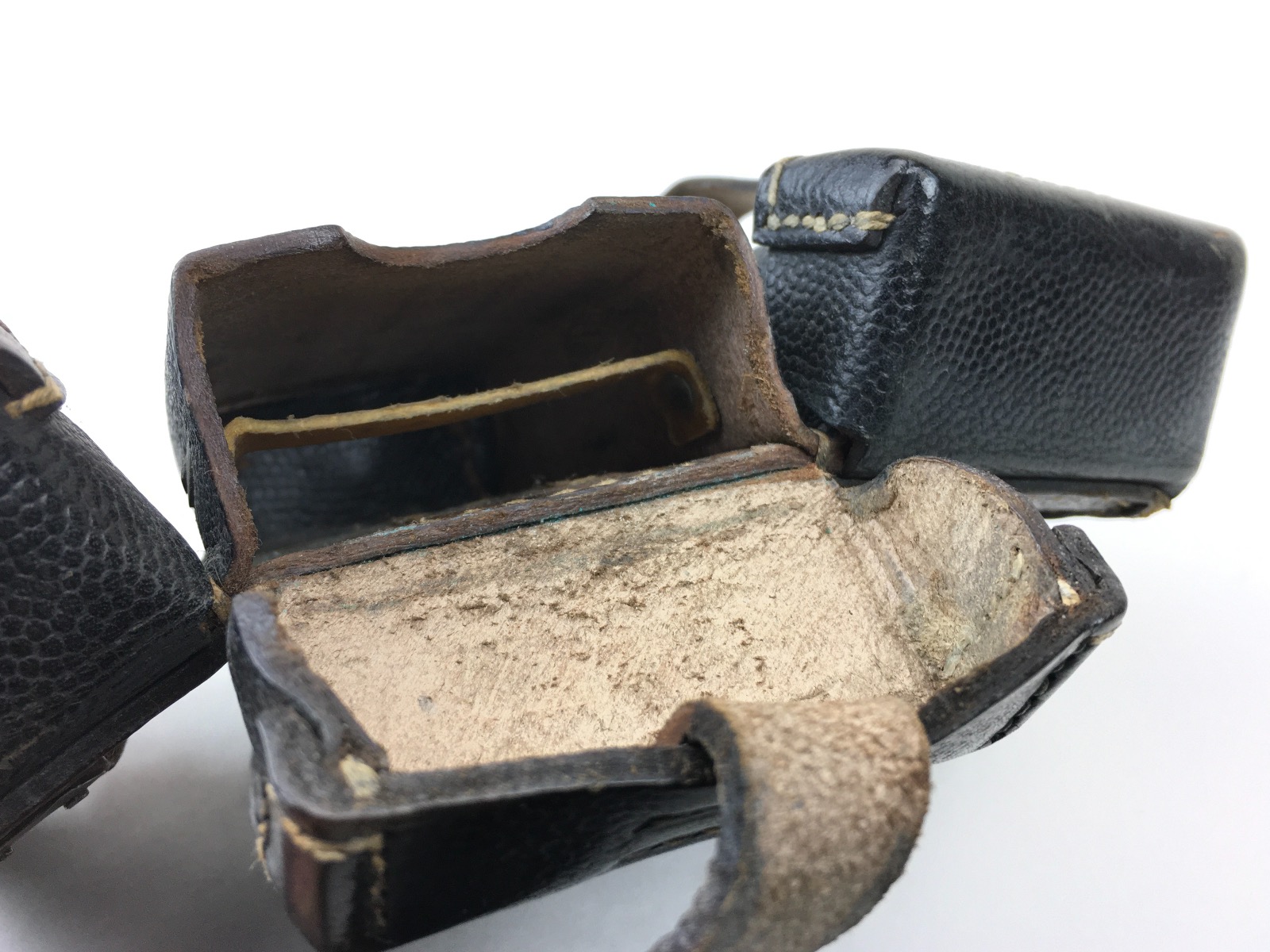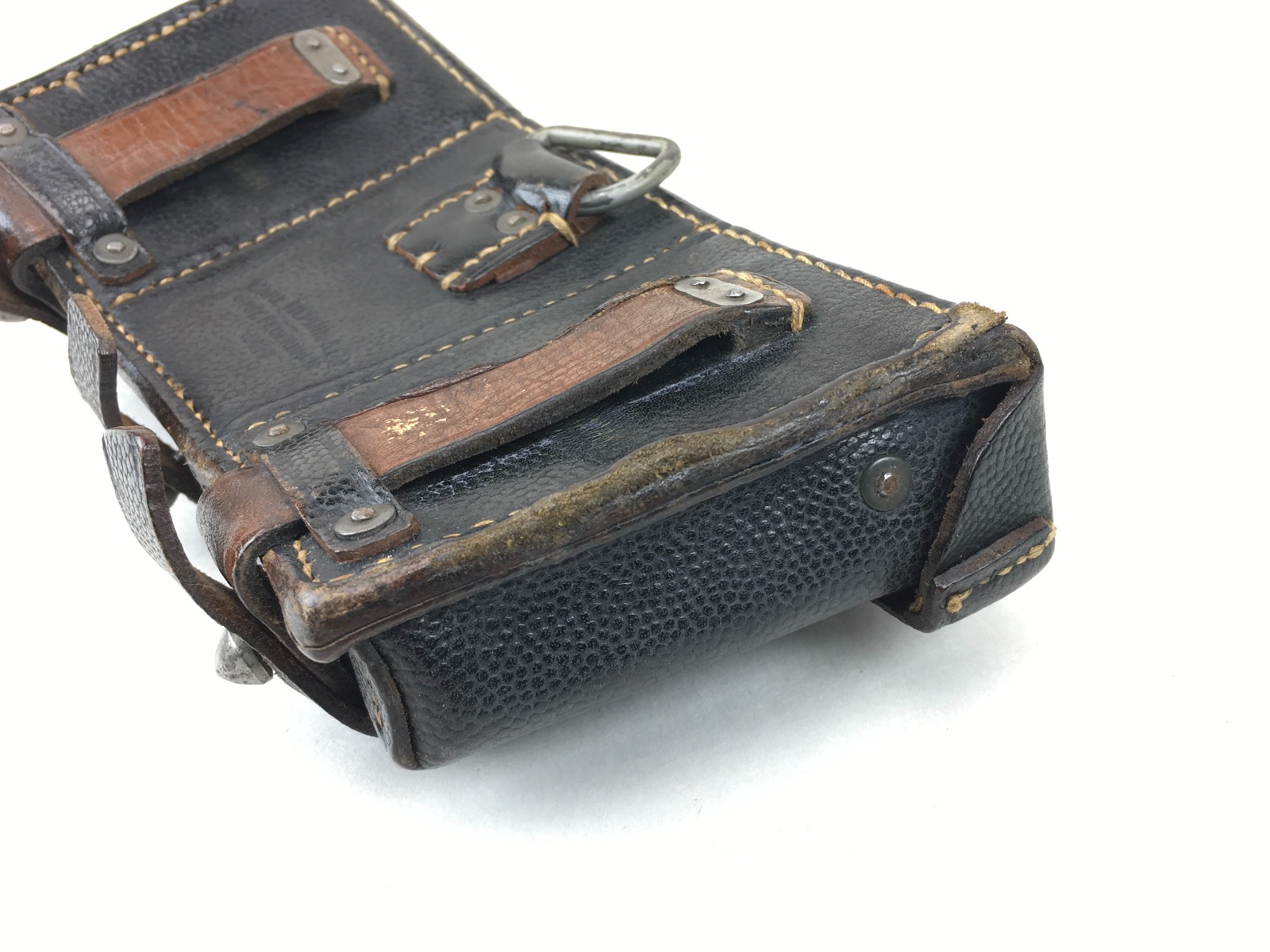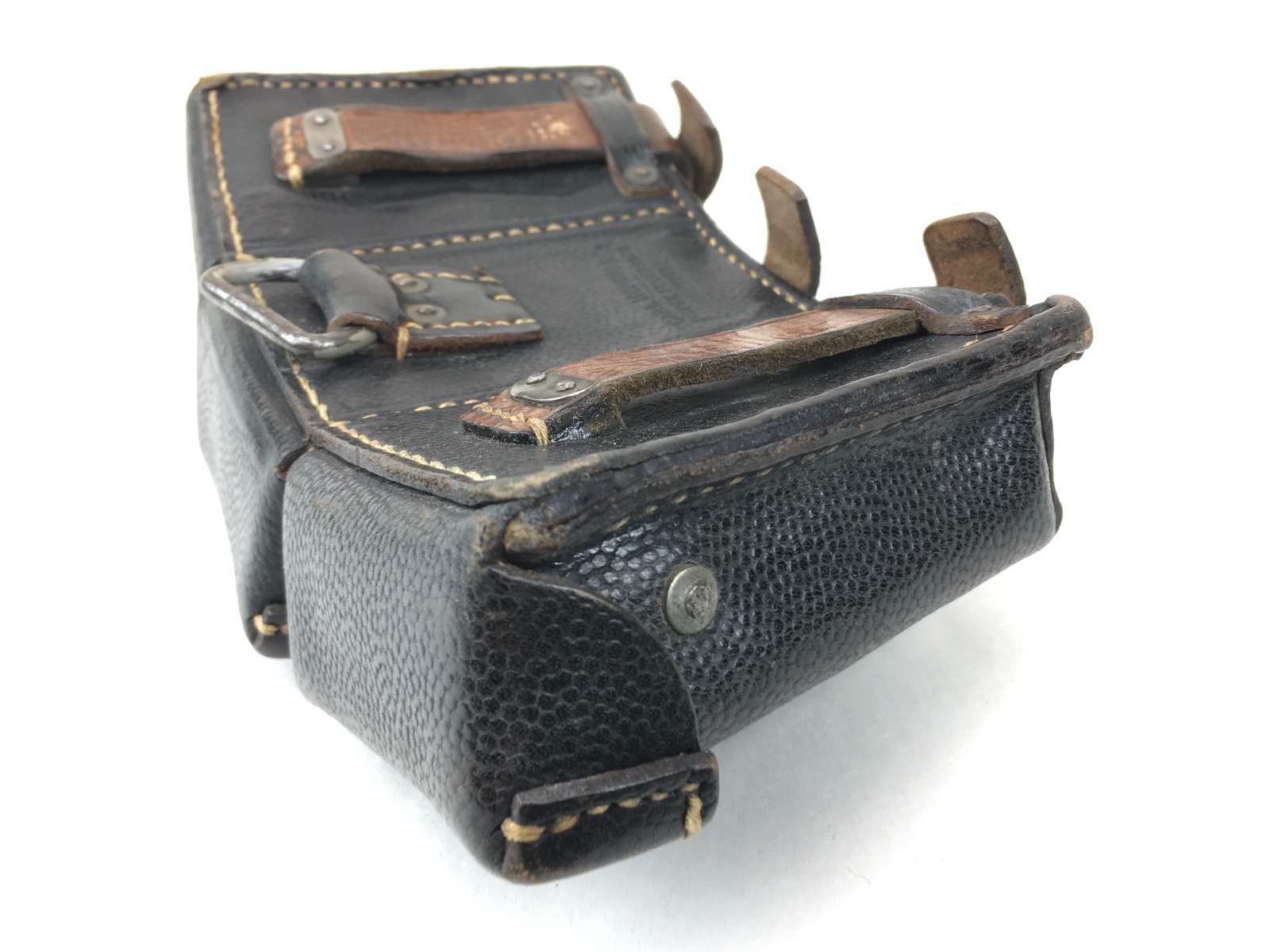 11/21/19 – This is an original and excellent K98 leather ammo pouch. Pebble grain leather is clean and in tact. The back of the pouch is maker stamped “Carl Hepting & Co.” and “1941” dated. Stitching and studs are completely secure and intact. Very clean interior with secure dividers. Some use wear around the high edges of the closure flaps. Guaranteed original.