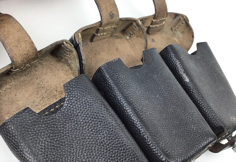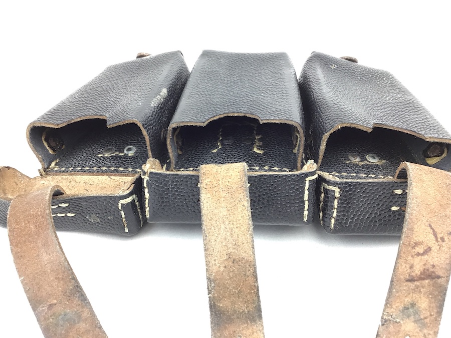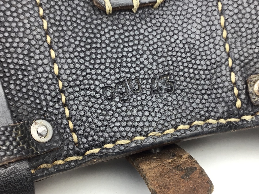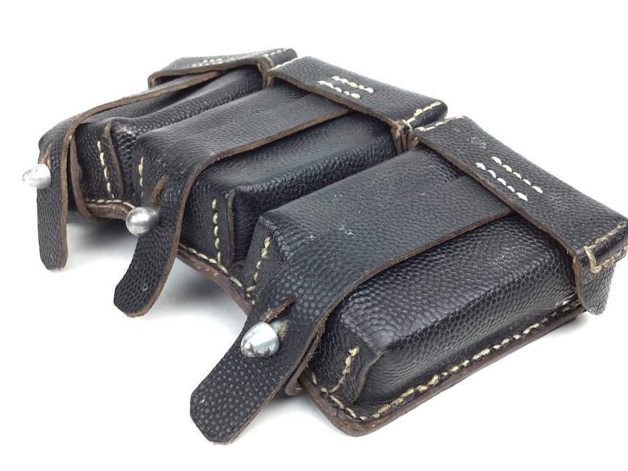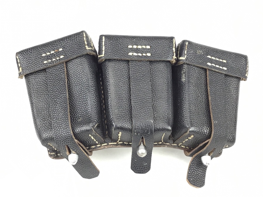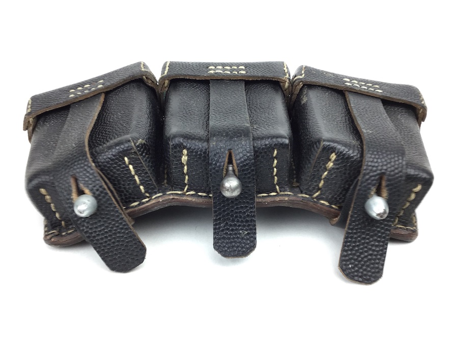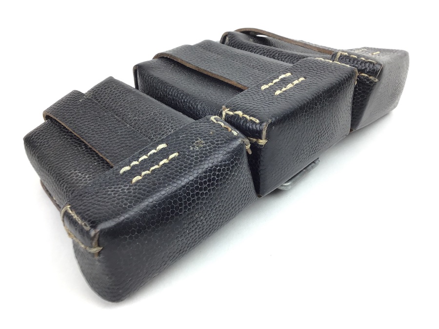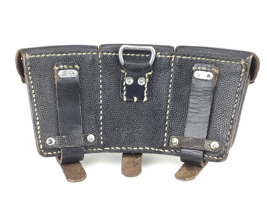 3/30/20 – This is an original and excellent K98 leather ammo pouch. Pebble grain leather is clean and in tact. The back of the pouch is maker stamped “cgu” and “43” dated. Stitching and studs are completely secure and intact. Very clean interior. Some use wear around the high edges of the closure flaps. Guaranteed original.