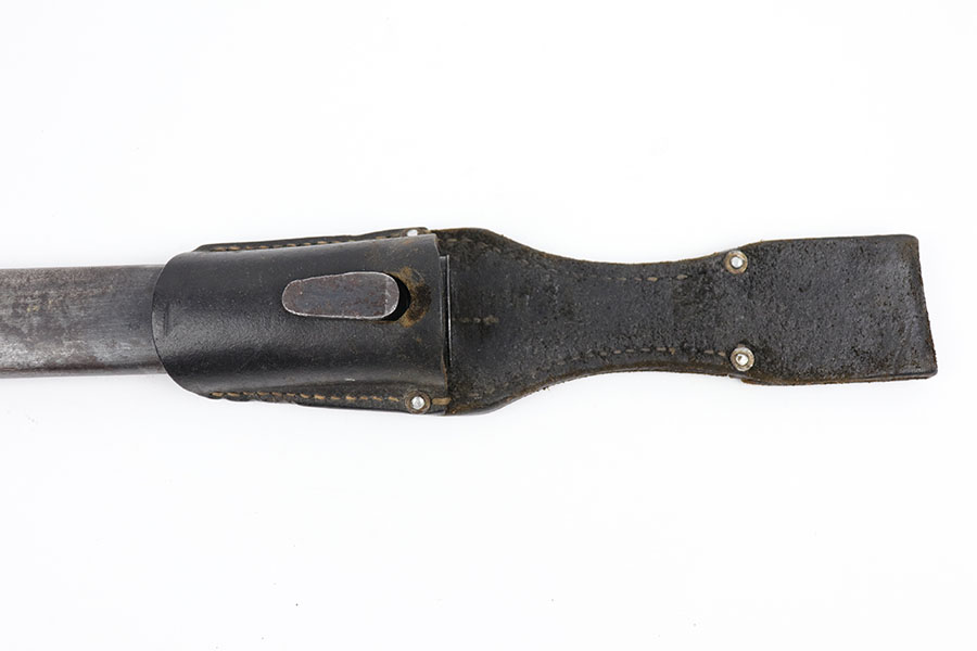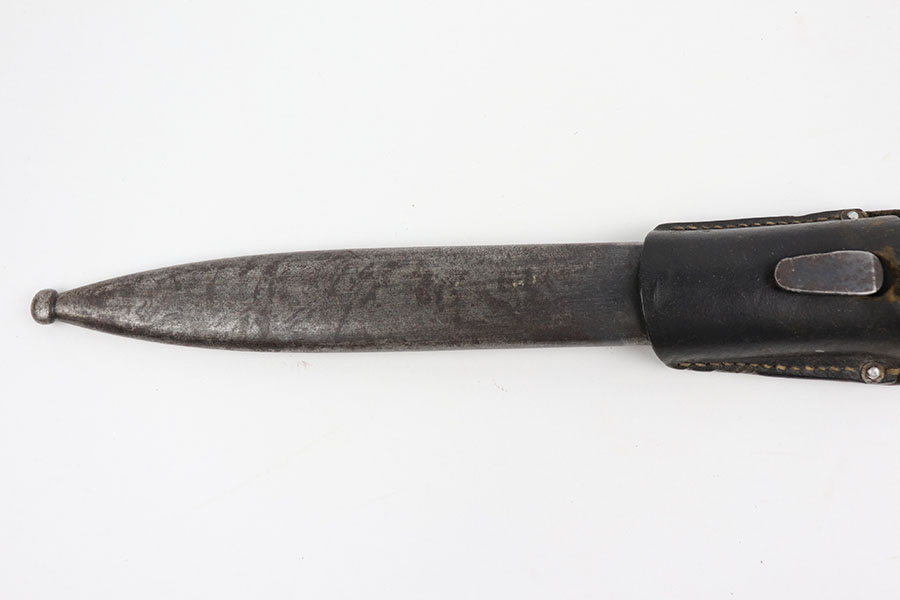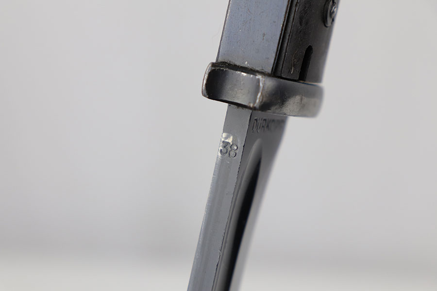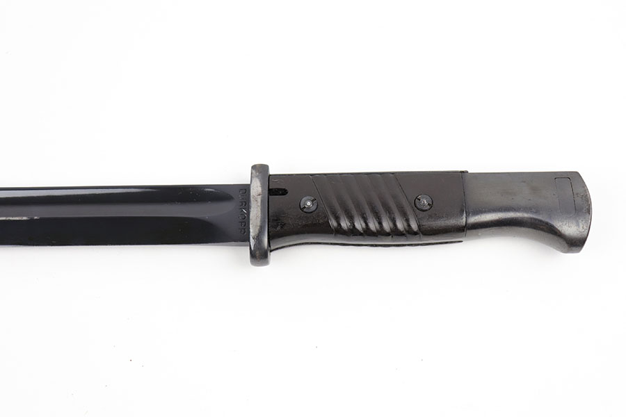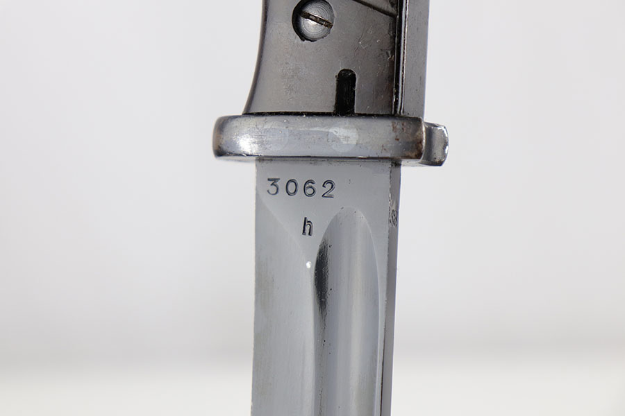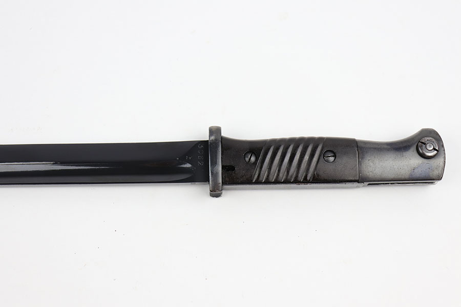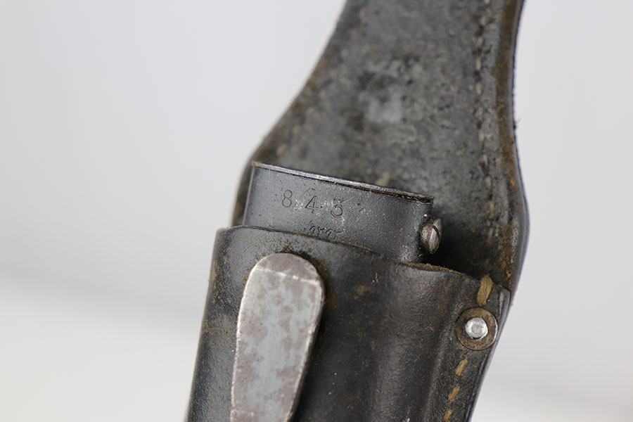 9/30/19 – This is an original WW2 era K98 rifle bayonet with an original scabbard and leather frog. The bayonet blade is maker stamped and serial numbered with excellent original finish throughout. The blade shows no signs of sharpening. The scabbard is also serial numbered but not matching to the blade. The scabbard has bluing loss and dark patina / discoloration as shown in photos. No dents on the scabbard though. The handle of the blade is similar to the condition of the blade itself – excellent. The leather frog is unmarked. All original and authentic from WW2.
