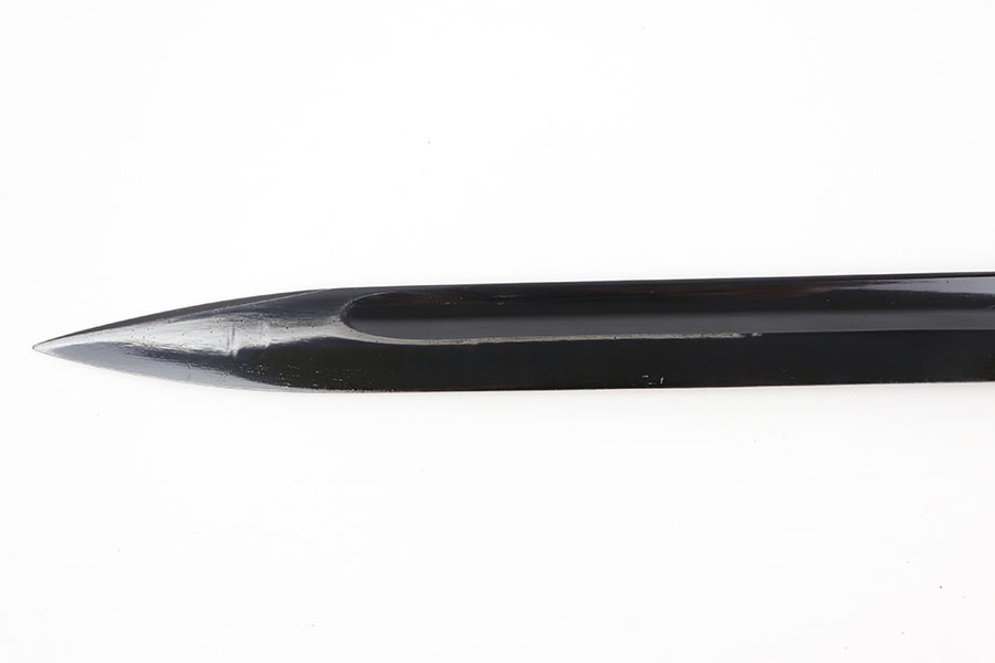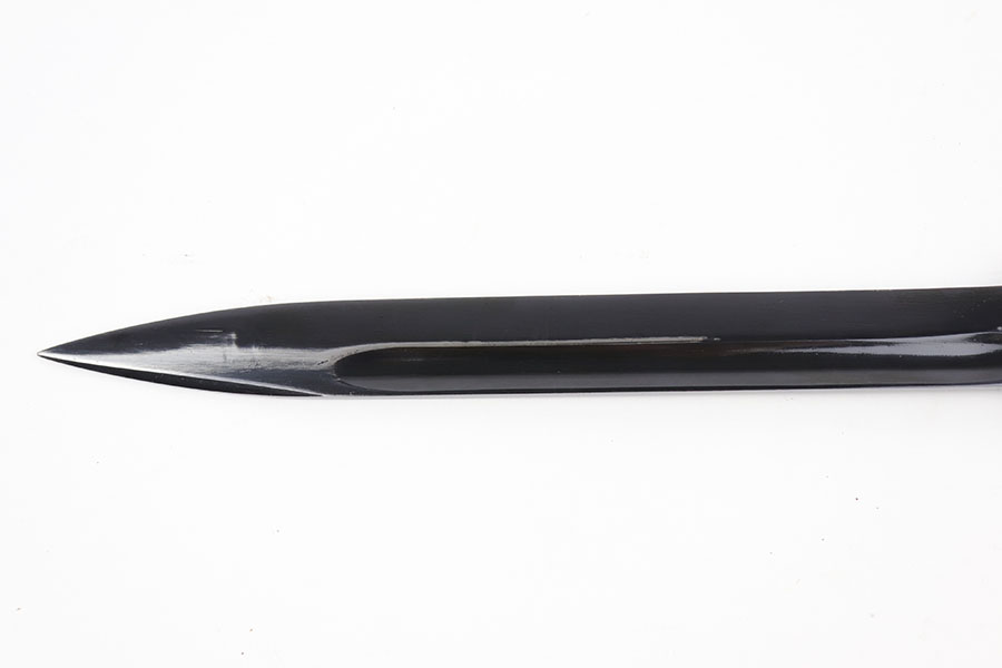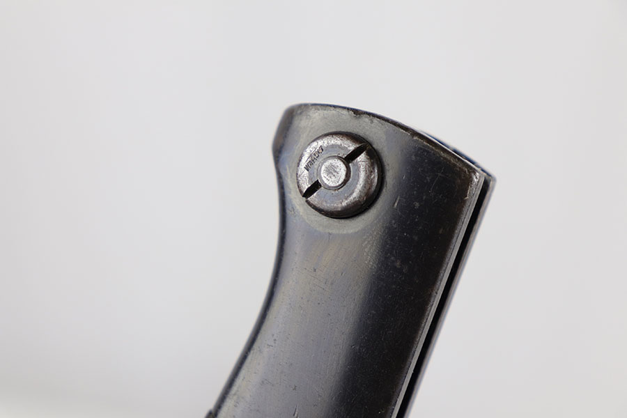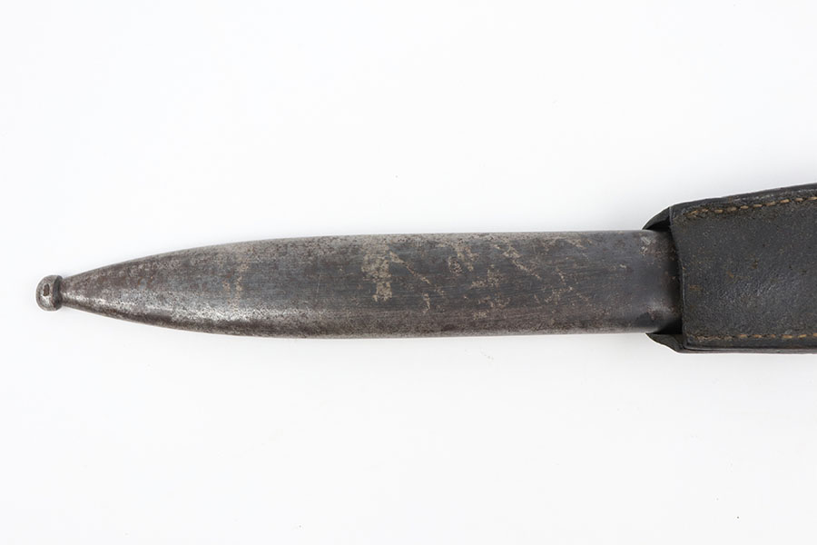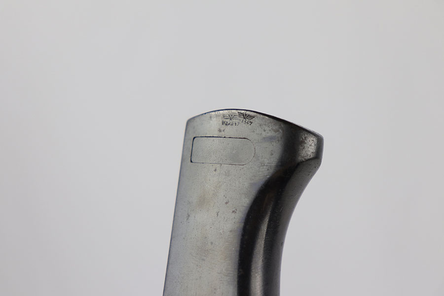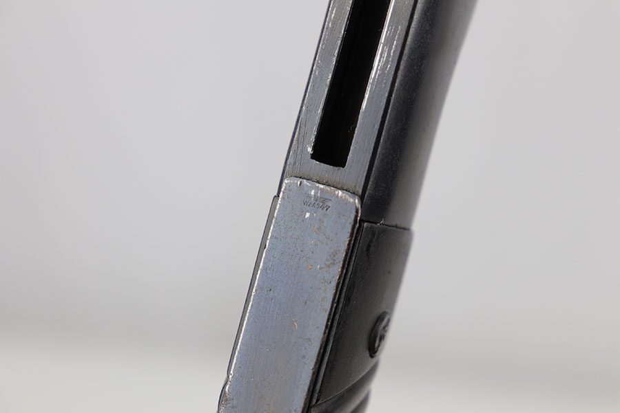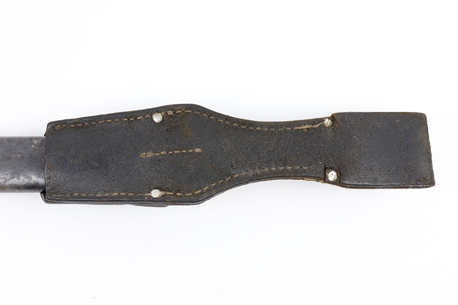 9/30/19 – This is an original WW2 era K98 rifle bayonet with an original scabbard and leather frog. The bayonet blade is maker stamped and serial numbered with excellent original finish throughout. The blade shows no signs of sharpening. The scabbard is also serial numbered but not matching to the blade. The scabbard has bluing loss and dark patina / discoloration as shown in photos. No dents on the scabbard though. The handle of the blade is similar to the condition of the blade itself – excellent. The leather frog is unmarked. All original and authentic from WW2.