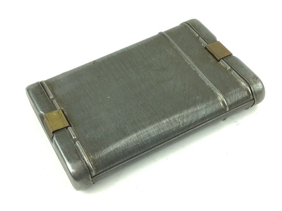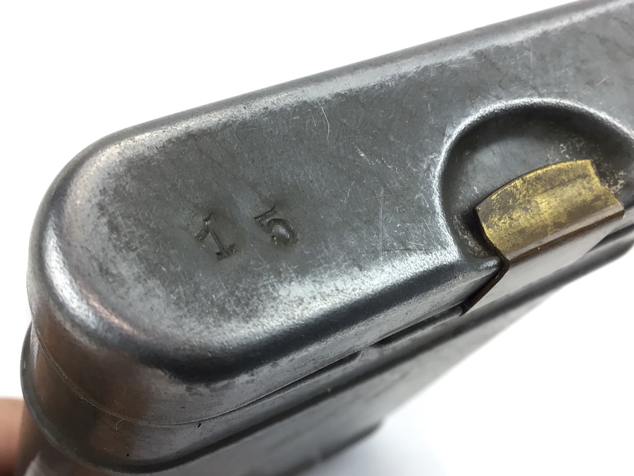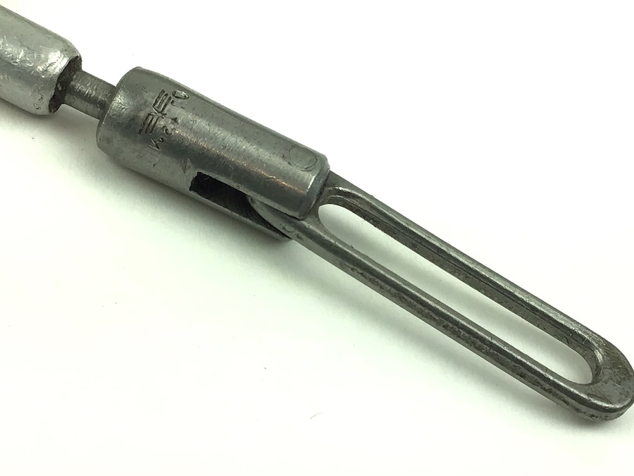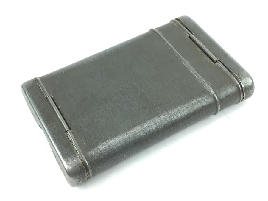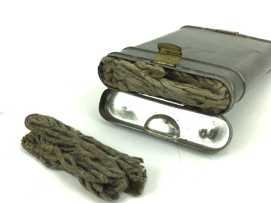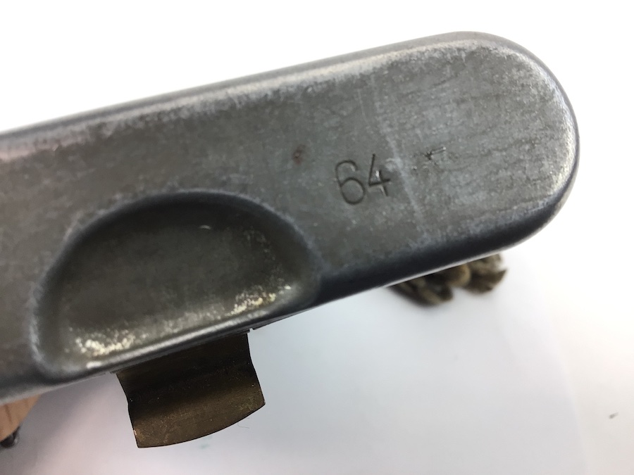 8/10/21 – Original and excellent condition cleaning kit for the Mauser K98 8mm rifle. Matching number “64” on lid, chain pull thru, and tool. The pull through chain is also waffen stamped, however, the numbers are not quite readable. The tin has typical paint loss. The lids and clasps function properly. One lid is also stamped with the number “15” Nice kit.
