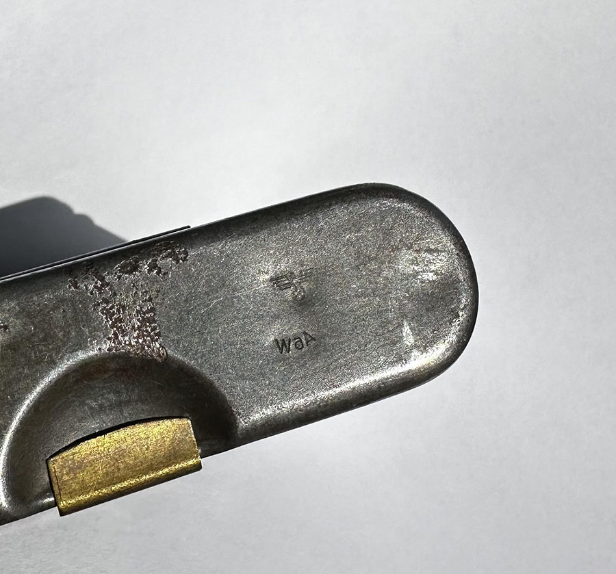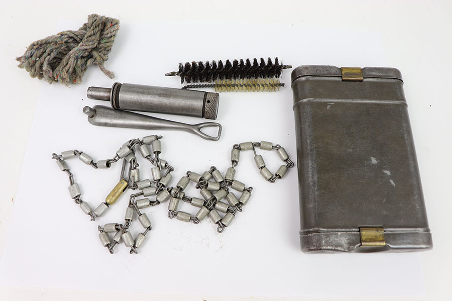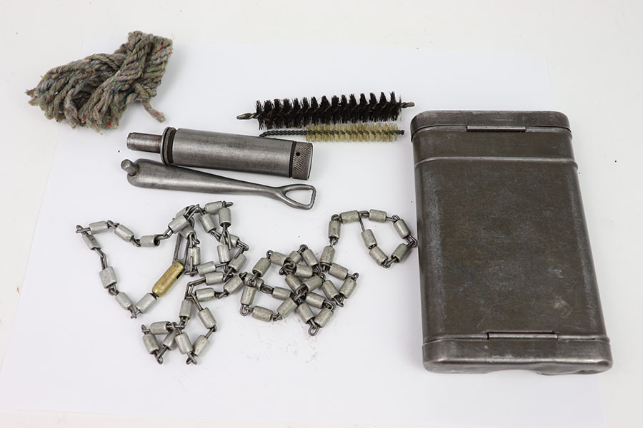 4/11/24 – Original and excellent condition cleaning kit for the Mauser K98 8mm rifle. The tin has typical paint loss. One lid has some oxidation and the other has some dents. The lids and clasps function properly. One lid is stamped with a military eagle and WaA which both appear to be faked as they differ from other examples. The internal cleaning supplies are in excellent condition