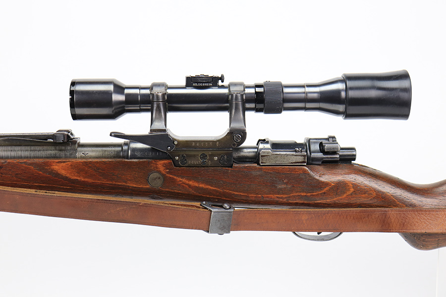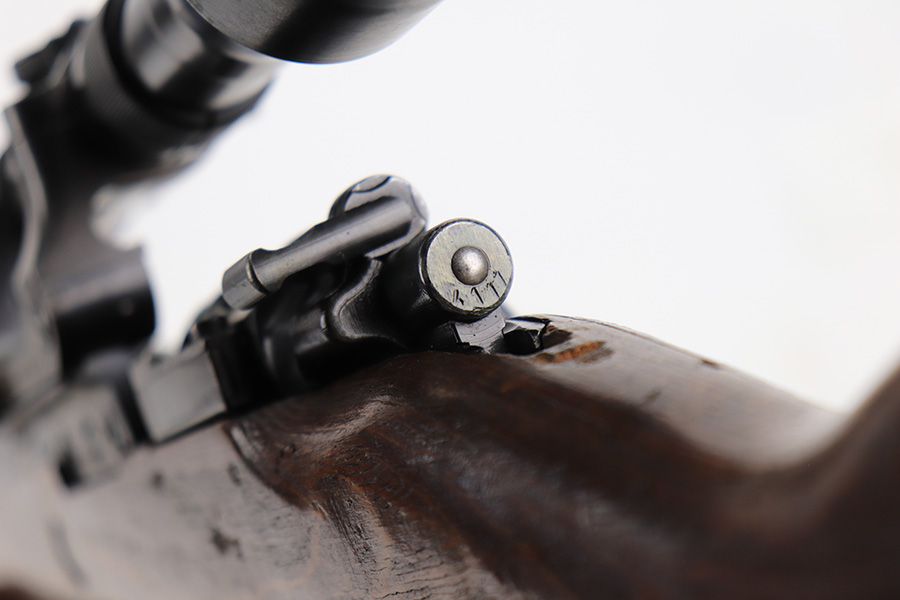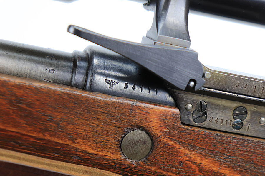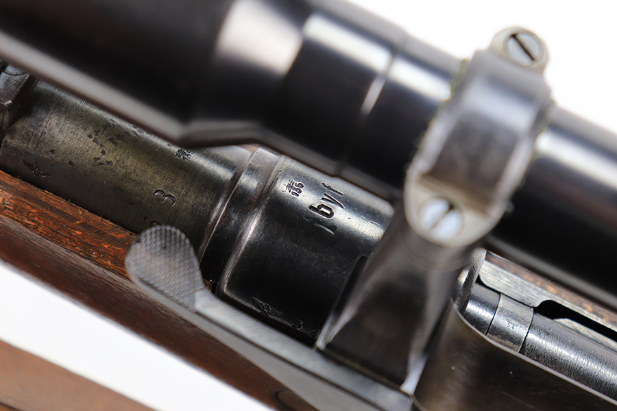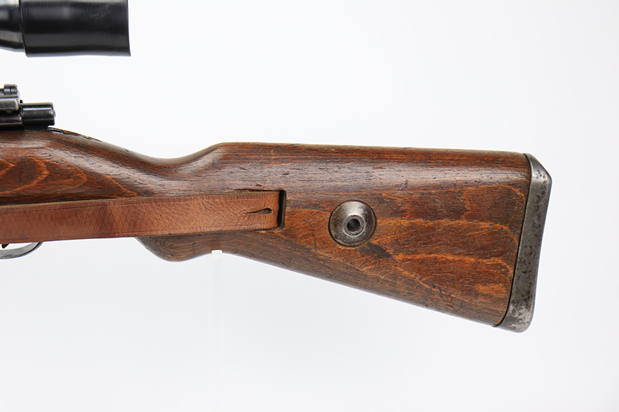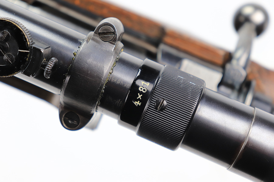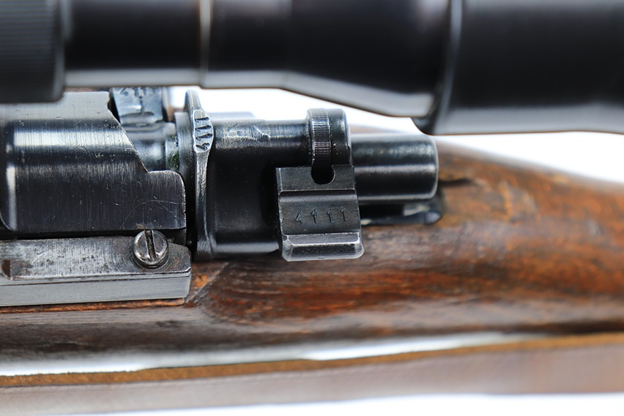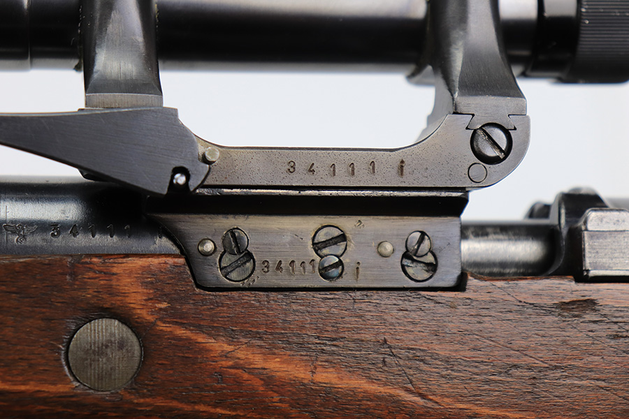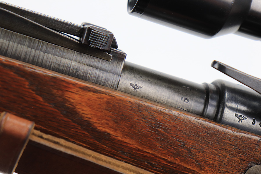 8/17/23 – This is an interesting Mauser K98 from 1943 that was built into a short side rail sniper. The original rifle has all matching numbers, including the stock. The mounts are postwar are force matched to the rifle. The scope is a postwar commercial 4×81 example that is marked Hildesheim Rudiger and has clear optics. The finish on the rifle is mostly original, though the bands may be refinished. It shows general thinning on the barrel and receiver, and obvious wear/oxidation on the buttplate. The stock has the Mauser inspection stamp and no cracks. Excellent bore. The rifle comes with sight hood, cleaning rod and leather sling.