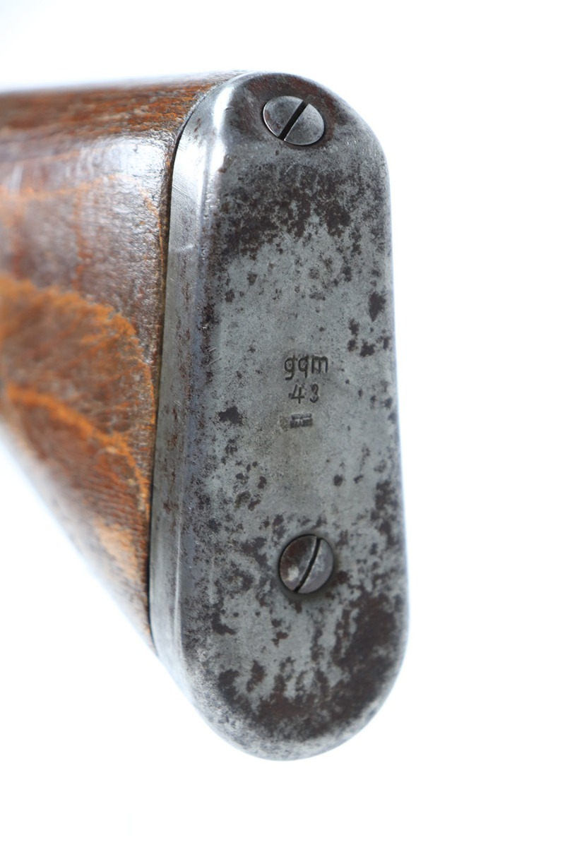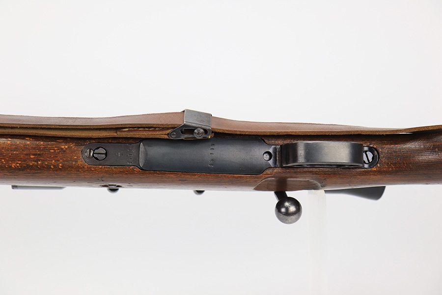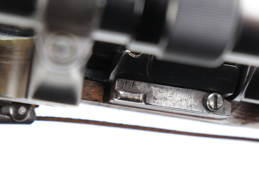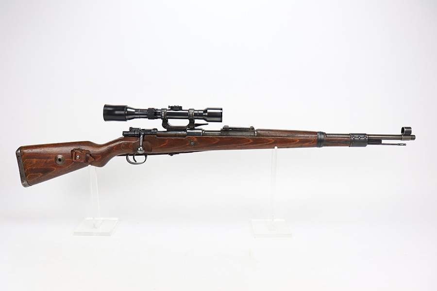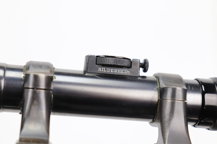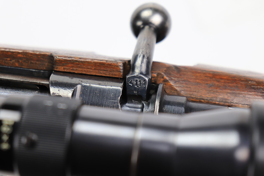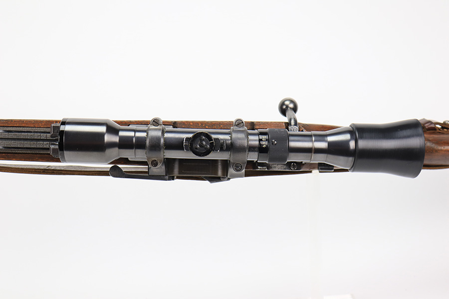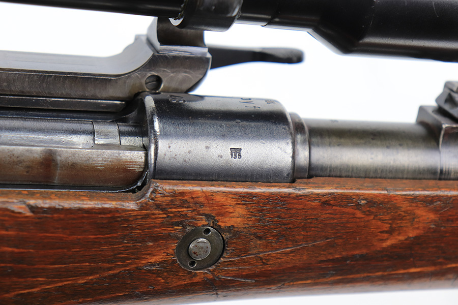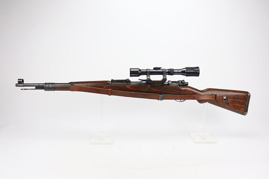 8/17/23 – This is an interesting Mauser K98 from 1943 that was built into a short side rail sniper. The original rifle has all matching numbers, including the stock. The mounts are postwar are force matched to the rifle. The scope is a postwar commercial 4×81 example that is marked Hildesheim Rudiger and has clear optics. The finish on the rifle is mostly original, though the bands may be refinished. It shows general thinning on the barrel and receiver, and obvious wear/oxidation on the buttplate. The stock has the Mauser inspection stamp and no cracks. Excellent bore. The rifle comes with sight hood, cleaning rod and leather sling.