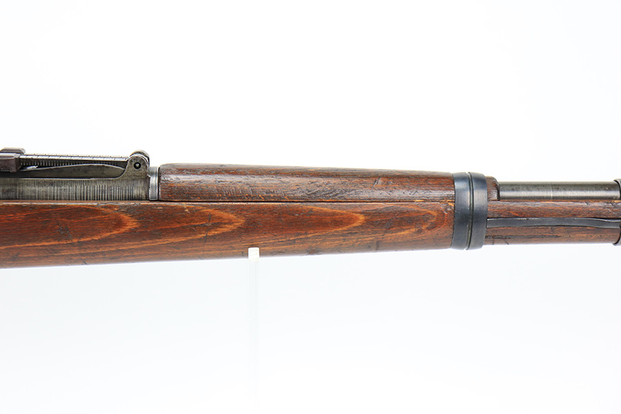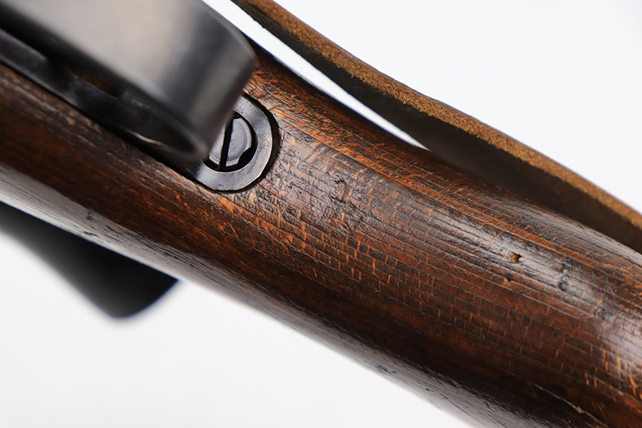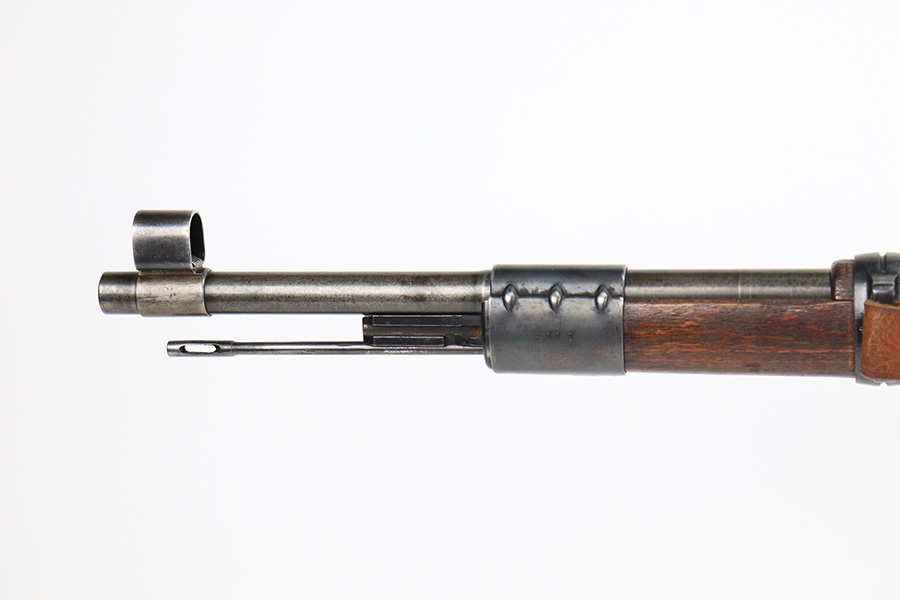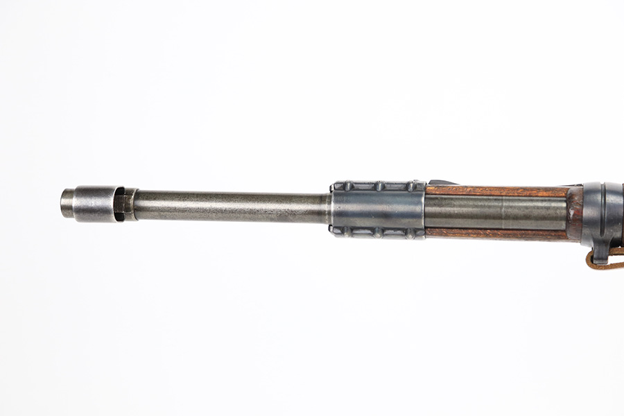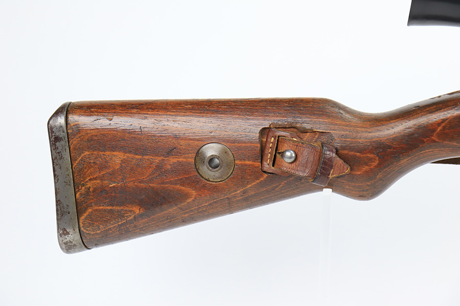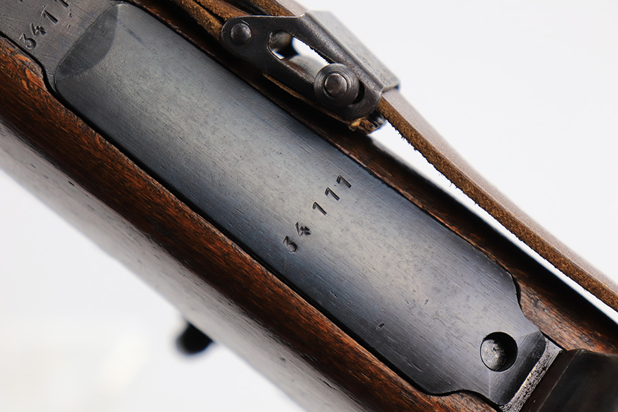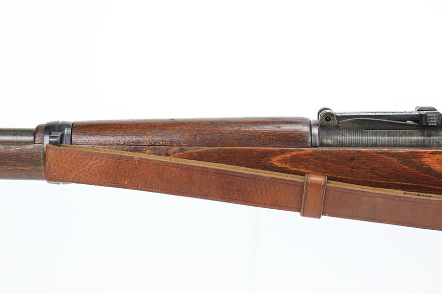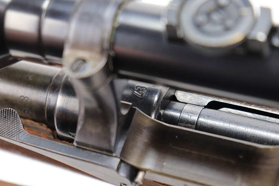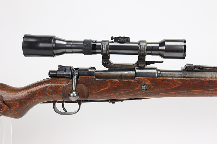 8/17/23 – This is an interesting Mauser K98 from 1943 that was built into a short side rail sniper. The original rifle has all matching numbers, including the stock. The mounts are postwar are force matched to the rifle. The scope is a postwar commercial 4×81 example that is marked Hildesheim Rudiger and has clear optics. The finish on the rifle is mostly original, though the bands may be refinished. It shows general thinning on the barrel and receiver, and obvious wear/oxidation on the buttplate. The stock has the Mauser inspection stamp and no cracks. Excellent bore. The rifle comes with sight hood, cleaning rod and leather sling.
