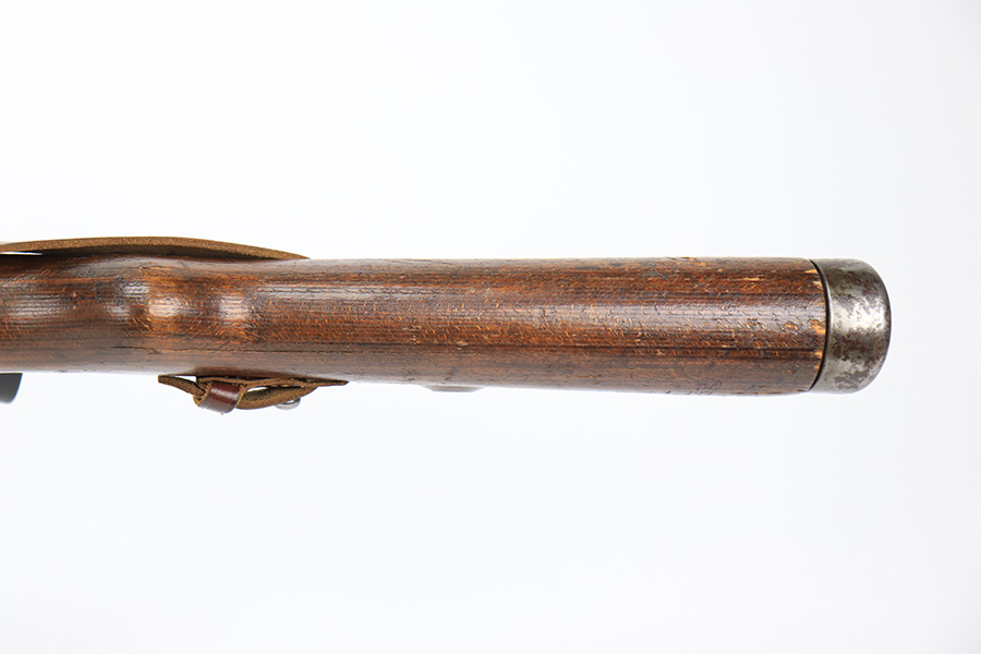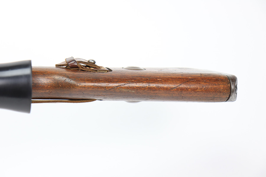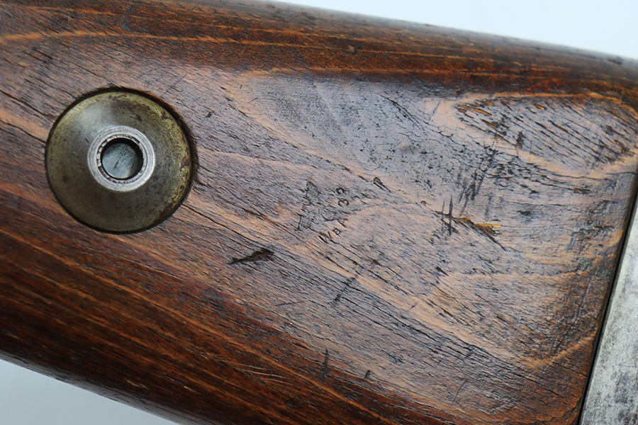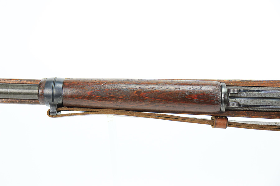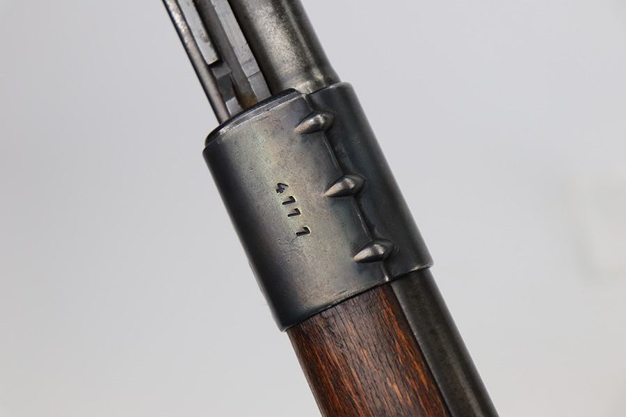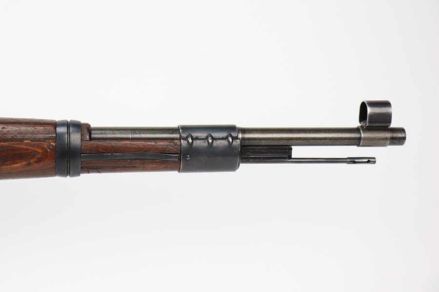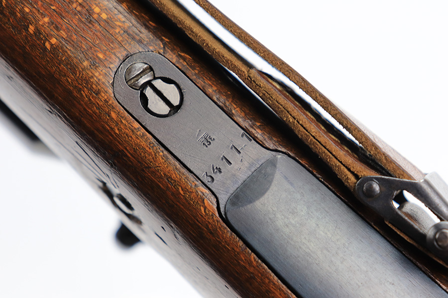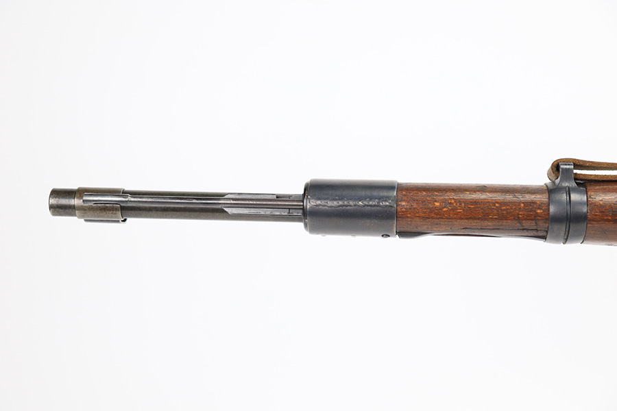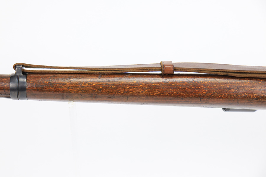 8/17/23 – This is an interesting Mauser K98 from 1943 that was built into a short side rail sniper. The original rifle has all matching numbers, including the stock. The mounts are postwar are force matched to the rifle. The scope is a postwar commercial 4×81 example that is marked Hildesheim Rudiger and has clear optics. The finish on the rifle is mostly original, though the bands may be refinished. It shows general thinning on the barrel and receiver, and obvious wear/oxidation on the buttplate. The stock has the Mauser inspection stamp and no cracks. Excellent bore. The rifle comes with sight hood, cleaning rod and leather sling.