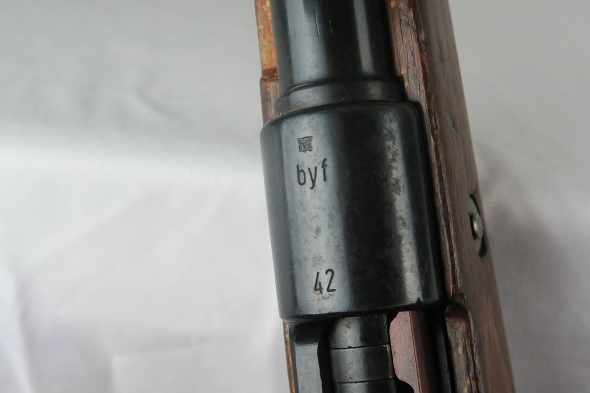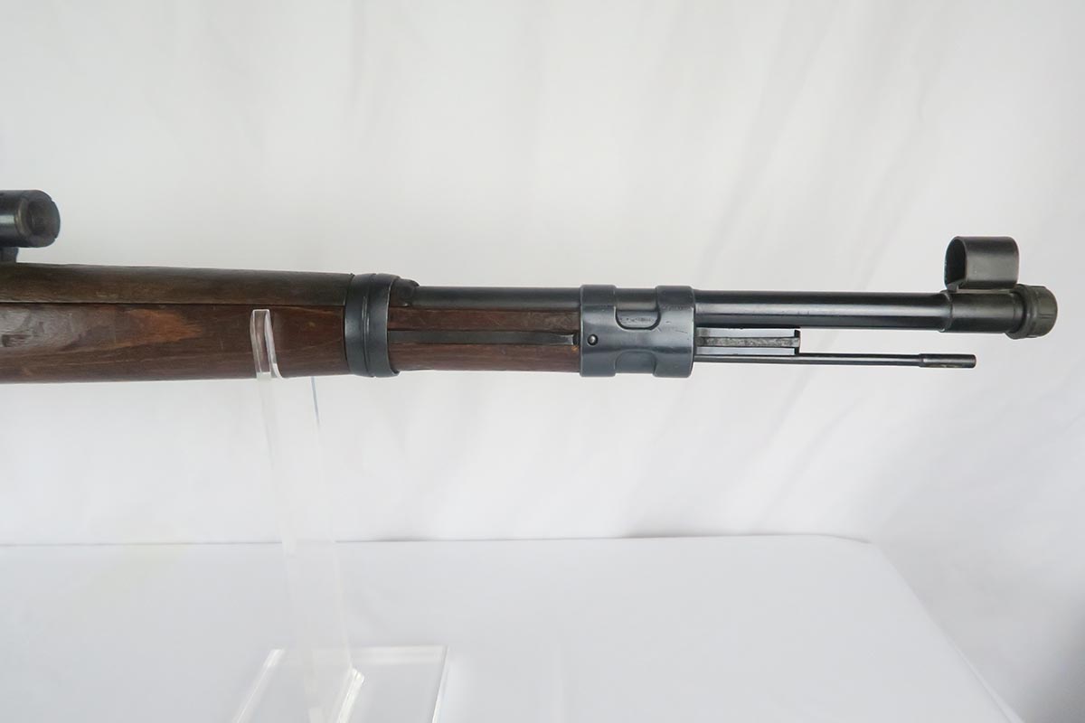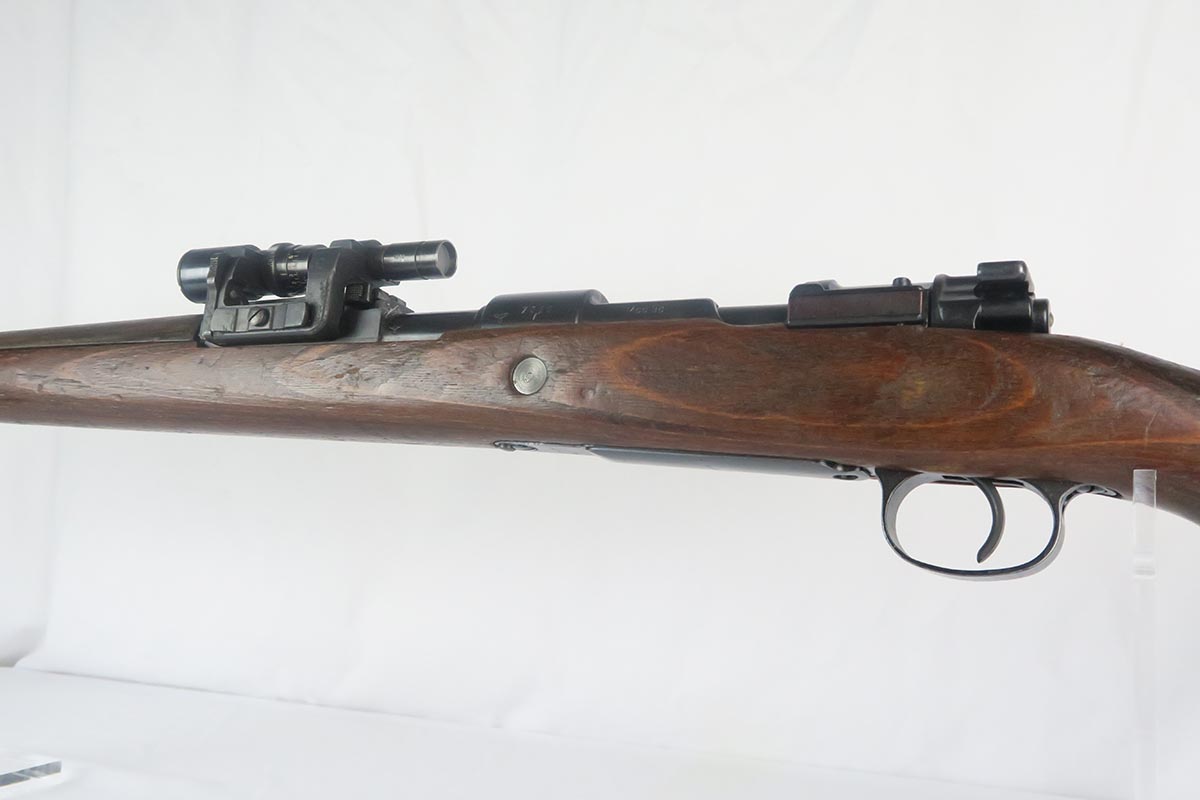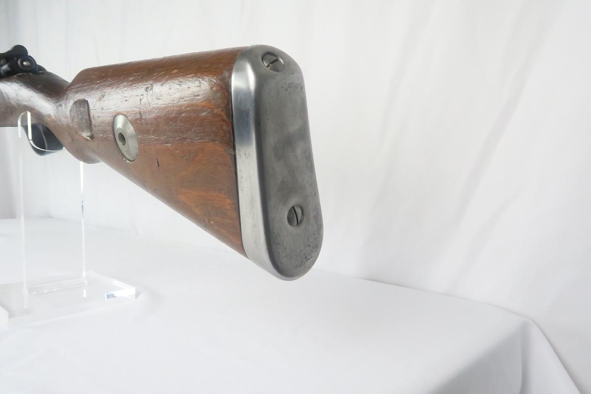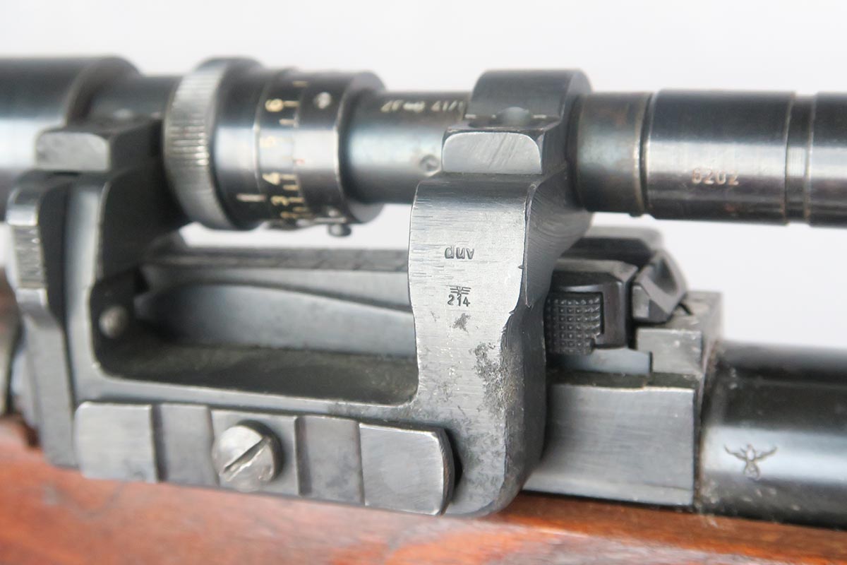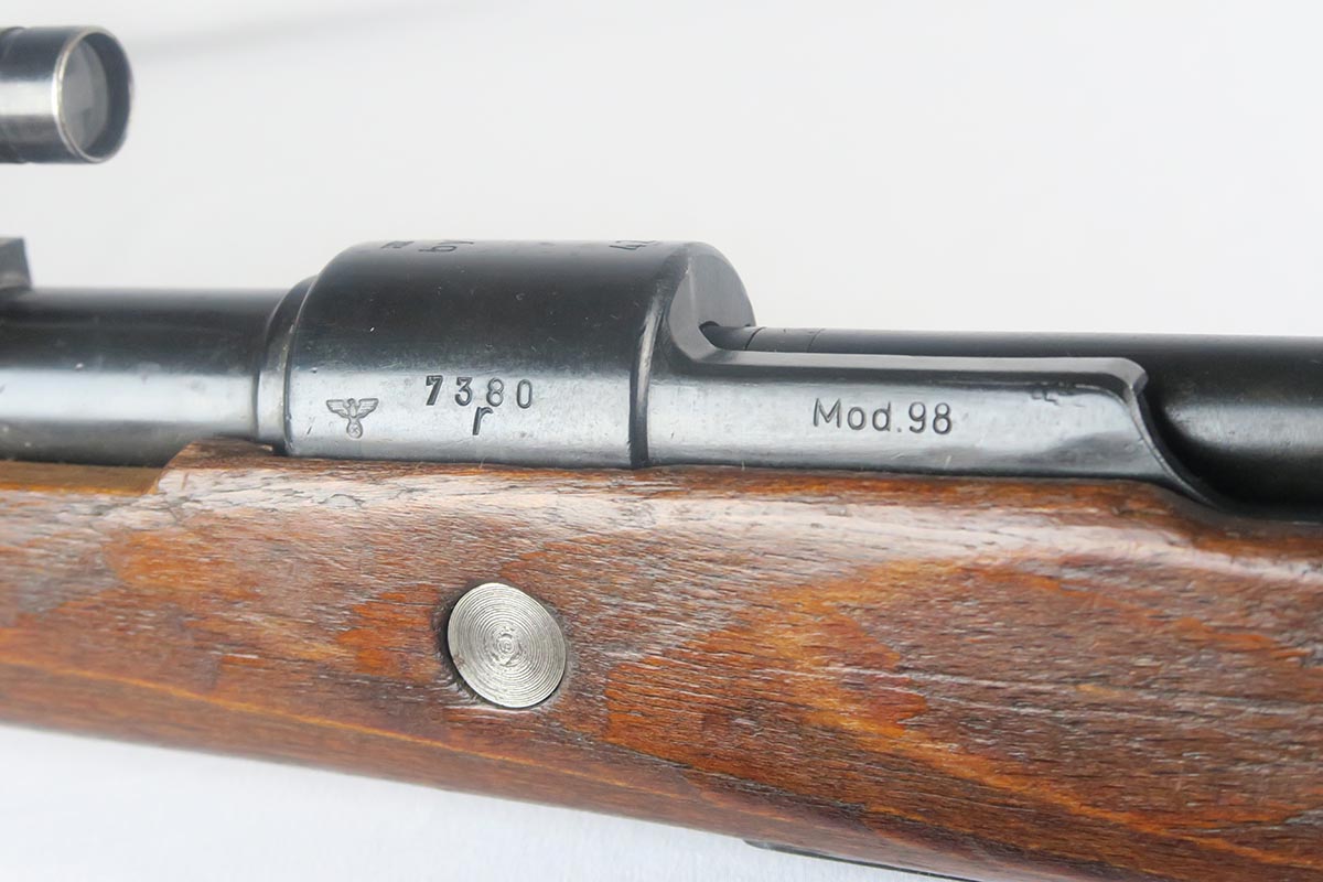 1/19/18 – This is a hard-to-find Mauser K98 sniper rifle from 1942 with original ZF scope. The rifle is in good condition with mostly matching numbers, and includes a sight hood, muzzle cover and cleaning rod. There is some evidence of renumbering on this rifle, thus the lower list price, and the magazine follower is mismatched. The safety is the only part I’m sure has been renumbered, but the rear barrel band is a possibility as well. The scope is original and the mount is waffen marked. All other parts of the rifle are original, including the stock and the finish. The bore has strong rifling but some frosting, and could use a good cleaning. Scope optics are mostly clear.