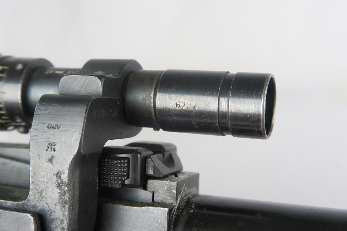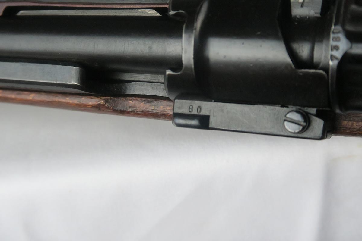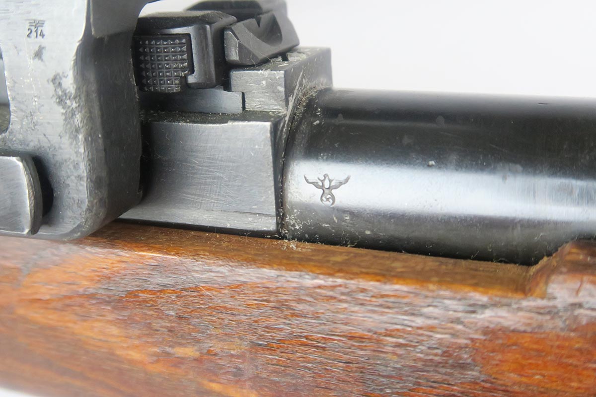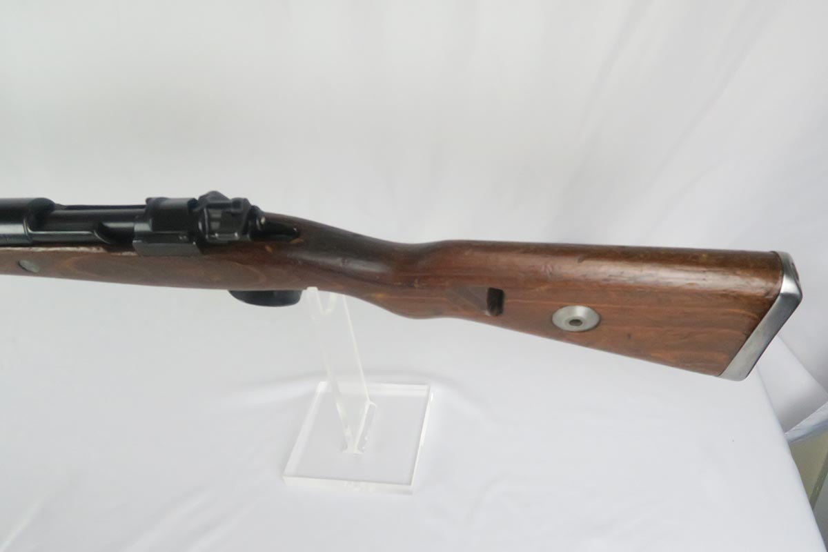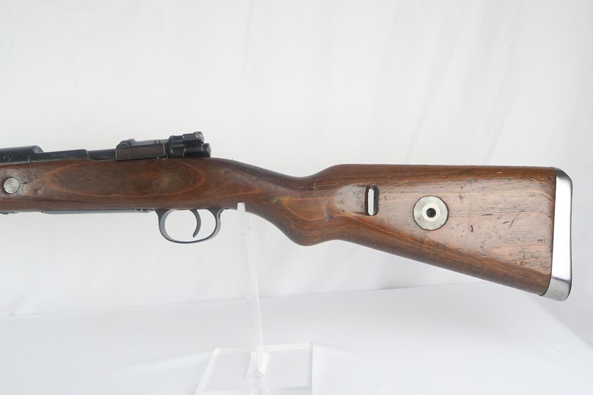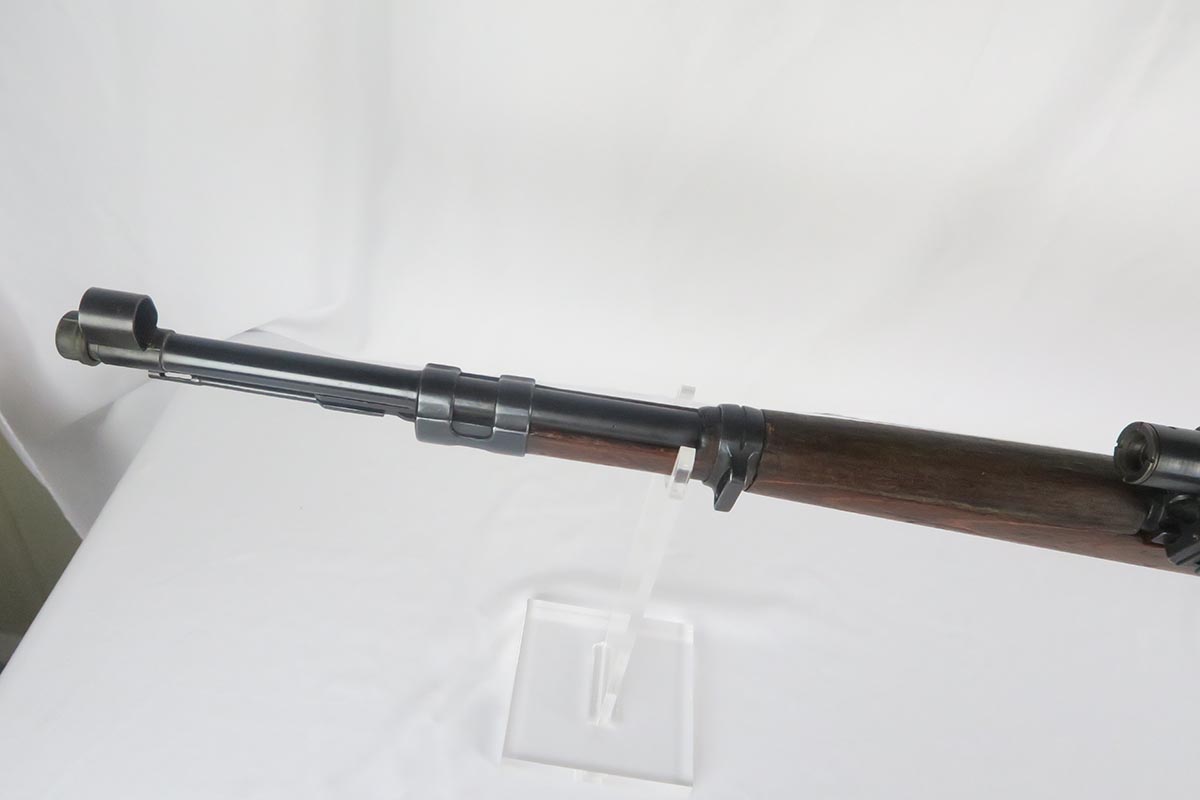 1/19/18 – This is a hard-to-find Mauser K98 sniper rifle from 1942 with original ZF scope. The rifle is in good condition with mostly matching numbers, and includes a sight hood, muzzle cover and cleaning rod. There is some evidence of renumbering on this rifle, thus the lower list price, and the magazine follower is mismatched. The safety is the only part I’m sure has been renumbered, but the rear barrel band is a possibility as well. The scope is original and the mount is waffen marked. All other parts of the rifle are original, including the stock and the finish. The bore has strong rifling but some frosting, and could use a good cleaning. Scope optics are mostly clear.
