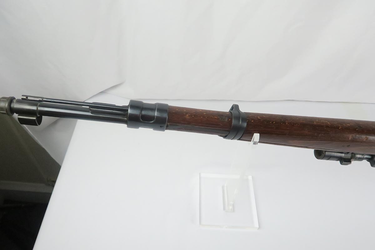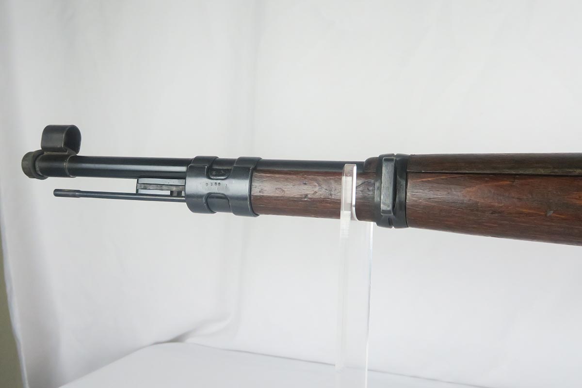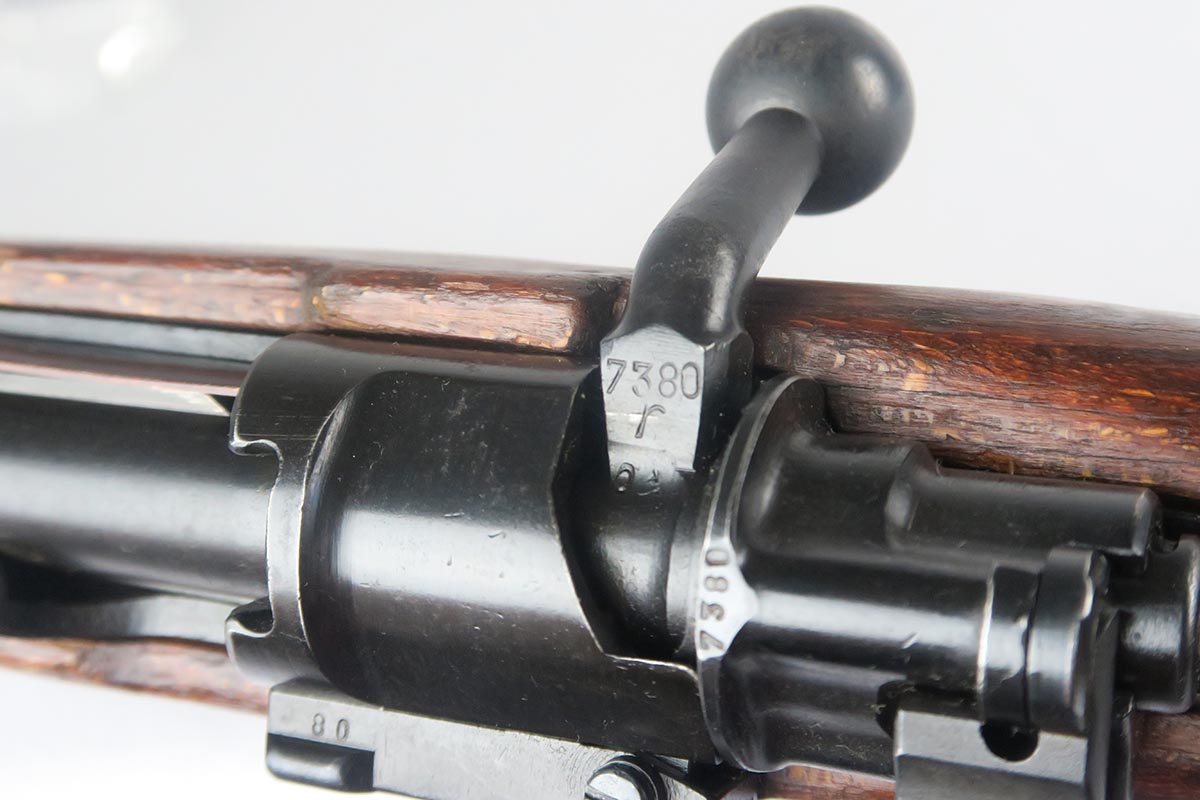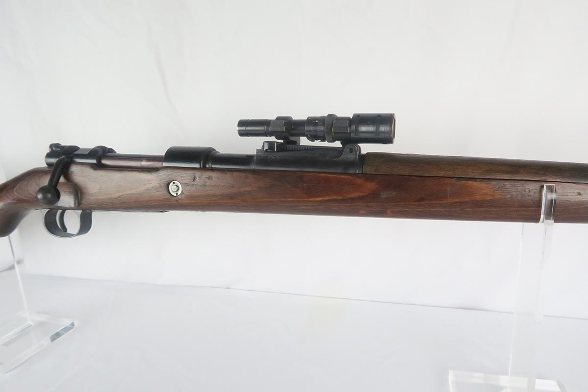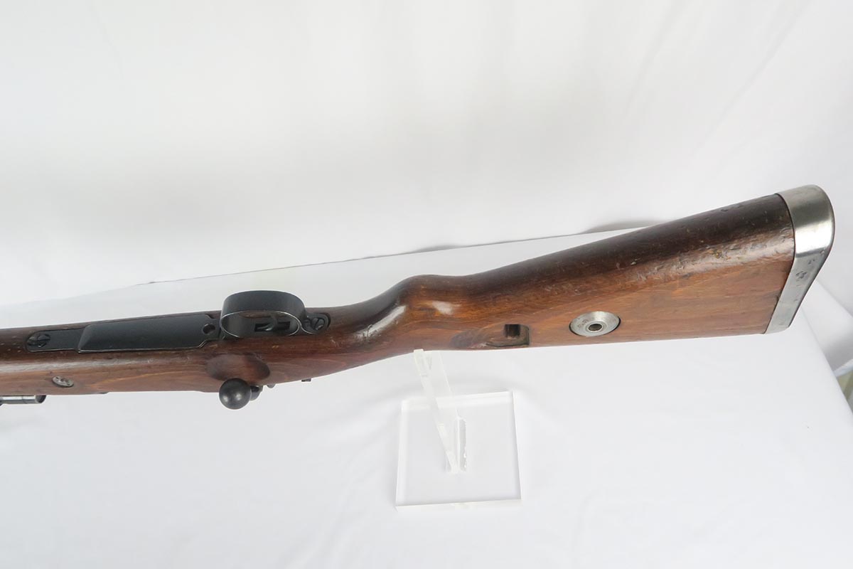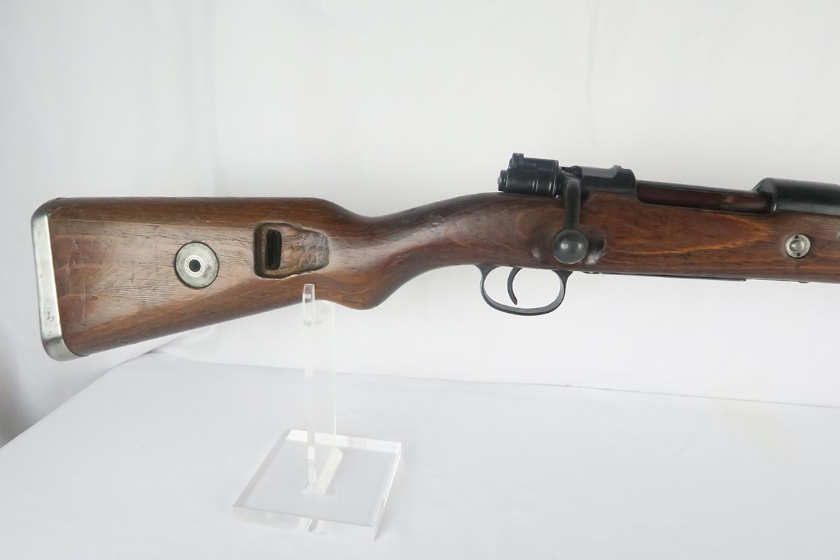 1/19/18 – This is a hard-to-find Mauser K98 sniper rifle from 1942 with original ZF scope. The rifle is in good condition with mostly matching numbers, and includes a sight hood, muzzle cover and cleaning rod. There is some evidence of renumbering on this rifle, thus the lower list price, and the magazine follower is mismatched. The safety is the only part I’m sure has been renumbered, but the rear barrel band is a possibility as well. The scope is original and the mount is waffen marked. All other parts of the rifle are original, including the stock and the finish. The bore has strong rifling but some frosting, and could use a good cleaning. Scope optics are mostly clear.