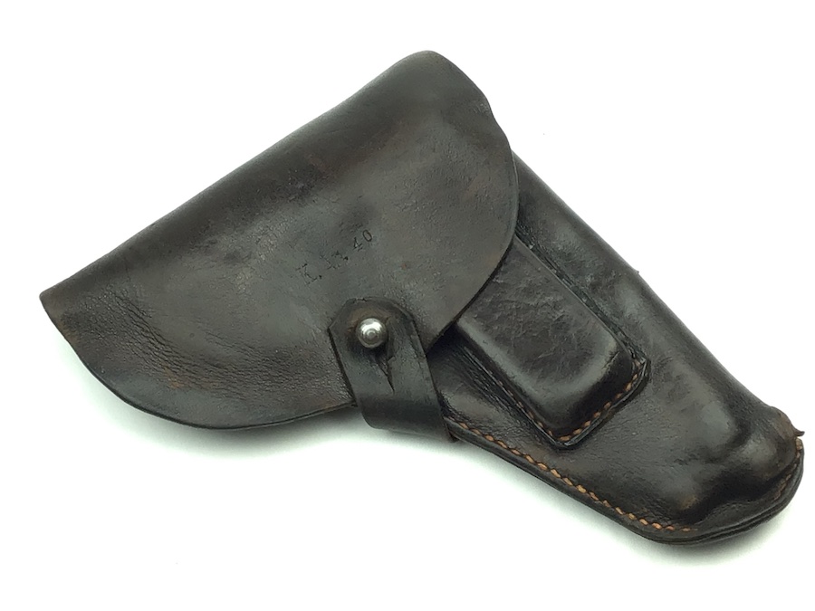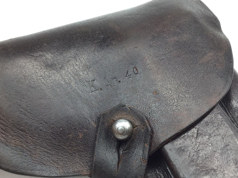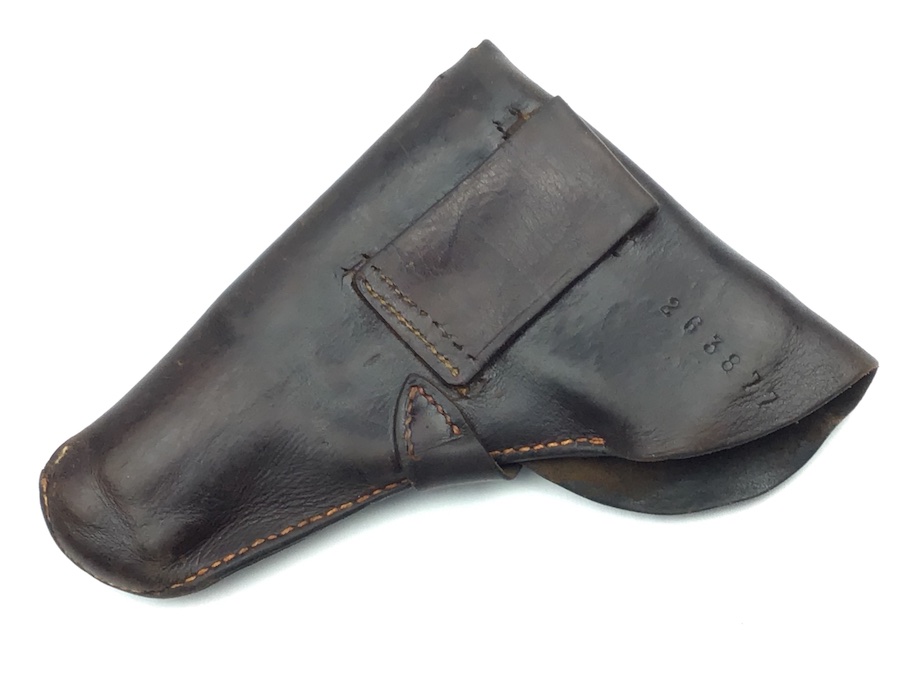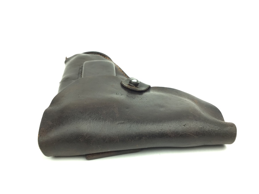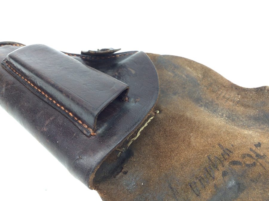 11/20/20 – Original and very good condition holster for the Mauser M1914 or 1934 handgun. Could also fit a CZ-27 or Hsc. Holster is property stamped “K Ar 40” (Kriminalpolizei Armsberg Waffen Nr 40) Serial number of the original gun stamped on the back “263877” Soft leather that is fully intact with strong stitching. Un-known ink stamps on the interior flap. The closure strap appears to have been shortened. Nice piece.