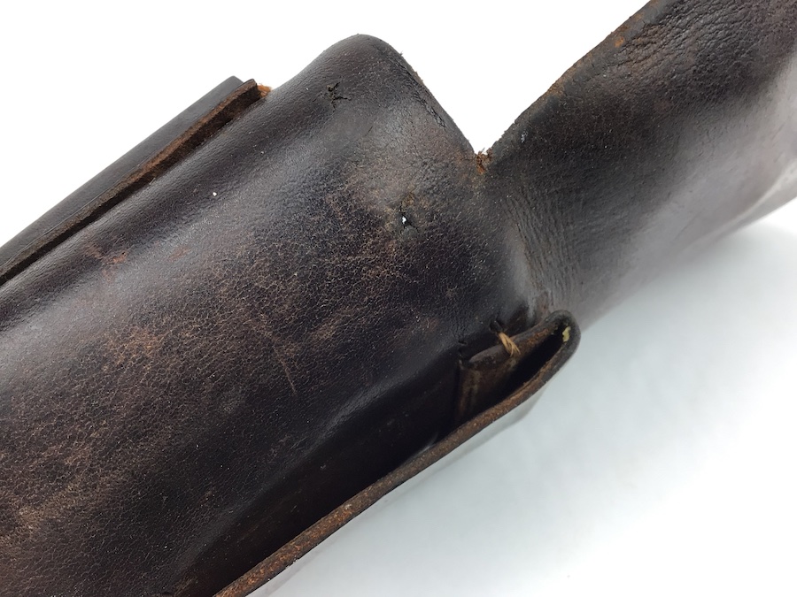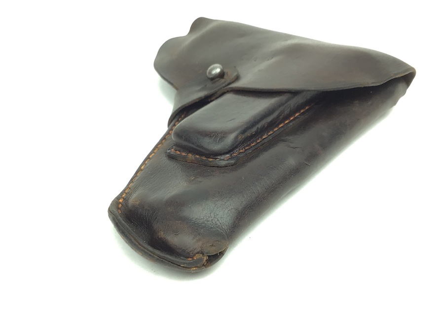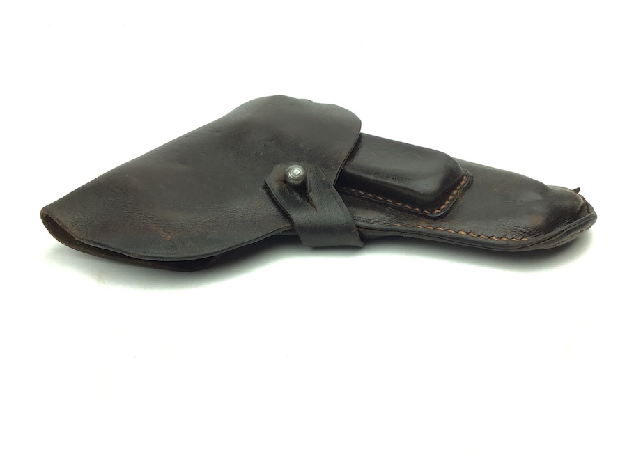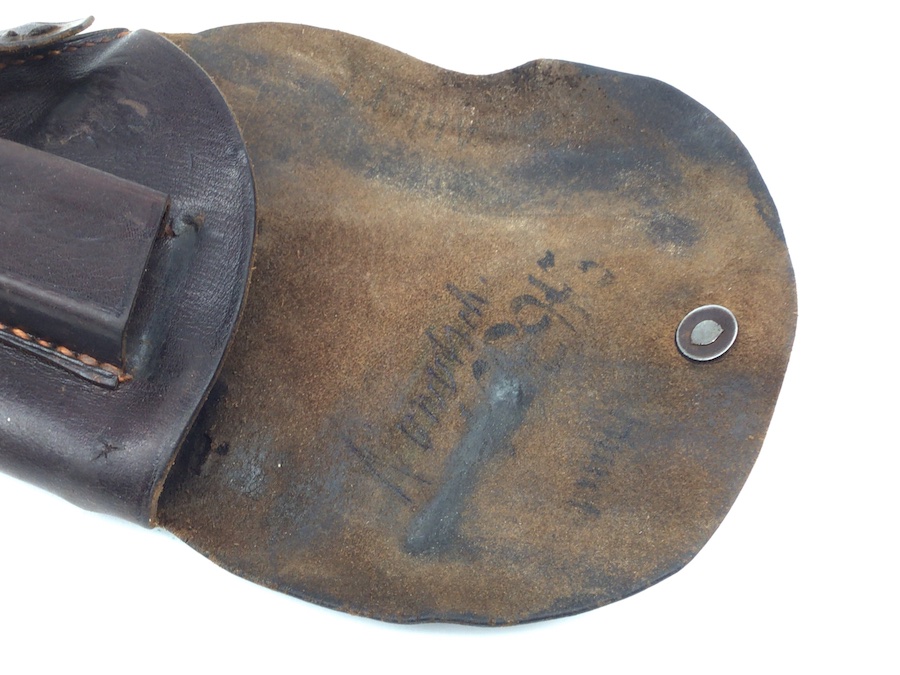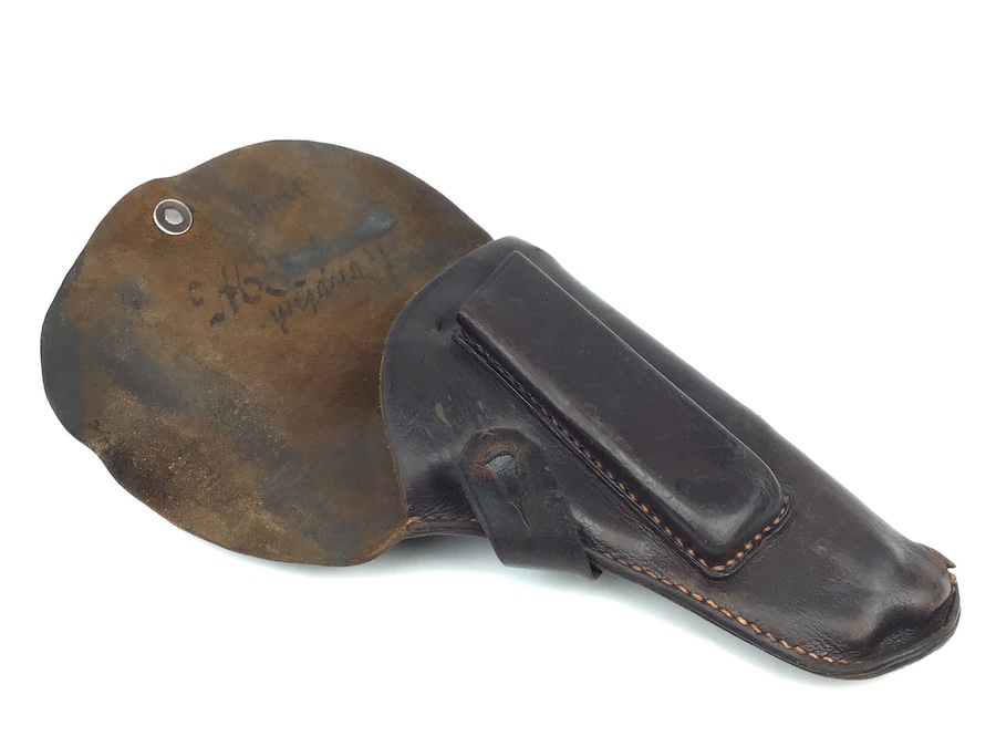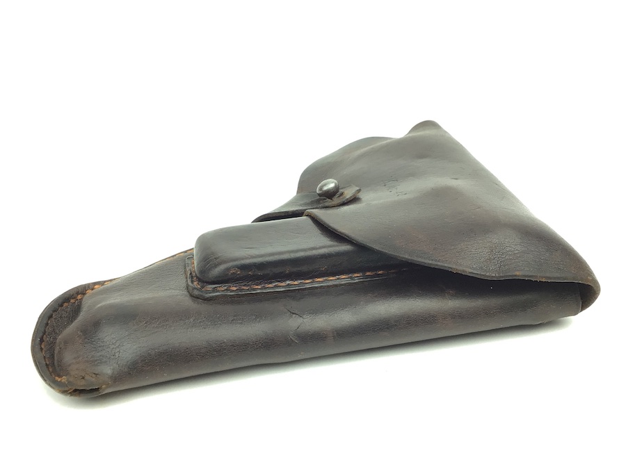 11/20/20 – Original and very good condition holster for the Mauser M1914 or 1934 handgun. Could also fit a CZ-27 or Hsc. Holster is property stamped “K Ar 40” (Kriminalpolizei Armsberg Waffen Nr 40) Serial number of the original gun stamped on the back “263877” Soft leather that is fully intact with strong stitching. Un-known ink stamps on the interior flap. The closure strap appears to have been shortened. Nice piece.
