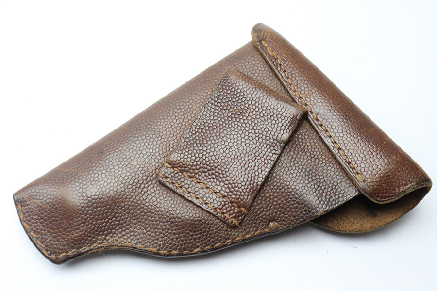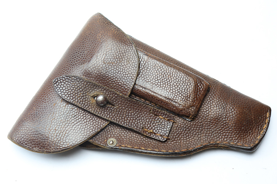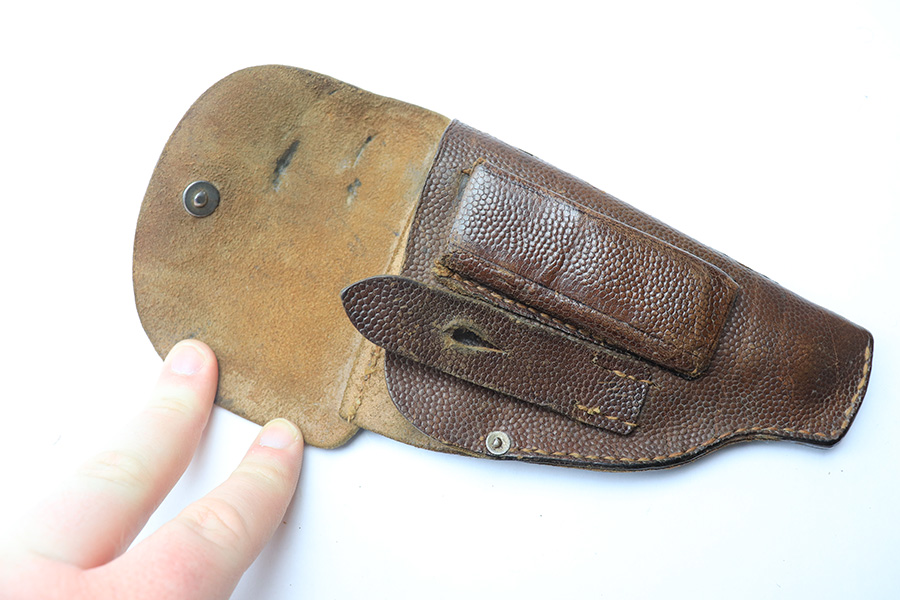 3/30/22 – This is a nice example of a 1915 dated pistol holster from WW1. Likely for the Mauser M1914, but fits any similar sized model. Overall the holster is in good condition, the pebble grain leather shows only minor signs of rub wear and small cracking on the closure flap. The stitching is intact throughout other than a few stitches on the closure strap.