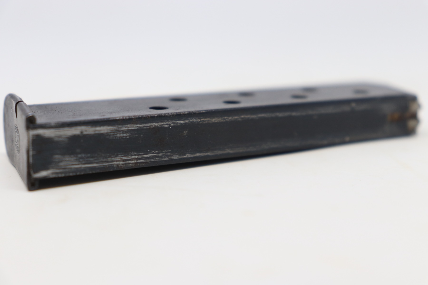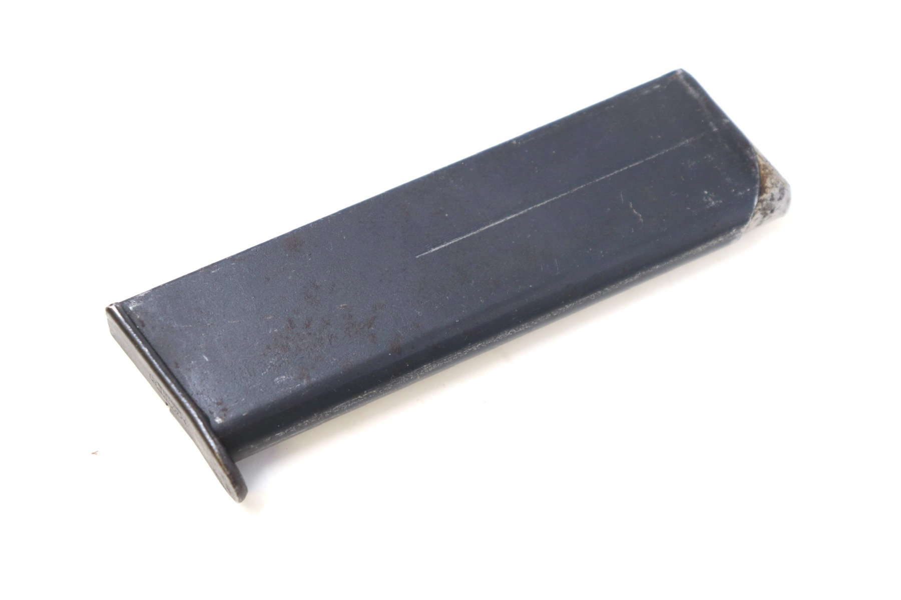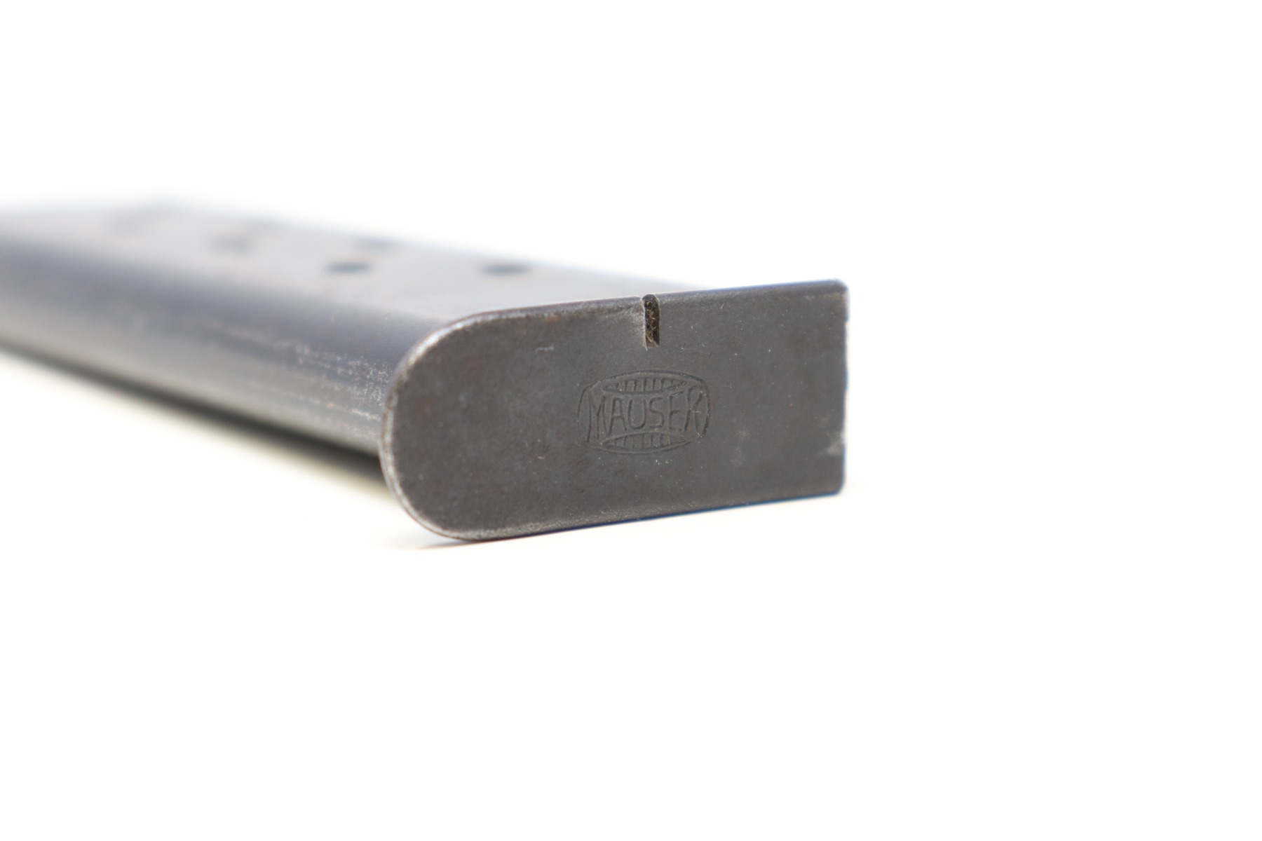 10/4/23 – This is a great condition Mauser model 1934 magazine. Both flat side of the body have very minimal finish loss with the spine having the majority of wear. Spring is strong and functional. Mauser banner displayed across the foot plate.