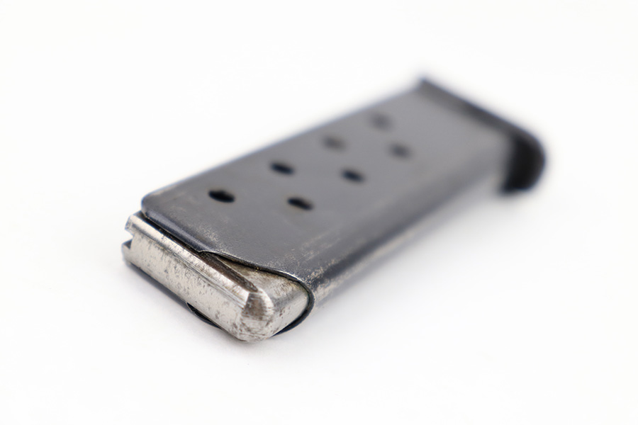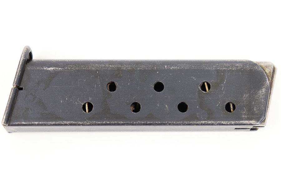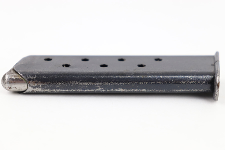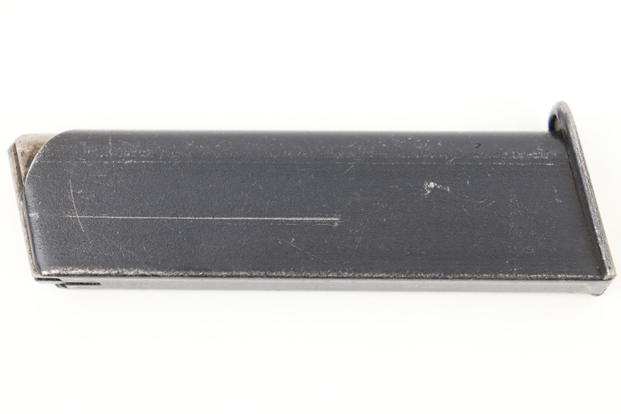 7/26/23 – This is an original Mauser M1934 magazine from WW2. The magazine has a dull, wartime blued finish on the frame and base. There’s minor finish loss but no rust or pitting. Mauser banner stamped on the base as shown. The spring is strong and functional.
