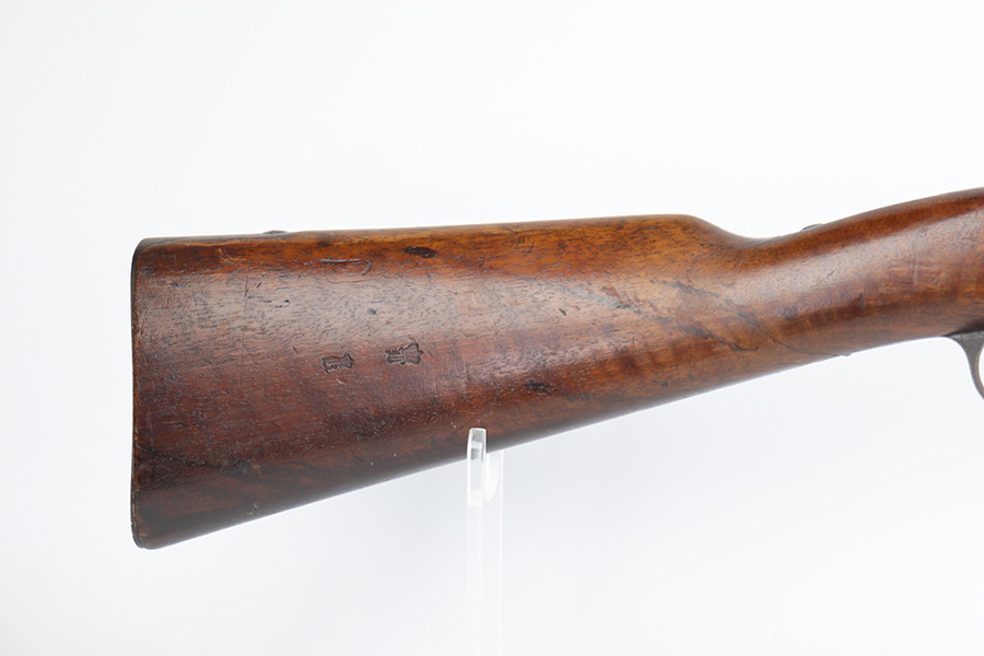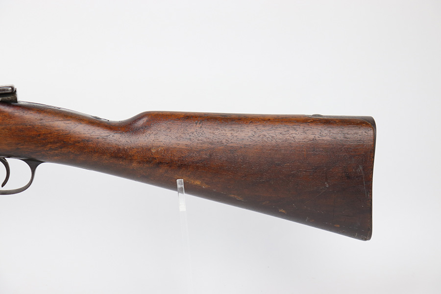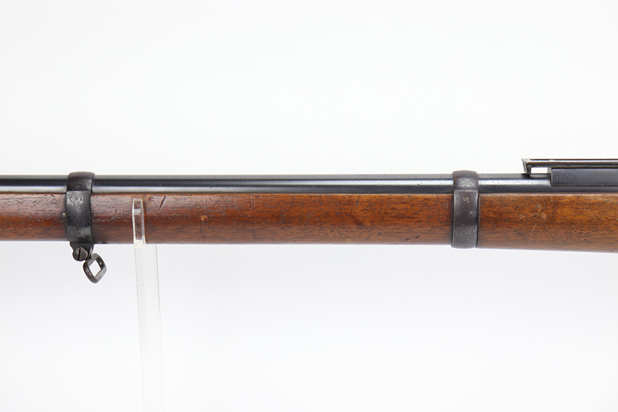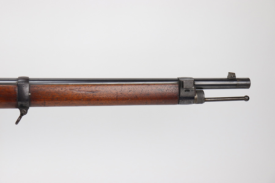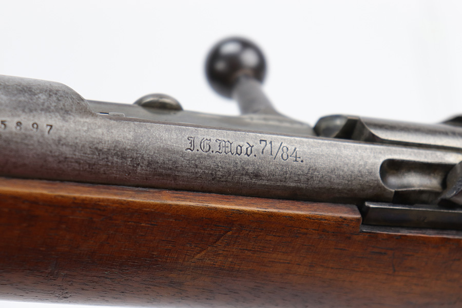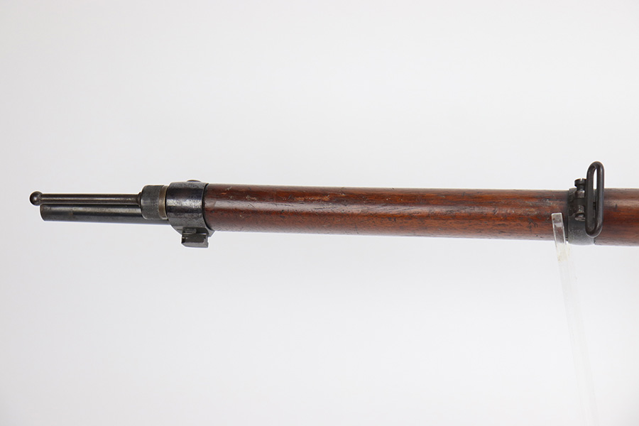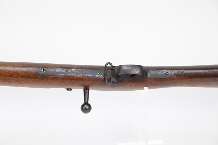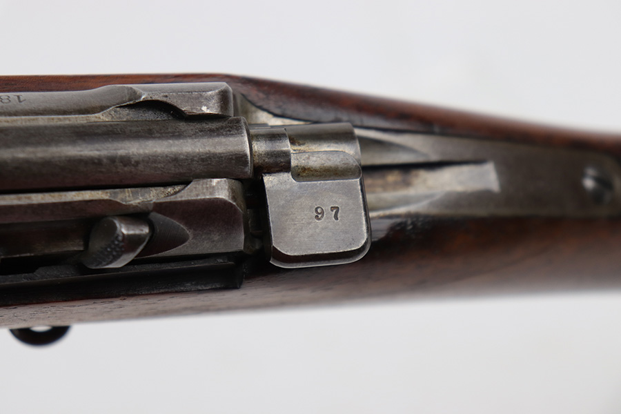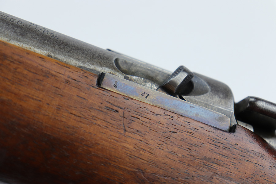 6/12/23 – This is an all original Mauser 1871/84 rifle made by Amberg Arsenal. This antique rifle is chambered in 11mm and still retains the original finish and all numbered parts matching. These rifles are scarcely encountered in this condition with about 88-90% of the metal retaining the original finish. Most of the finish loss is found on the receiver and bolt assembly, which has a natural patina and light surface wear but no rust or pitting. The barrel and metal underside / trigger assembly has dark surface patina mixed within the original finish, and natural aging wear throughout. The wood stock is Imperial proof stamped with a few light surface imperfections but no cracks or chips. Mechanically sound with smooth function and a clean bore. The bore is shiny with nice rifling and rates 9/10 overall.