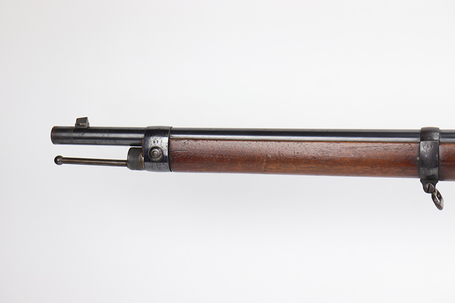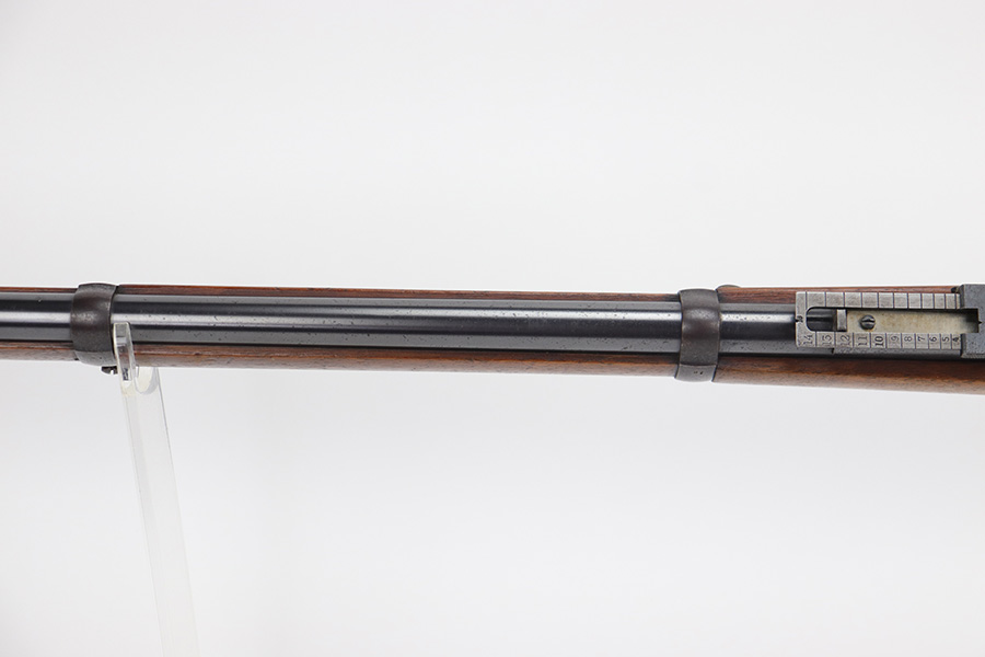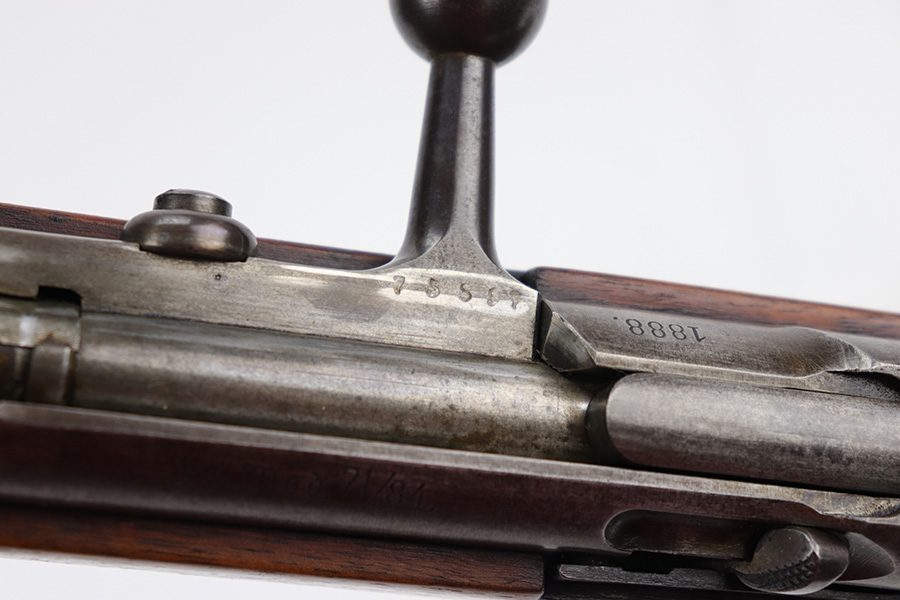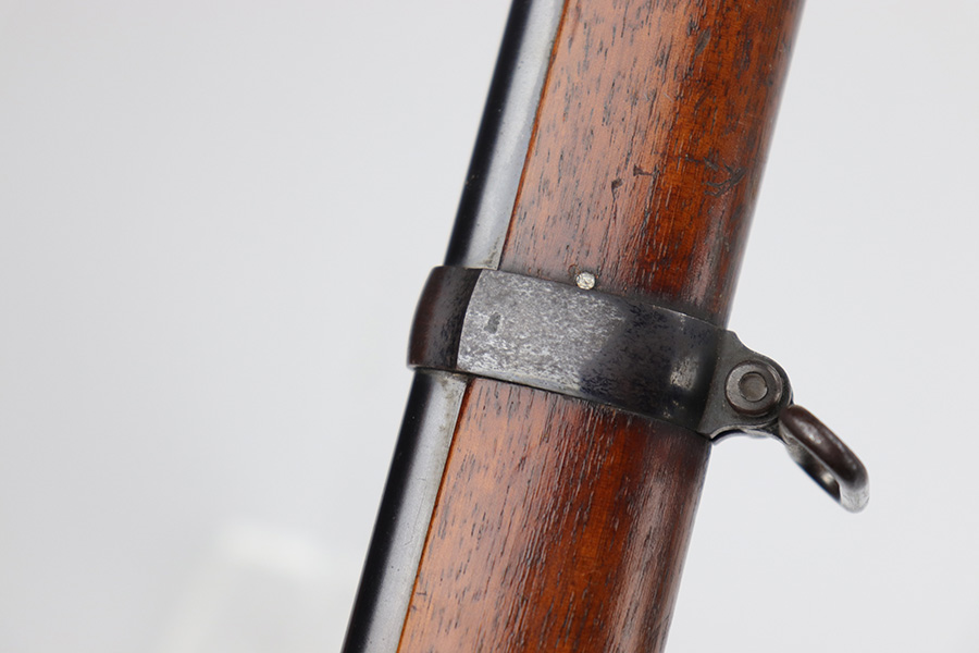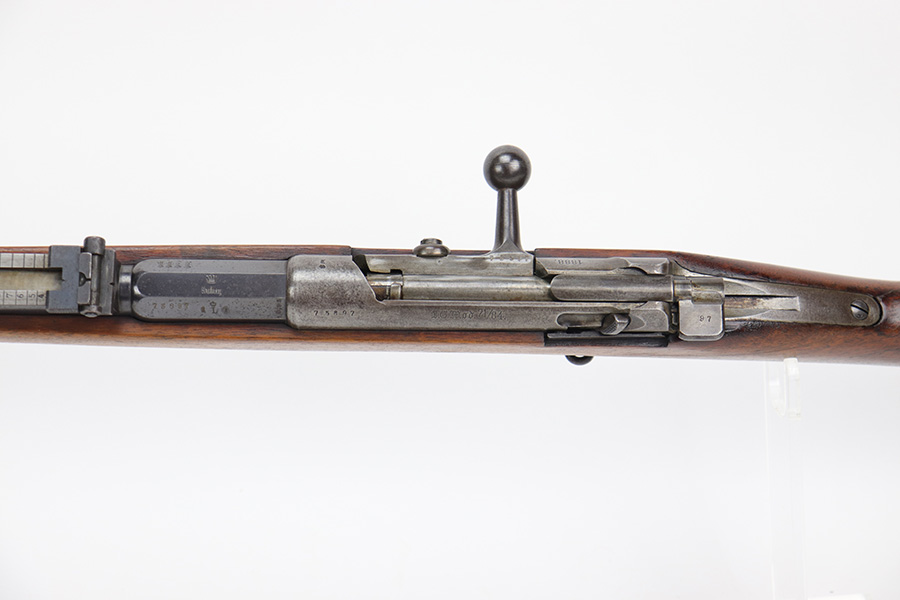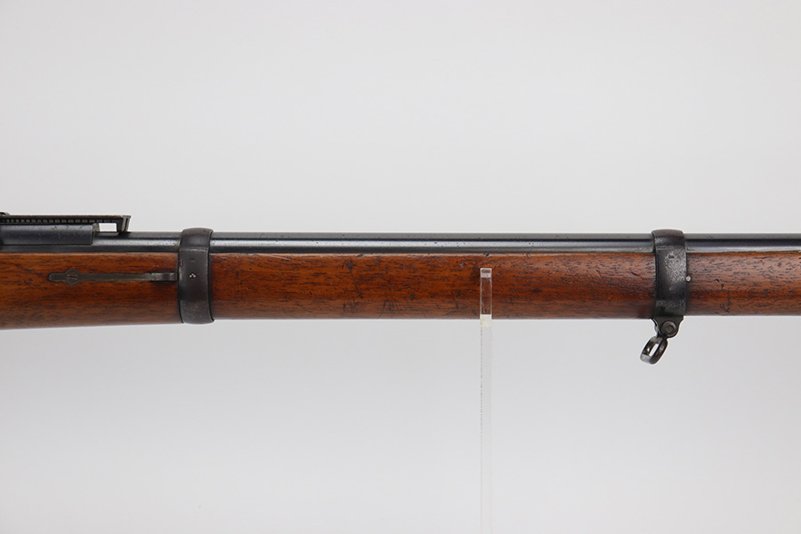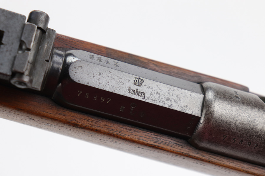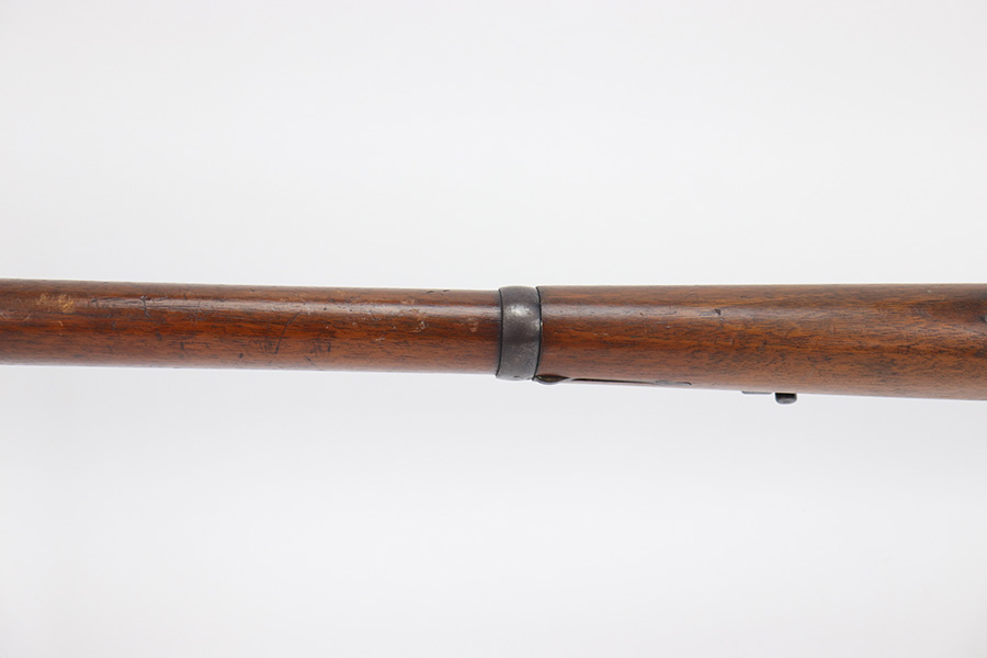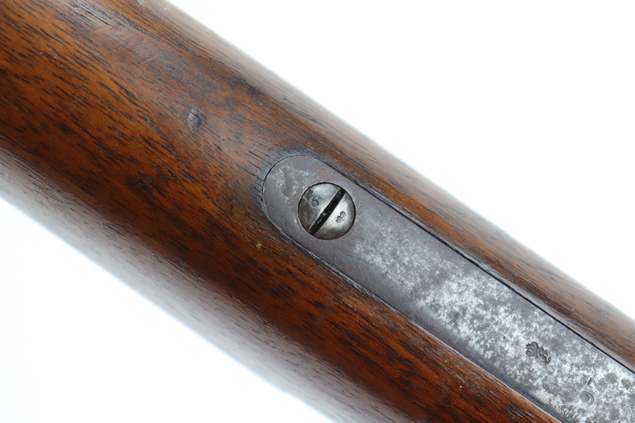 6/12/23 – This is an all original Mauser 1871/84 rifle made by Amberg Arsenal. This antique rifle is chambered in 11mm and still retains the original finish and all numbered parts matching. These rifles are scarcely encountered in this condition with about 88-90% of the metal retaining the original finish. Most of the finish loss is found on the receiver and bolt assembly, which has a natural patina and light surface wear but no rust or pitting. The barrel and metal underside / trigger assembly has dark surface patina mixed within the original finish, and natural aging wear throughout. The wood stock is Imperial proof stamped with a few light surface imperfections but no cracks or chips. Mechanically sound with smooth function and a clean bore. The bore is shiny with nice rifling and rates 9/10 overall.