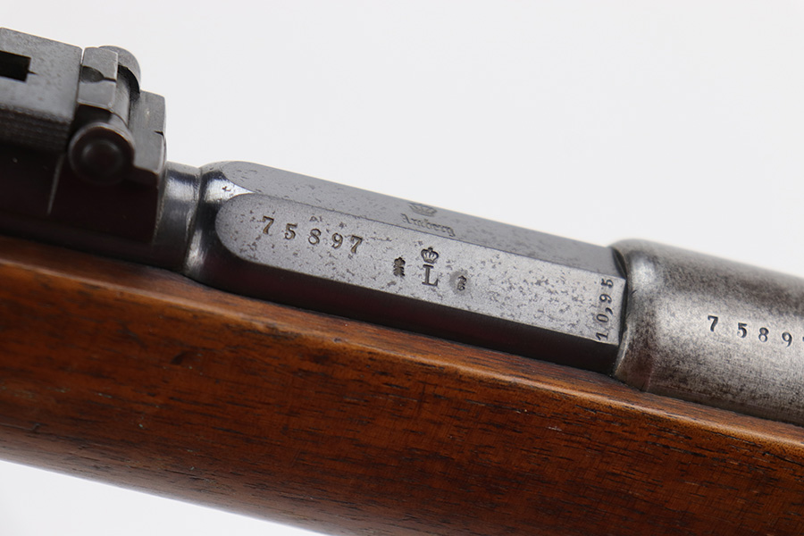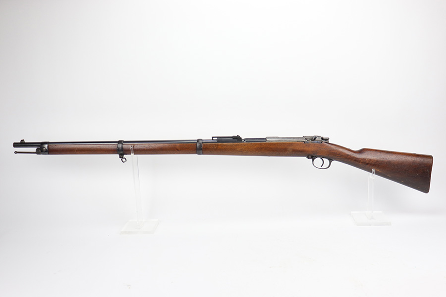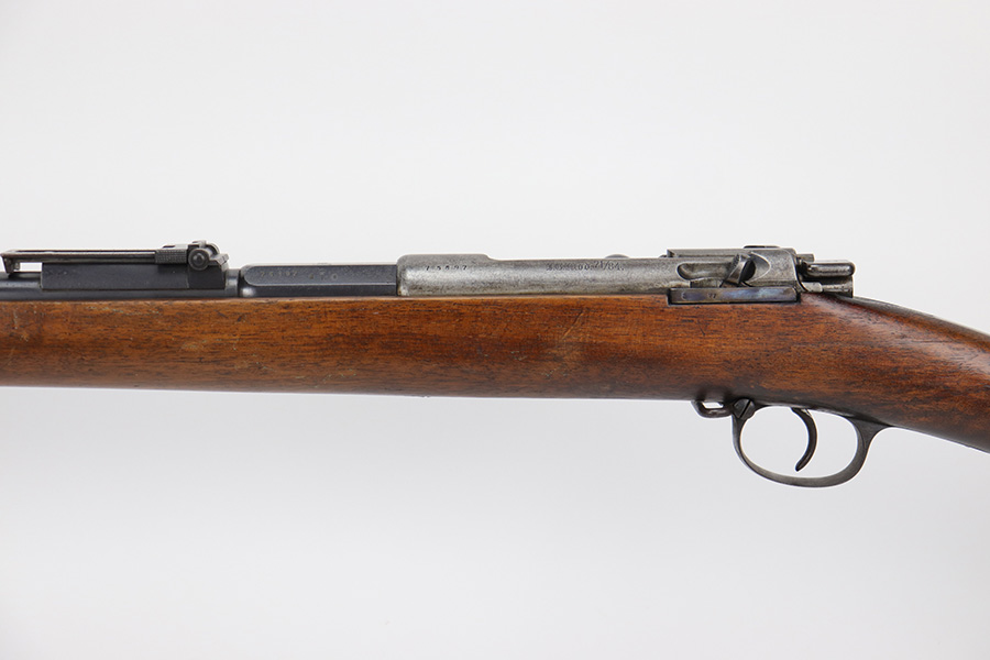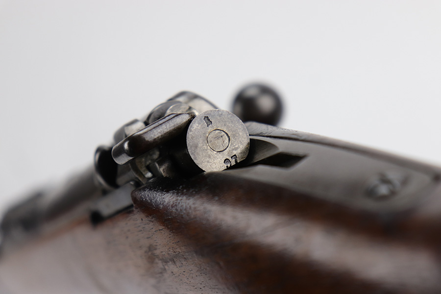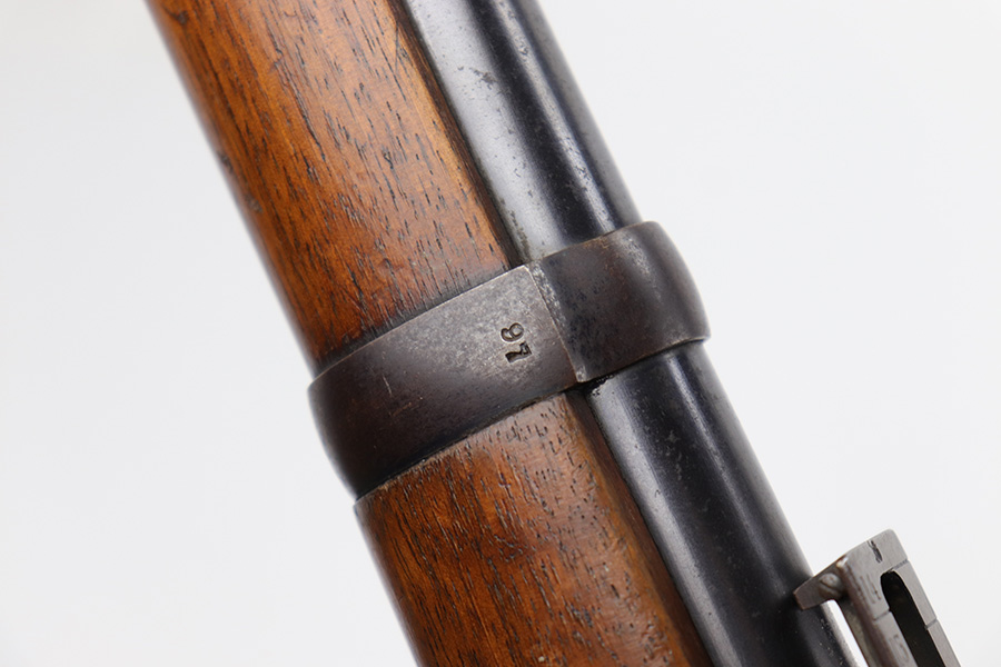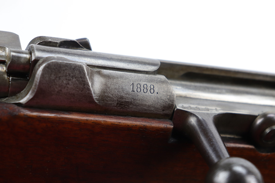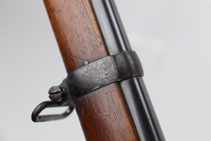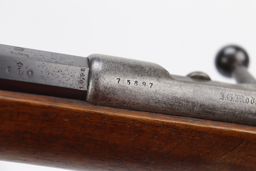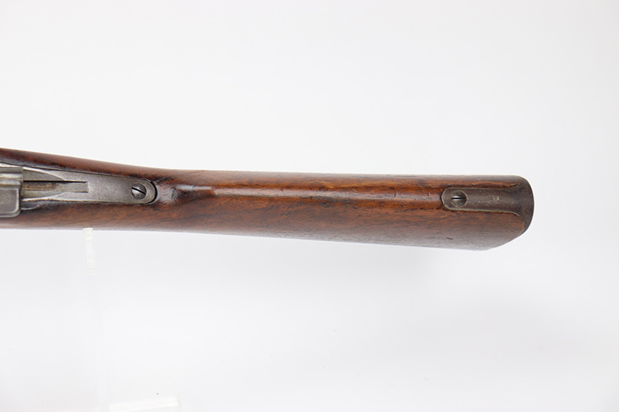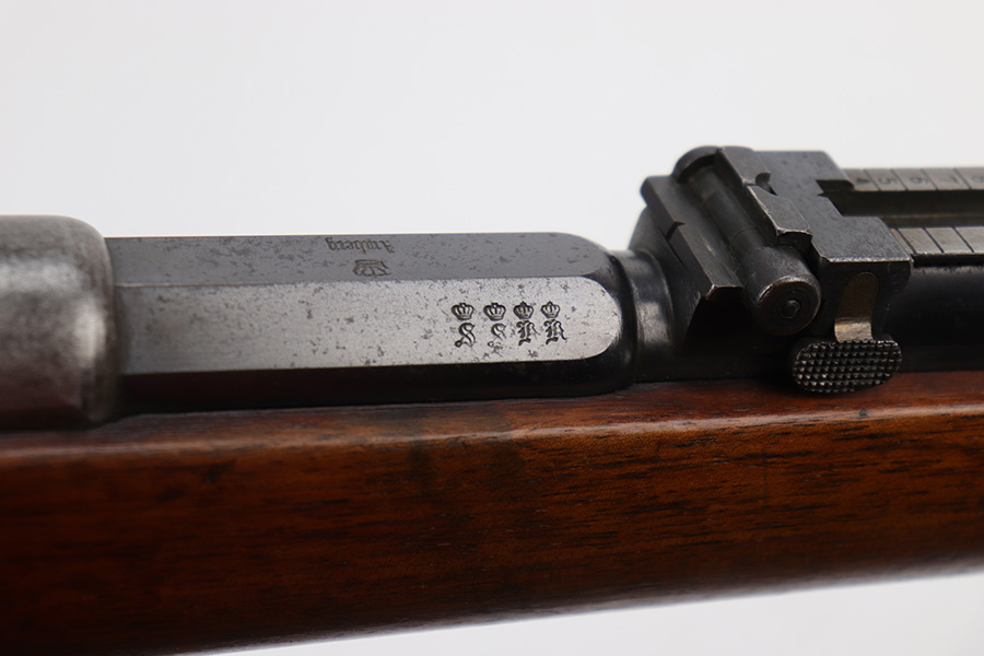 6/12/23 – This is an all original Mauser 1871/84 rifle made by Amberg Arsenal. This antique rifle is chambered in 11mm and still retains the original finish and all numbered parts matching. These rifles are scarcely encountered in this condition with about 88-90% of the metal retaining the original finish. Most of the finish loss is found on the receiver and bolt assembly, which has a natural patina and light surface wear but no rust or pitting. The barrel and metal underside / trigger assembly has dark surface patina mixed within the original finish, and natural aging wear throughout. The wood stock is Imperial proof stamped with a few light surface imperfections but no cracks or chips. Mechanically sound with smooth function and a clean bore. The bore is shiny with nice rifling and rates 9/10 overall.