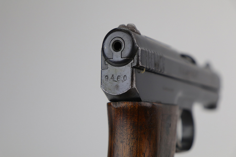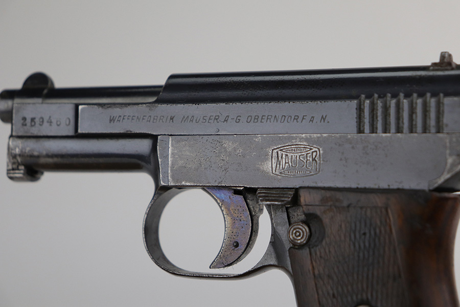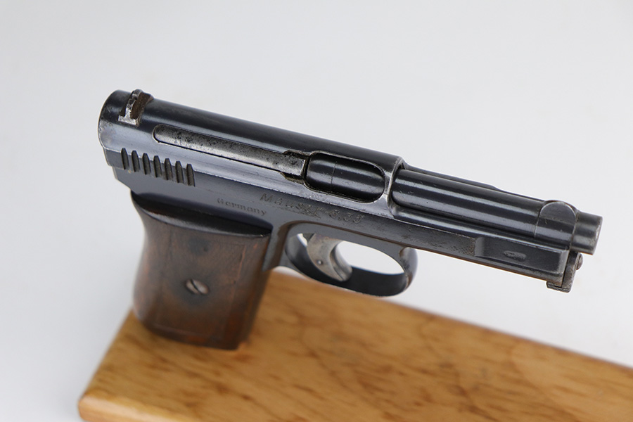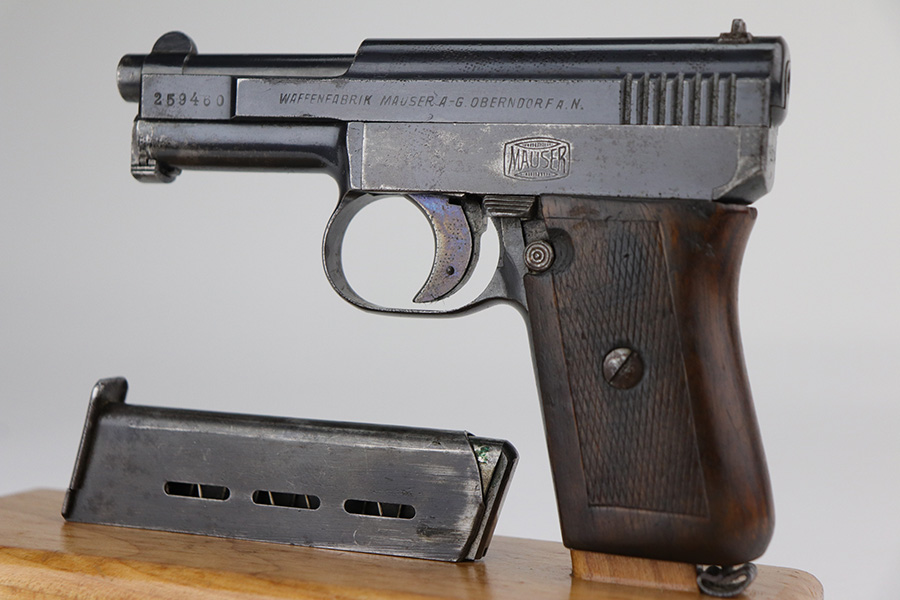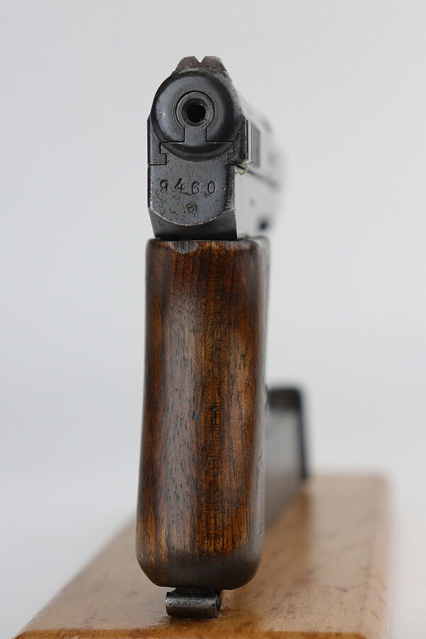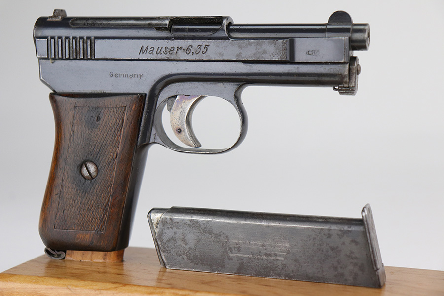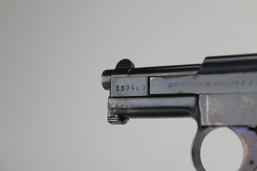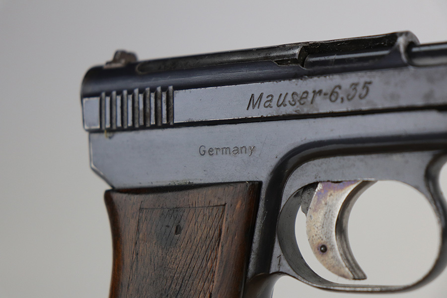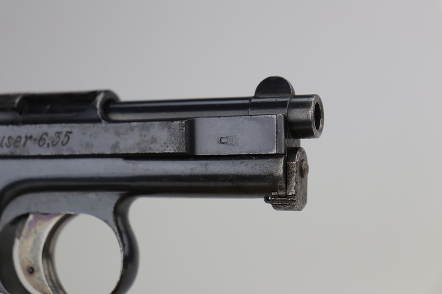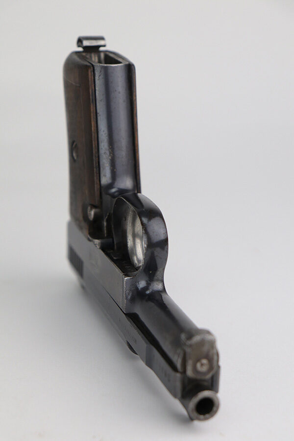 9/17/21 – This is a nice example of a Mauser Model 1910, chambered in .25 caliber. It is all matching and has the proper “Crown U” commercial proofs. There is a “Germany” export proof on the right side of the frame, indicating it was intended for international commercial sale. There are areas of spotty wear on the left side of the frame, underside of the frame near the muzzle, and on the front strap. Areas of spotty oxidation and minor pitting throughout. Comes with a slightly worn wood grip and a period-correct magazine. The bore has strong rifling with minor frosting in the grooves. The magazine is a little difficult to remove because the mag release is a little stiff.