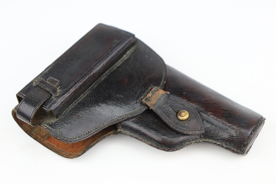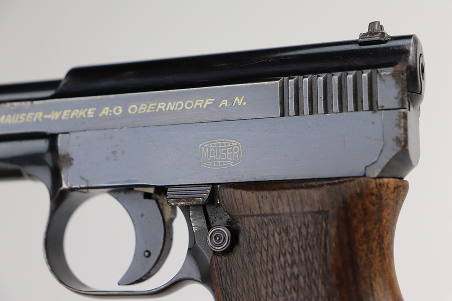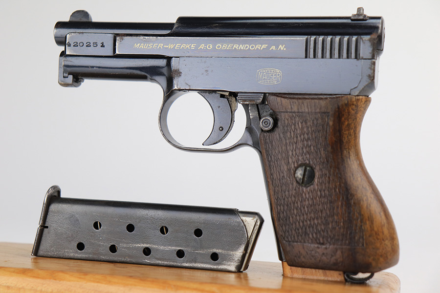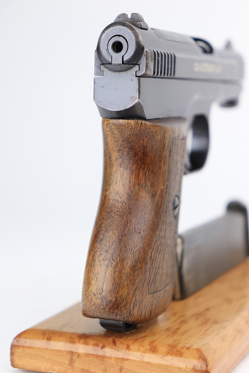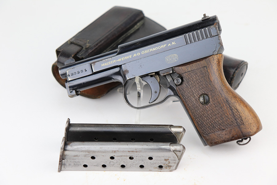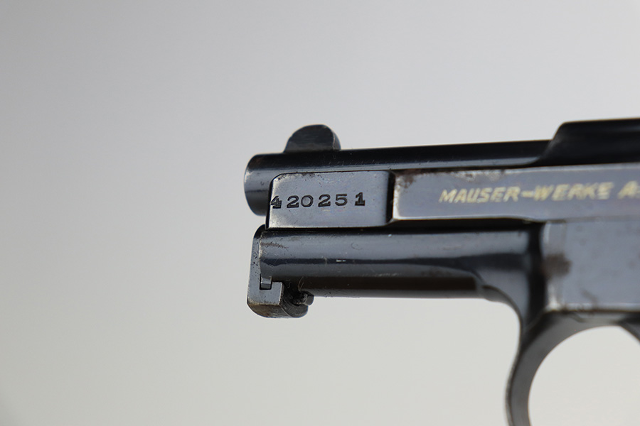 3/10/22 – This is an excellent example of a transitional Mauser Model 1910/34 sold in the commercial market in the 1930’s. This one was probably manufactured in the late 1930’s, since these guns weren’t made in .25 caliber until about 1936. The gun is all matching and has the proper “Crown U” commercial proofs. This one comes as a rig with a rare commercial brown leather holster and two period-correct magazines. The holster is un-marked, and the stitching that holds the closure strap to the top flap has come apart. The gun has retained about 95% of its bluing. There is minor wear concentrated around the high edges of the slide and around the muzzle. While there isn’t much actual finish loss, there are some small spots of textured oxidation here and there along the left side of the gun. Small dots of discoloration here and there on the right side of the gun. Some light handling marks on the underside of the frame and on the front strap. Comes with a nice period-correct wood grip – one tiny chip in the bottom left corner. Mint bore.
