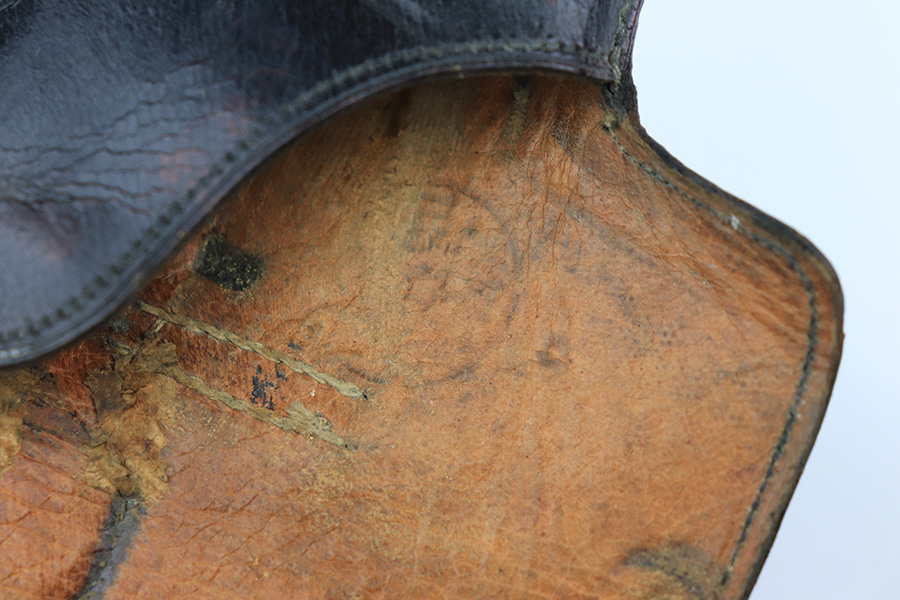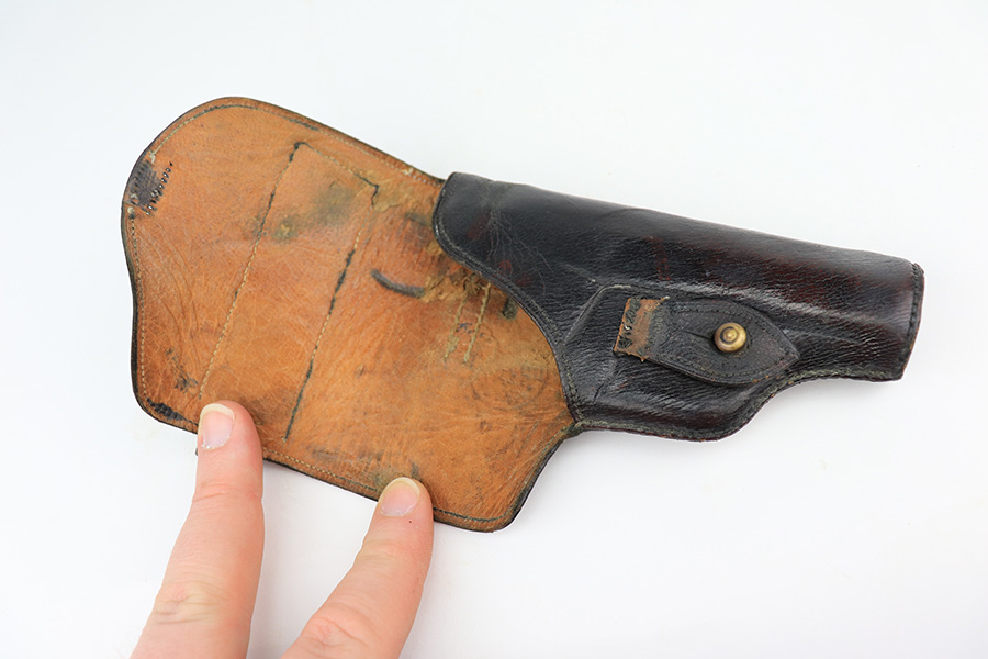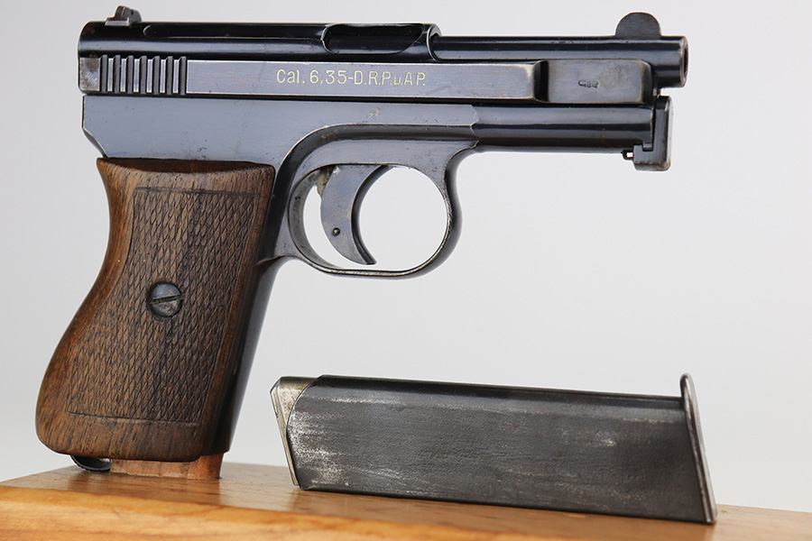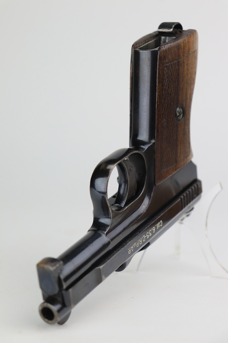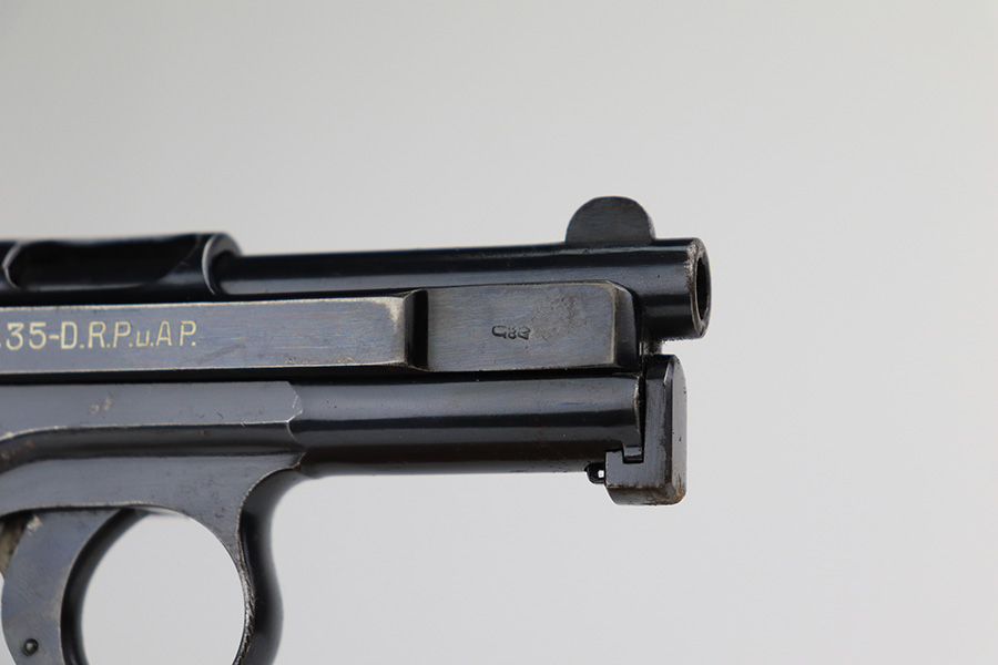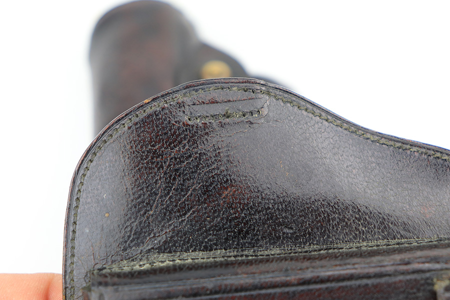 3/10/22 – This is an excellent example of a transitional Mauser Model 1910/34 sold in the commercial market in the 1930’s. This one was probably manufactured in the late 1930’s, since these guns weren’t made in .25 caliber until about 1936. The gun is all matching and has the proper “Crown U” commercial proofs. This one comes as a rig with a rare commercial brown leather holster and two period-correct magazines. The holster is un-marked, and the stitching that holds the closure strap to the top flap has come apart. The gun has retained about 95% of its bluing. There is minor wear concentrated around the high edges of the slide and around the muzzle. While there isn’t much actual finish loss, there are some small spots of textured oxidation here and there along the left side of the gun. Small dots of discoloration here and there on the right side of the gun. Some light handling marks on the underside of the frame and on the front strap. Comes with a nice period-correct wood grip – one tiny chip in the bottom left corner. Mint bore.