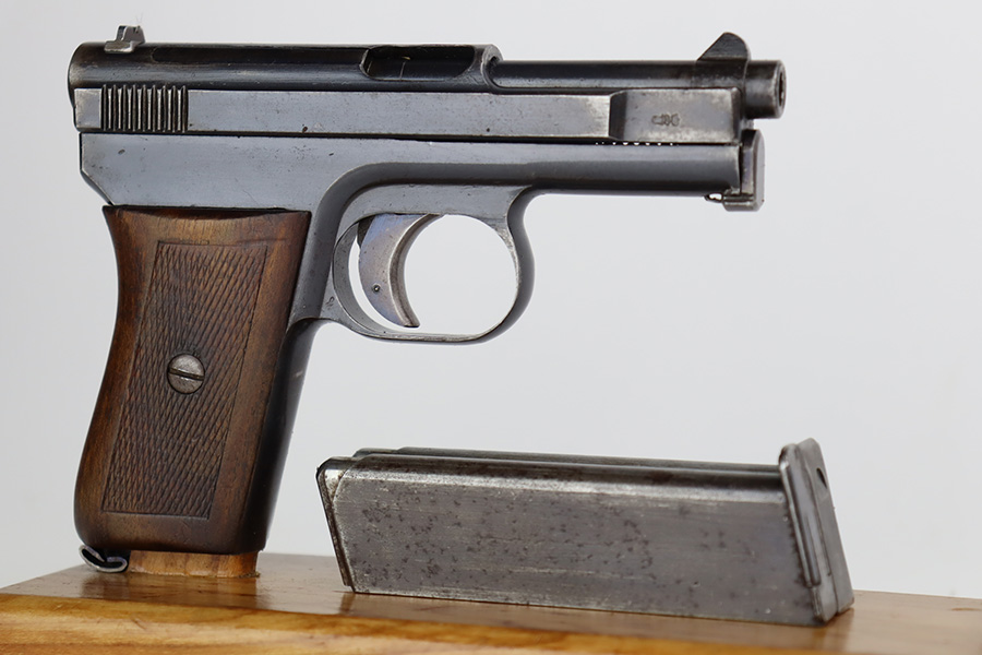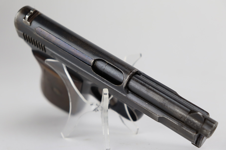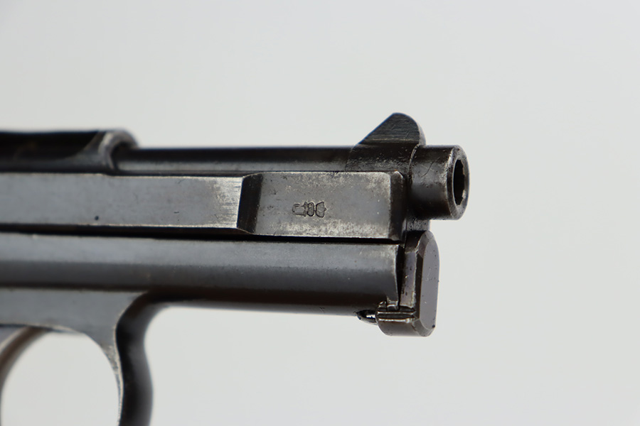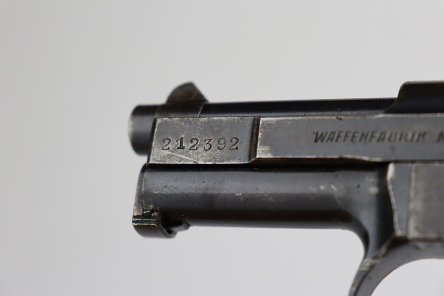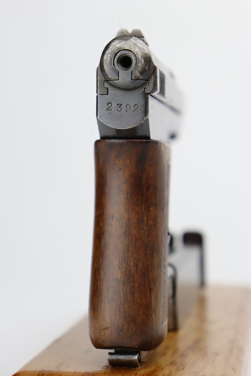9/26/23 – This is a nice Mauser Model 1910 manufactured in the 1920’s and chambered in 6.35mm or .25 ACP. It is all matching and has retained about 90% of its bluing. While there isn’t a ton of actual finish loss, there is noticeable spotty oxidation throughout and areas of tiny pitting here and there. Fitted with a period-correct wood grip and comes with one magazine. Near-mint bore.