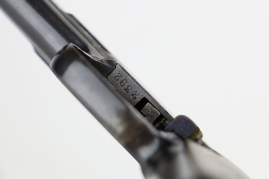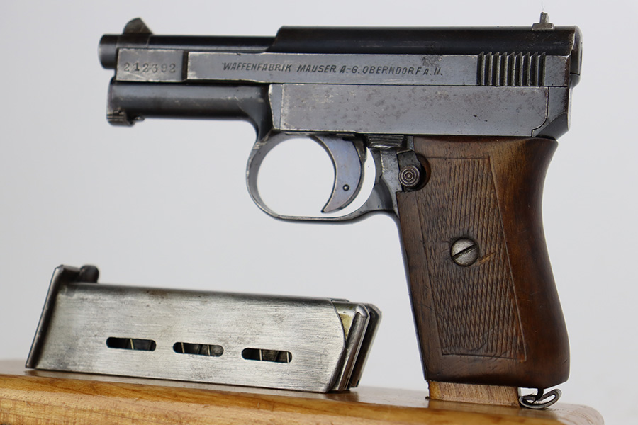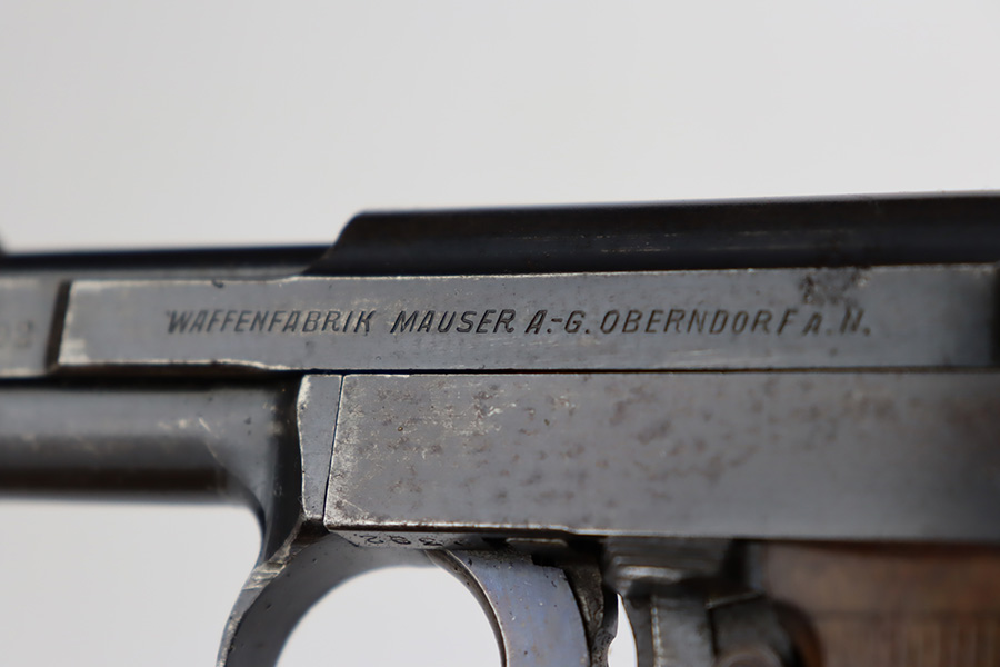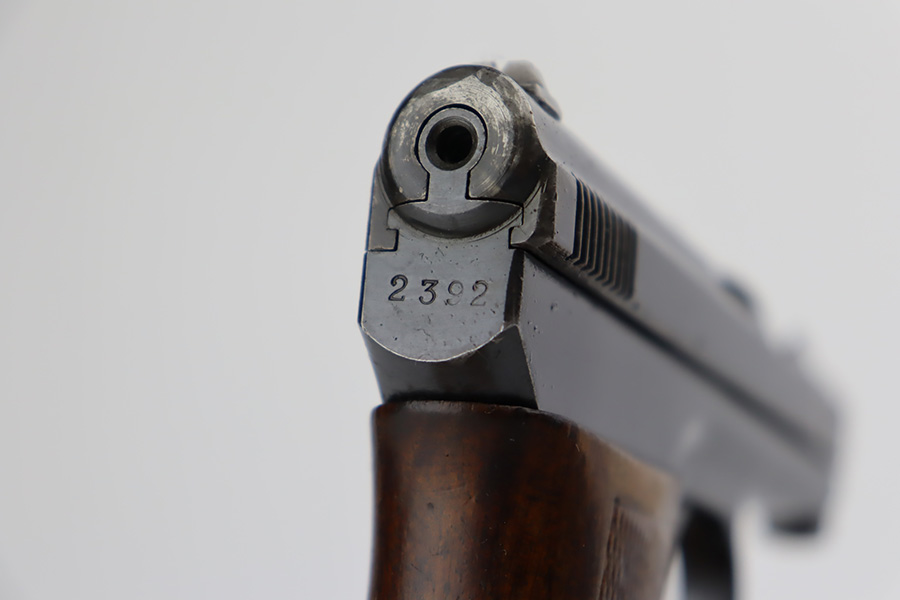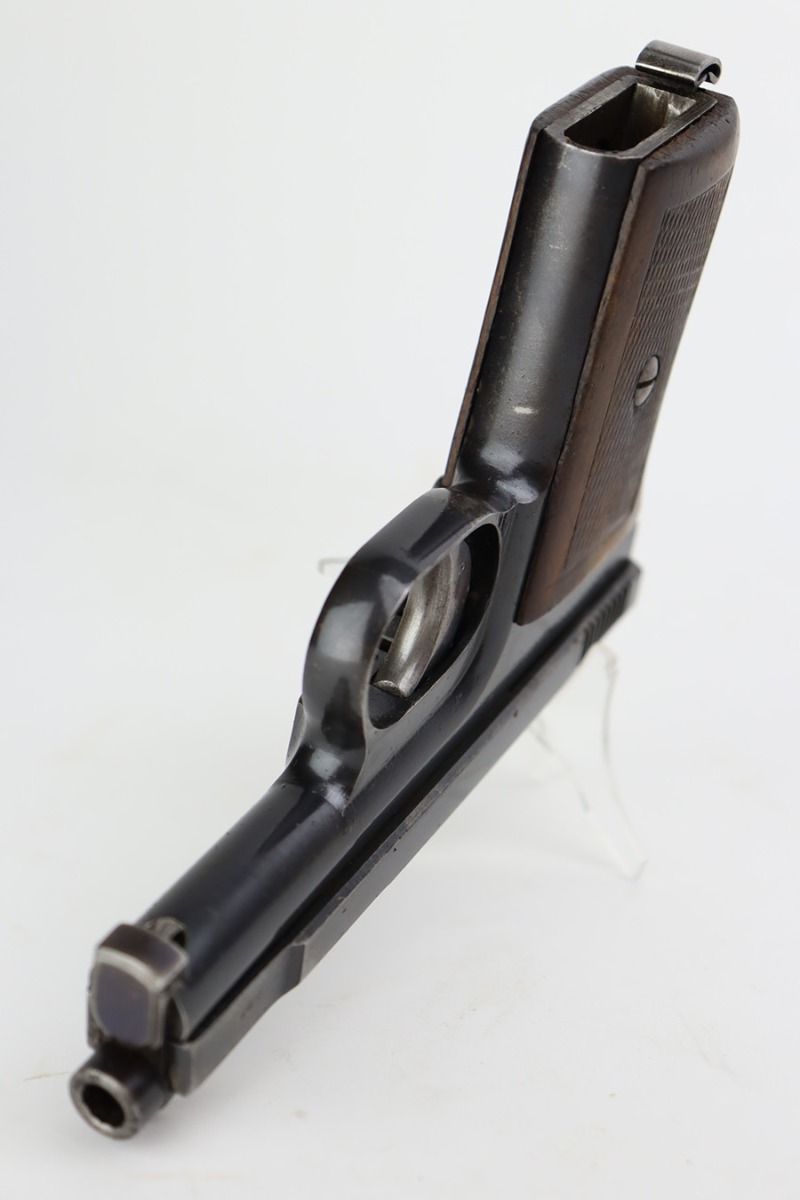 9/26/23 – This is a nice Mauser Model 1910 manufactured in the 1920’s and chambered in 6.35mm or .25 ACP. It is all matching and has retained about 90% of its bluing. While there isn’t a ton of actual finish loss, there is noticeable spotty oxidation throughout and areas of tiny pitting here and there. Fitted with a period-correct wood grip and comes with one magazine. Near-mint bore.