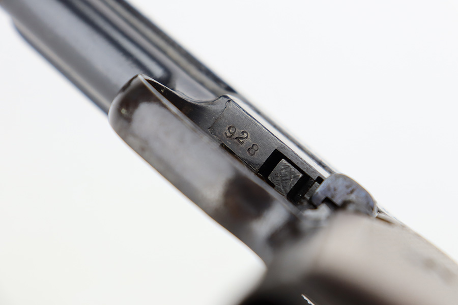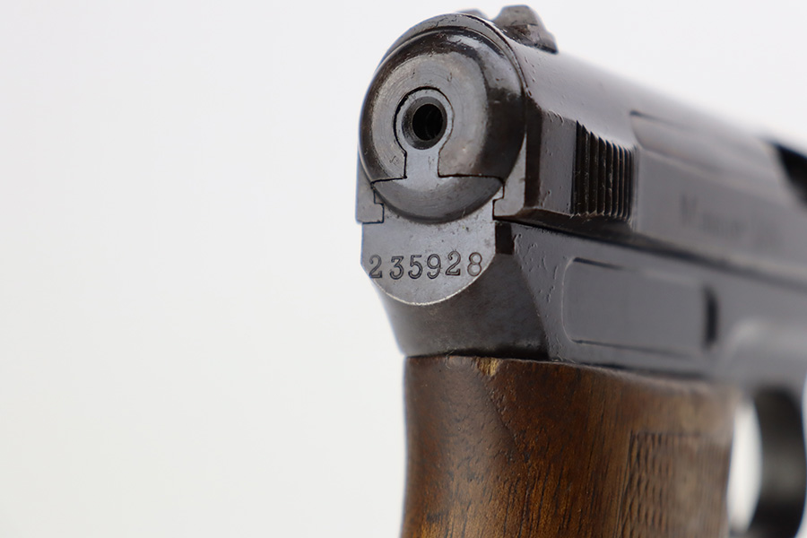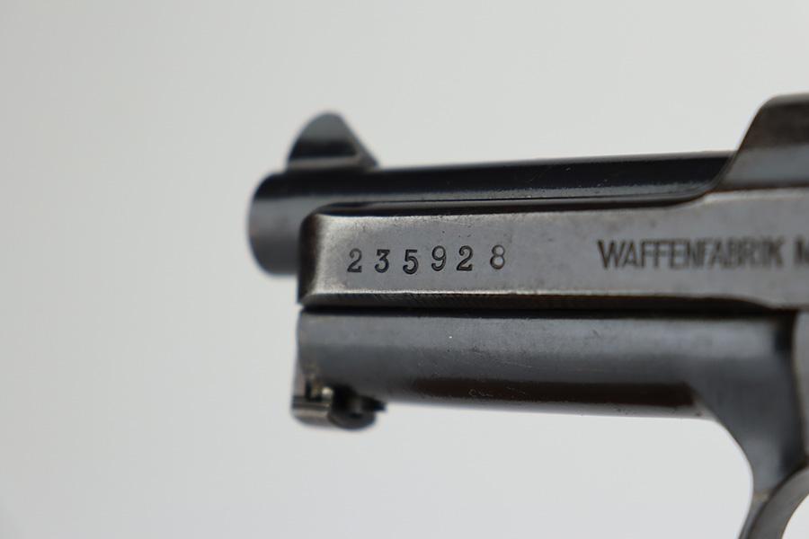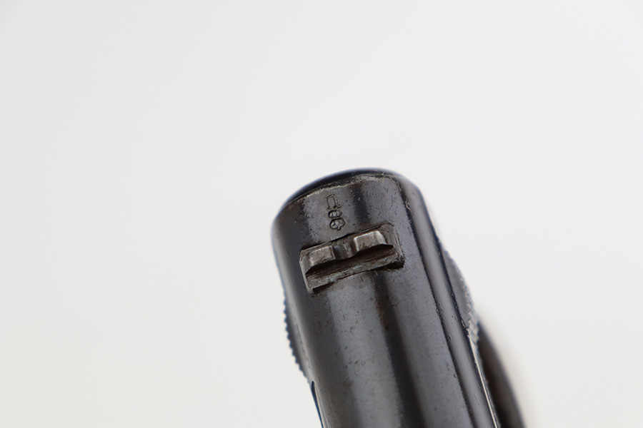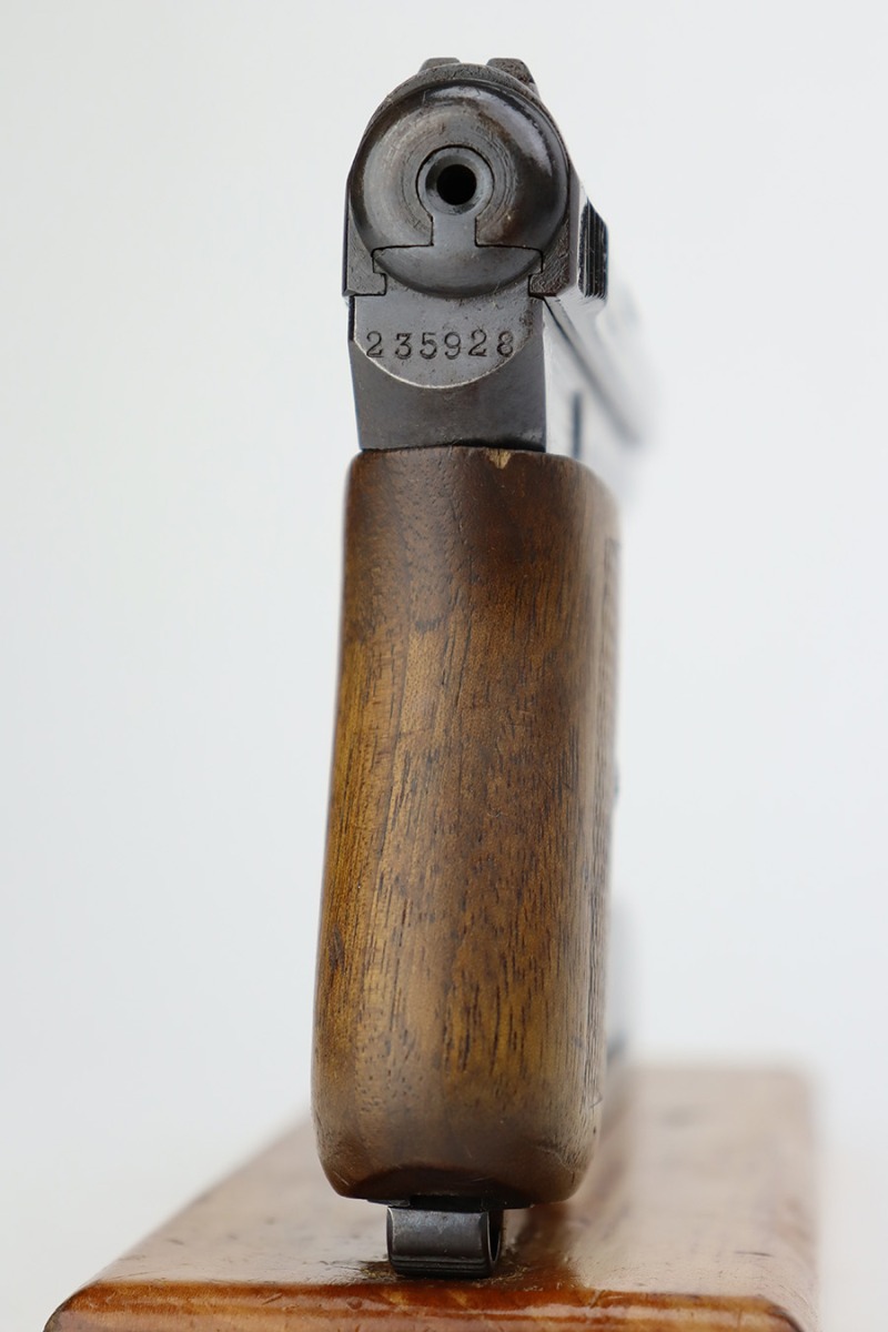 7/11/23 – This is a third variation Mauser Model 1914 sold in the commercial market during WW1. It is all matching and has the proper “Double Crown U” commercial proofs. It has retained roughly 85% of its original finish. Generally, there is light spotty oxidation throughout and areas of wear around the muzzle, around the high edges, and on the front strap. Fitted with a nice period-correct wood grip and comes with one proper magazine. The bore has decent rifling, but there is tiny pitting throughout.