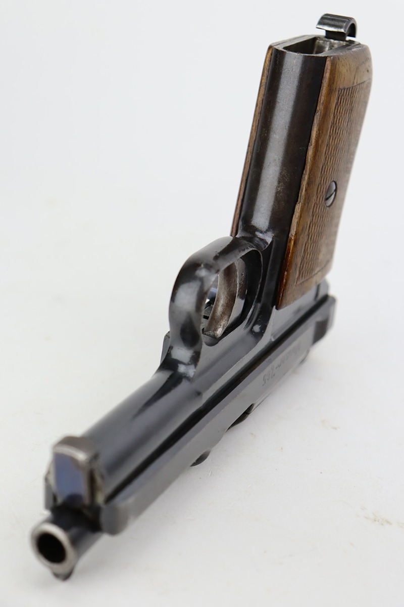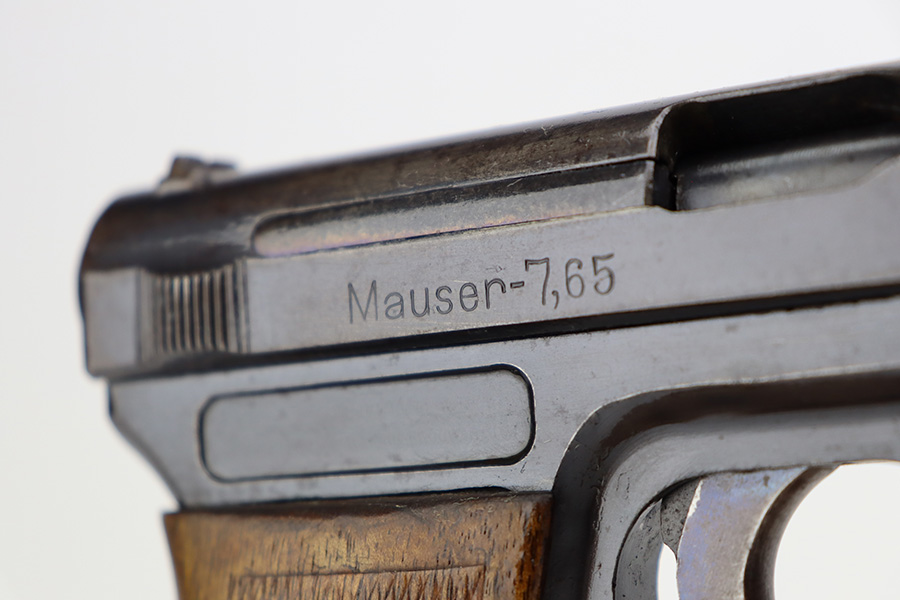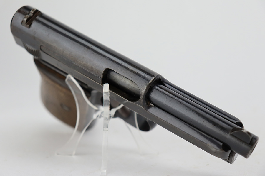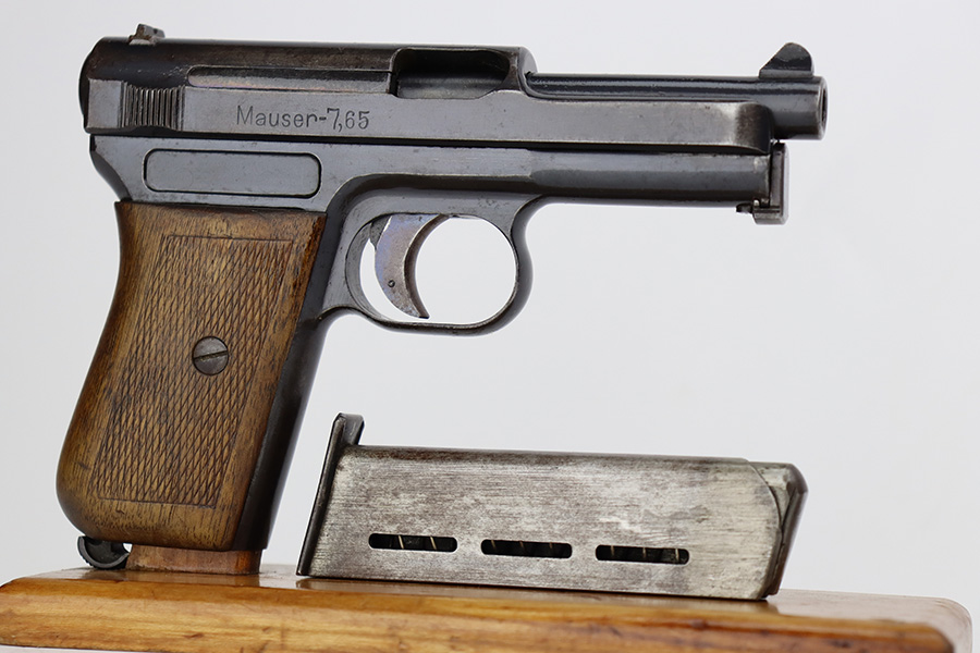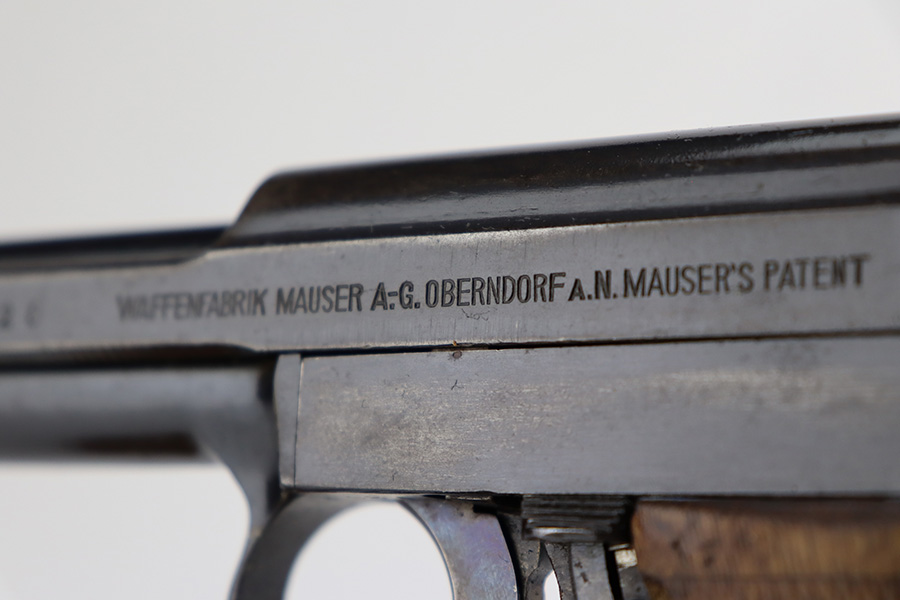 7/11/23 – This is a third variation Mauser Model 1914 sold in the commercial market during WW1. It is all matching and has the proper “Double Crown U” commercial proofs. It has retained roughly 85% of its original finish. Generally, there is light spotty oxidation throughout and areas of wear around the muzzle, around the high edges, and on the front strap. Fitted with a nice period-correct wood grip and comes with one proper magazine. The bore has decent rifling, but there is tiny pitting throughout.