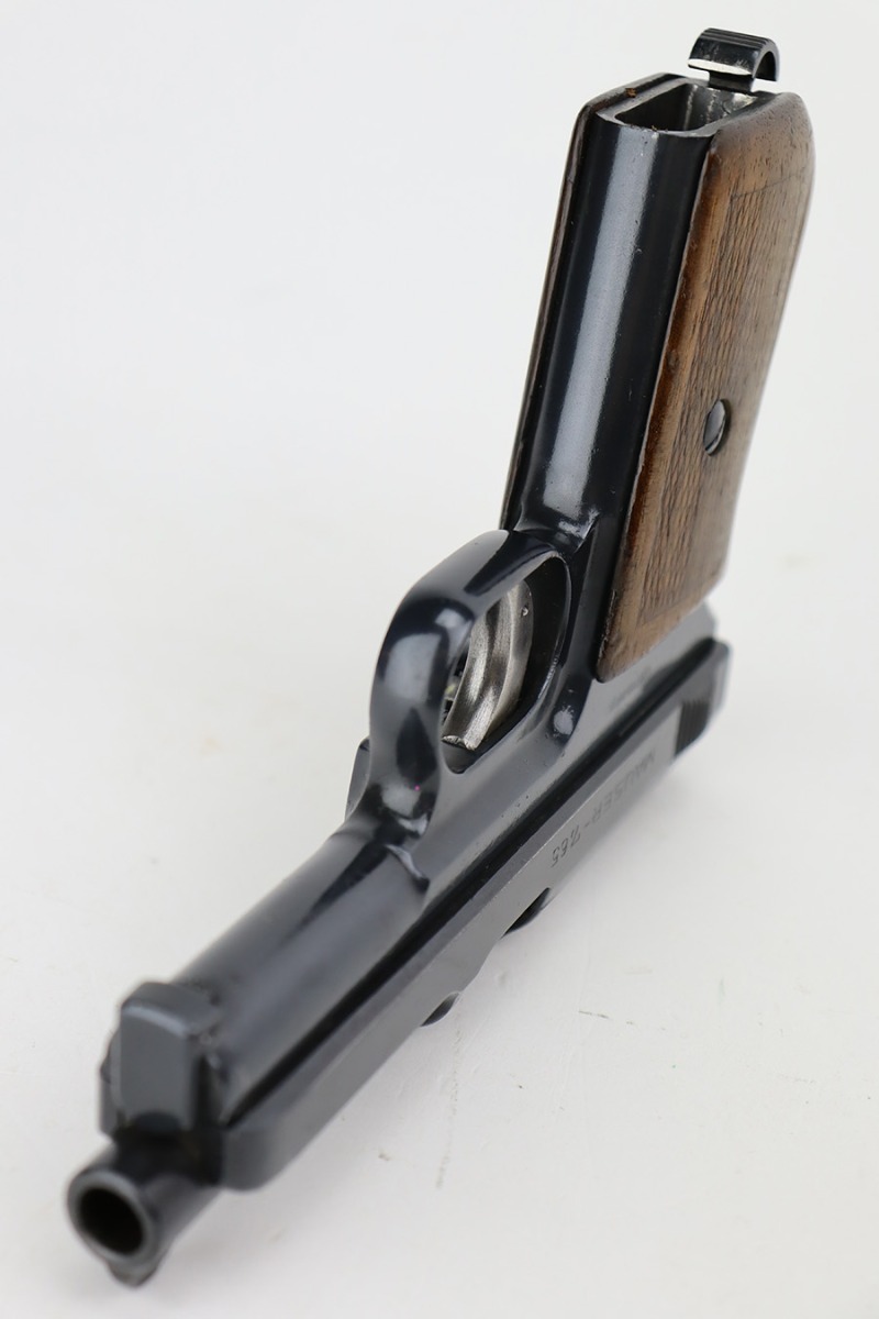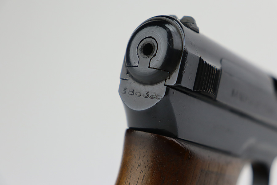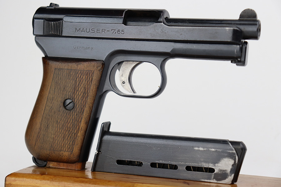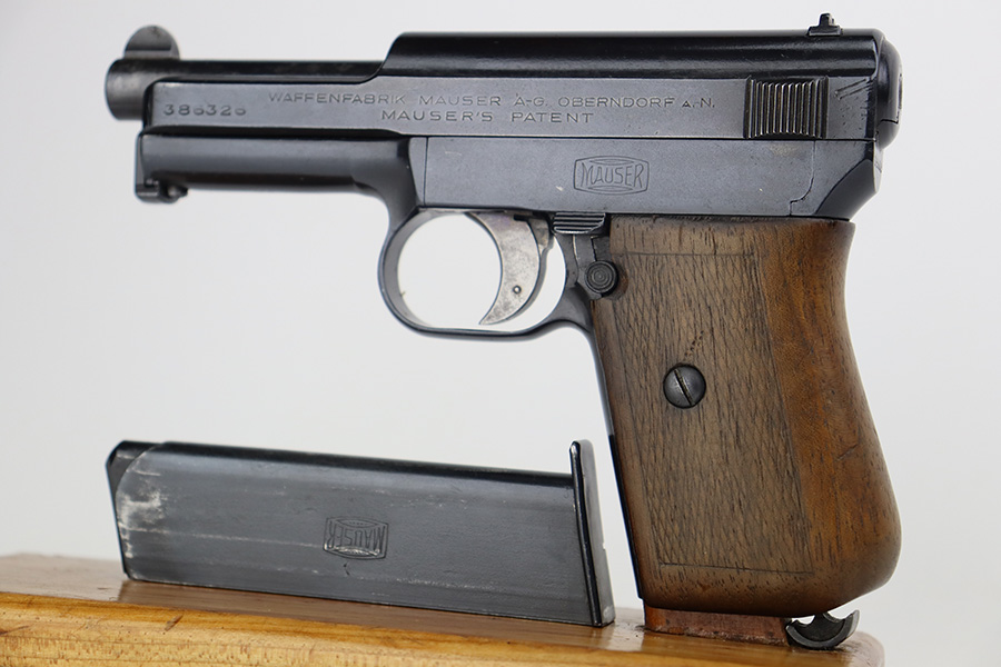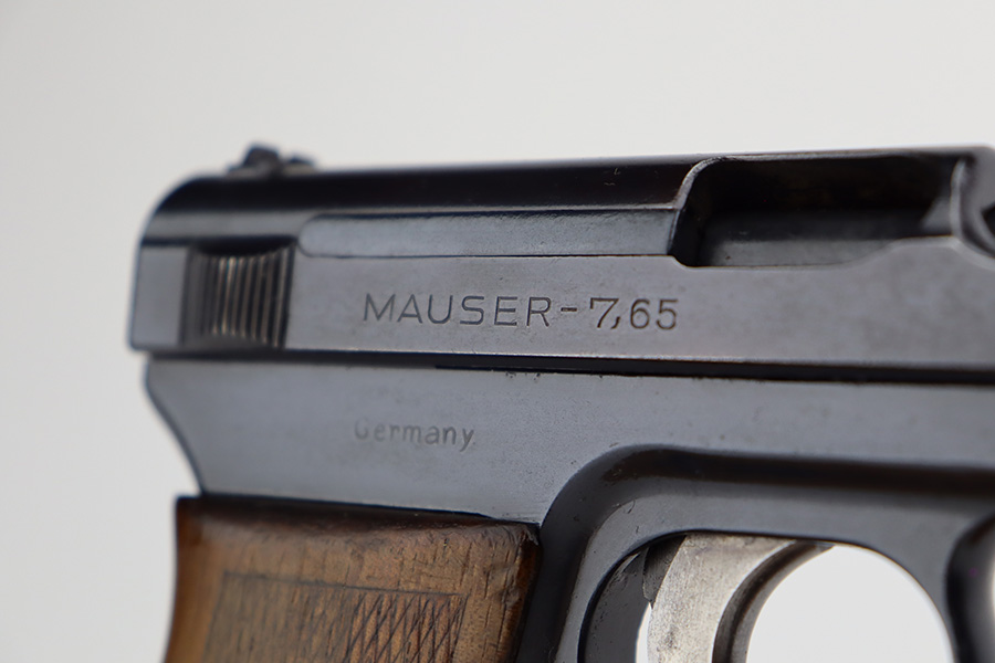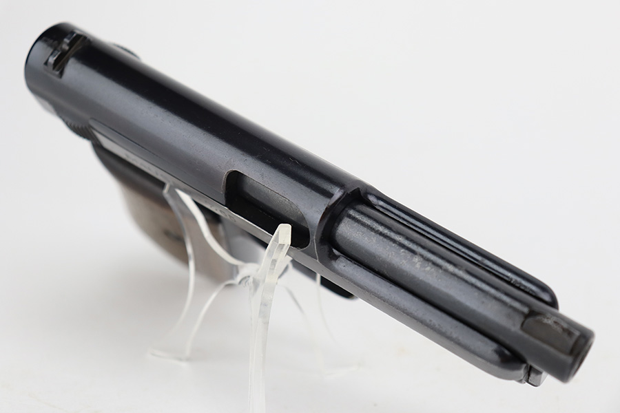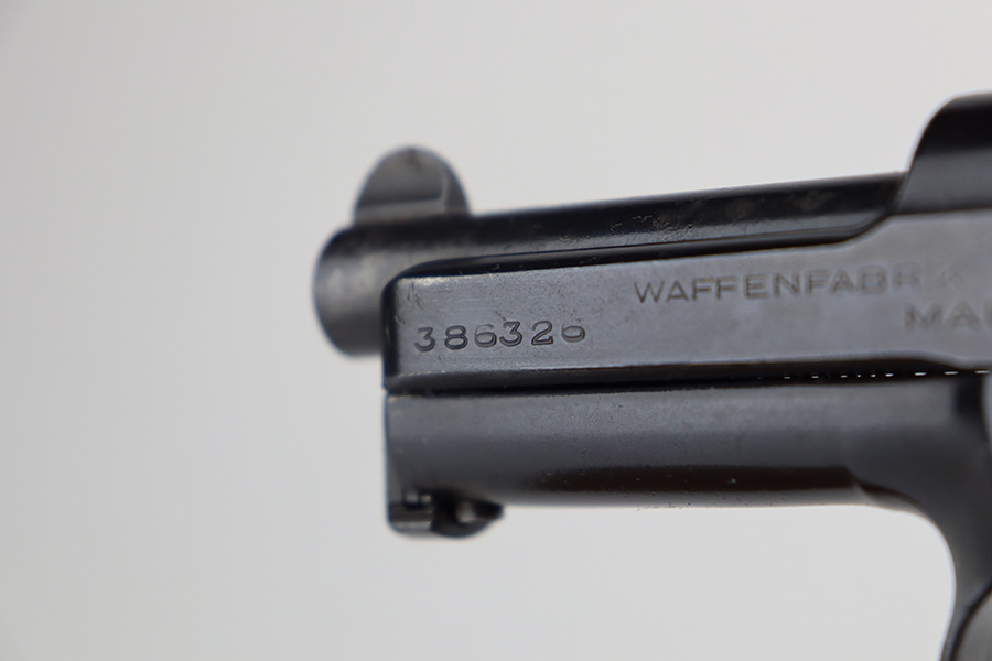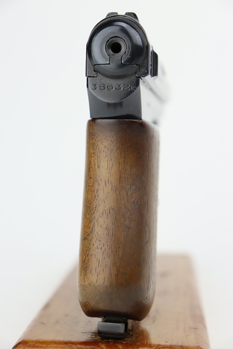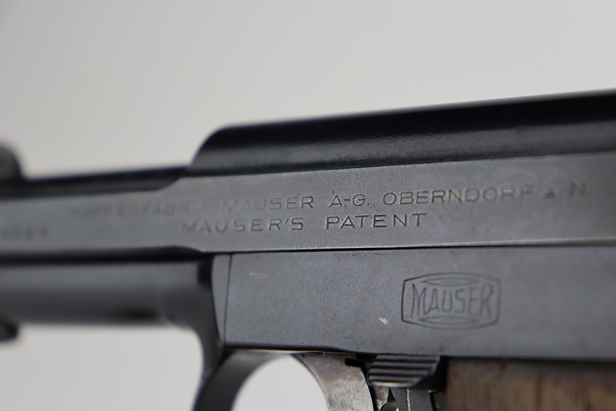 8/24/23 – This is a nice example of a Mauser Model 1914 sold in the commercial market in the 1920’s. It is all matching and properly “Double Crown U” proofed. The entire gun has been re-blued. There is very little actual finish loss, but there are areas of pin-pricking covering most the slide and minor pitting on the barrel. Fitted with a slightly worn period-correct wood grip and comes with one proper magazine. The bore has decent rifling, but there is pin-pricking throughout.