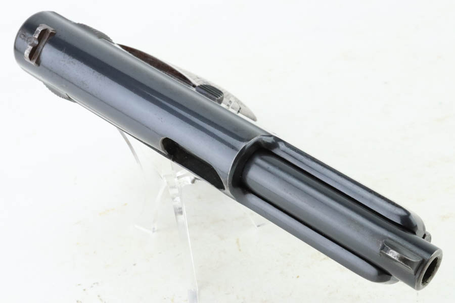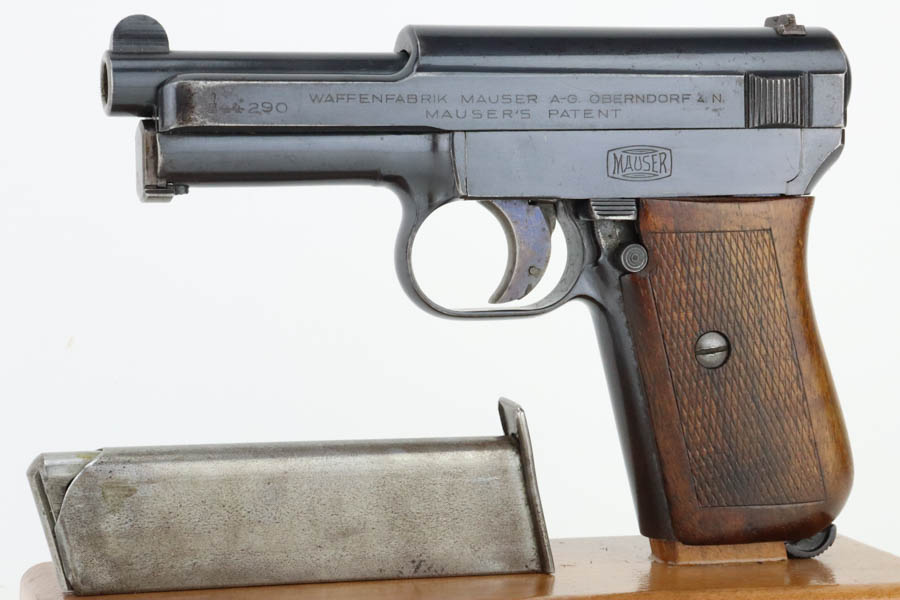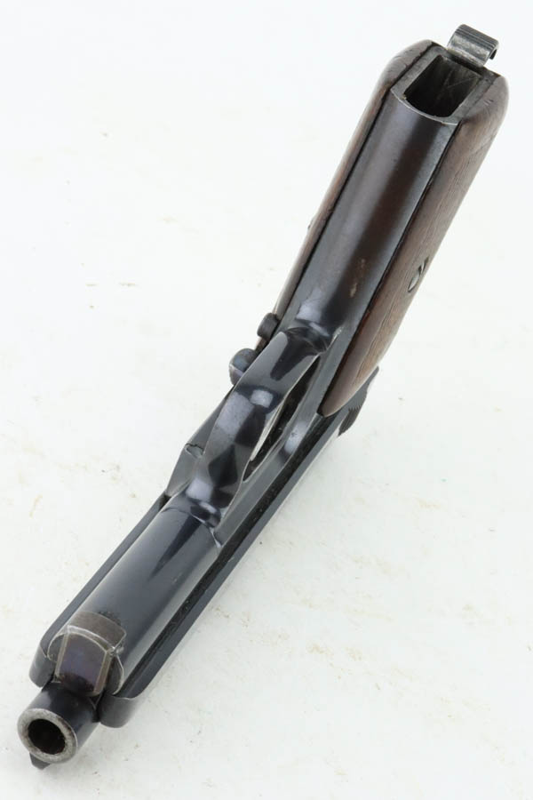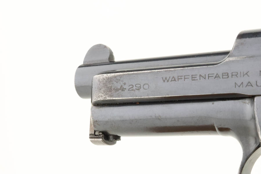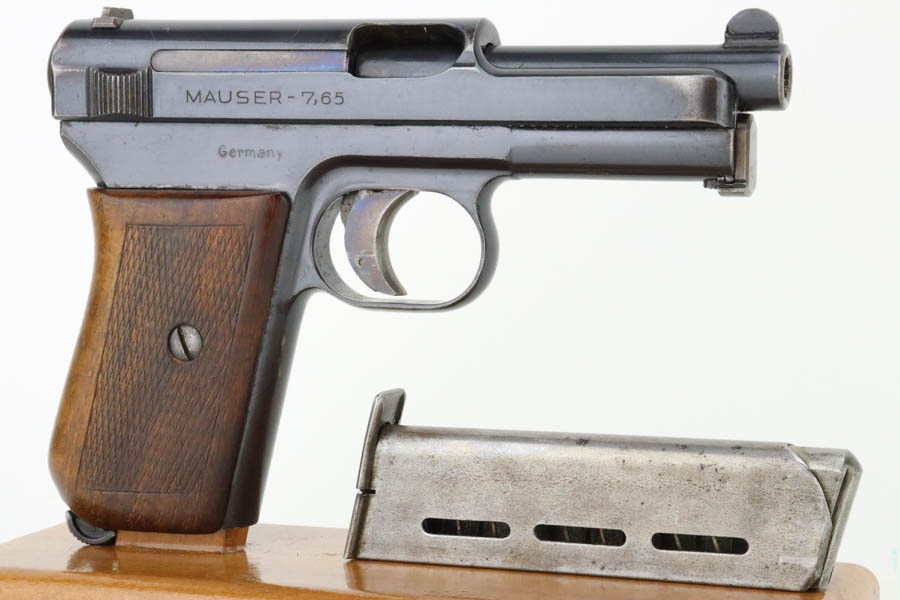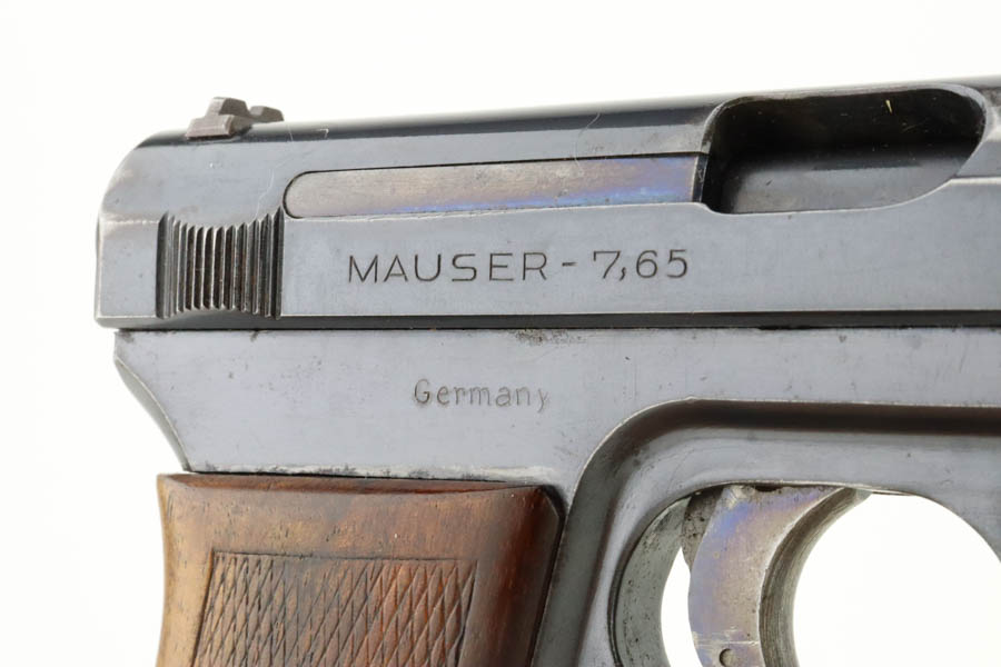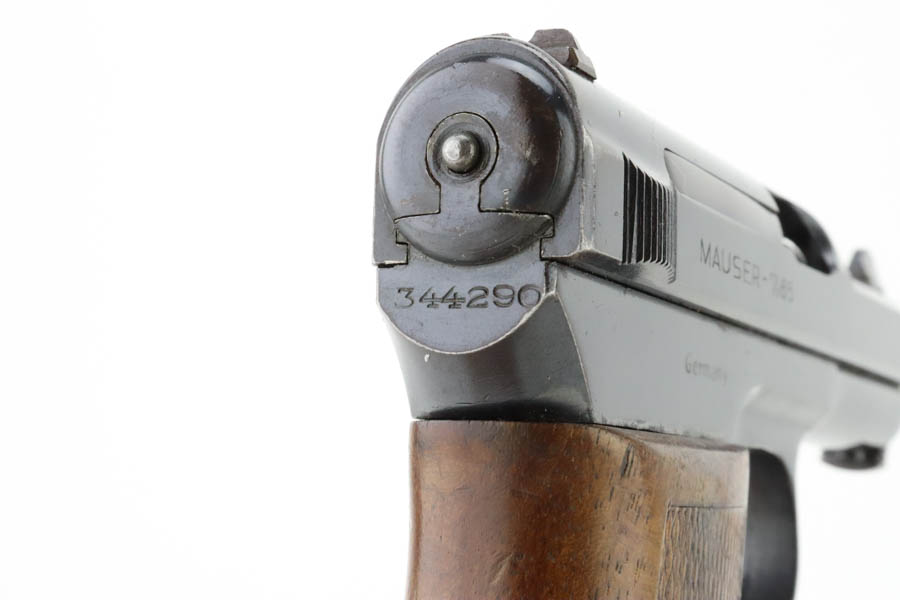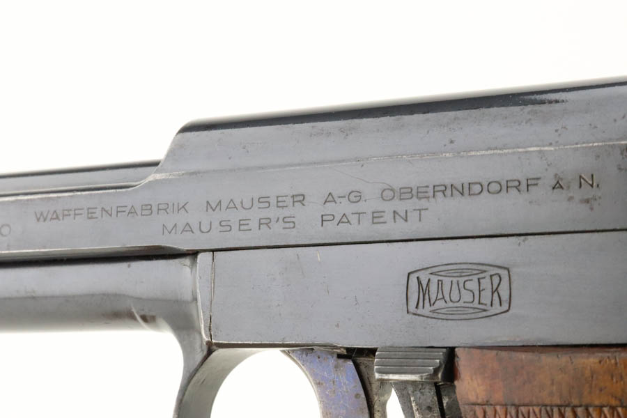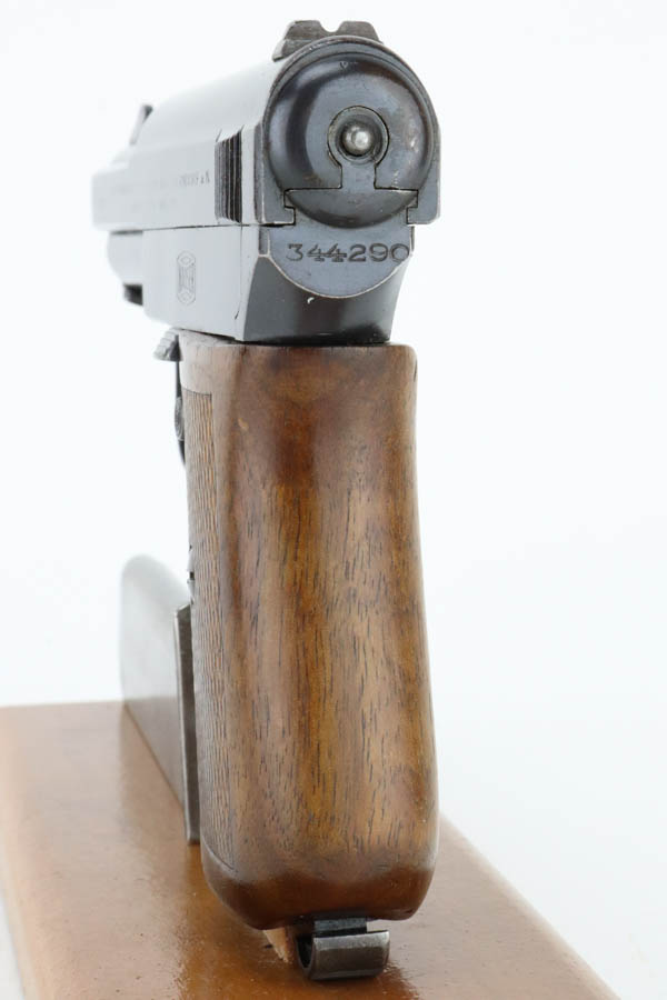7/11/24 – This is an excellent example of a Mauser Model 1914 sold in the commercial market in the 1920’s. All matching and “Double Crown U” proofed. “Germany” export marking on the right side of the frame. The original finish rates about 96% with minor general high edge wear, a couple of spots of light freckling on the slide, and some dulling on the front strap. Fitted with a period-correct wood grip and comes with one proper magazine. Minty bore.