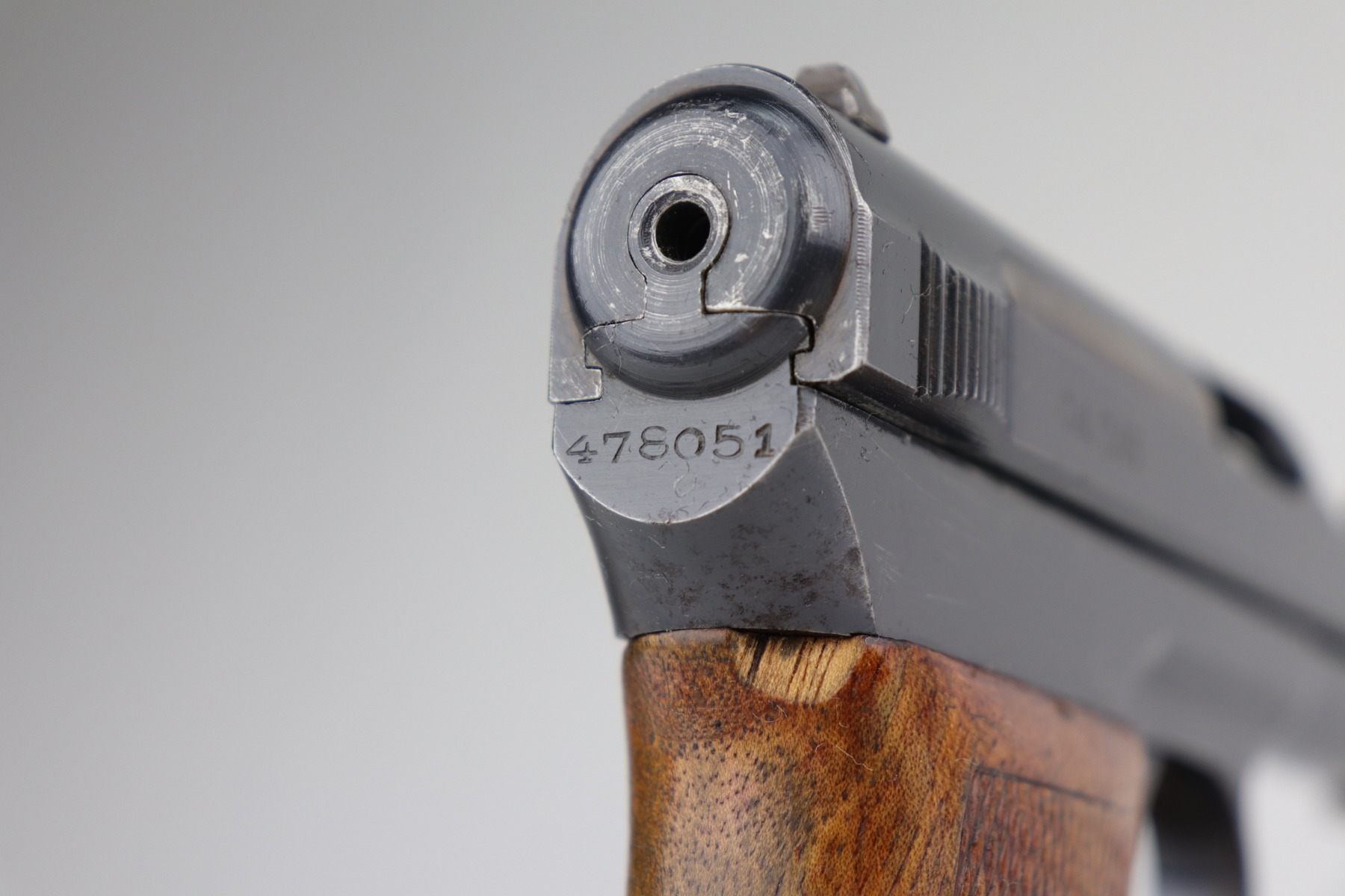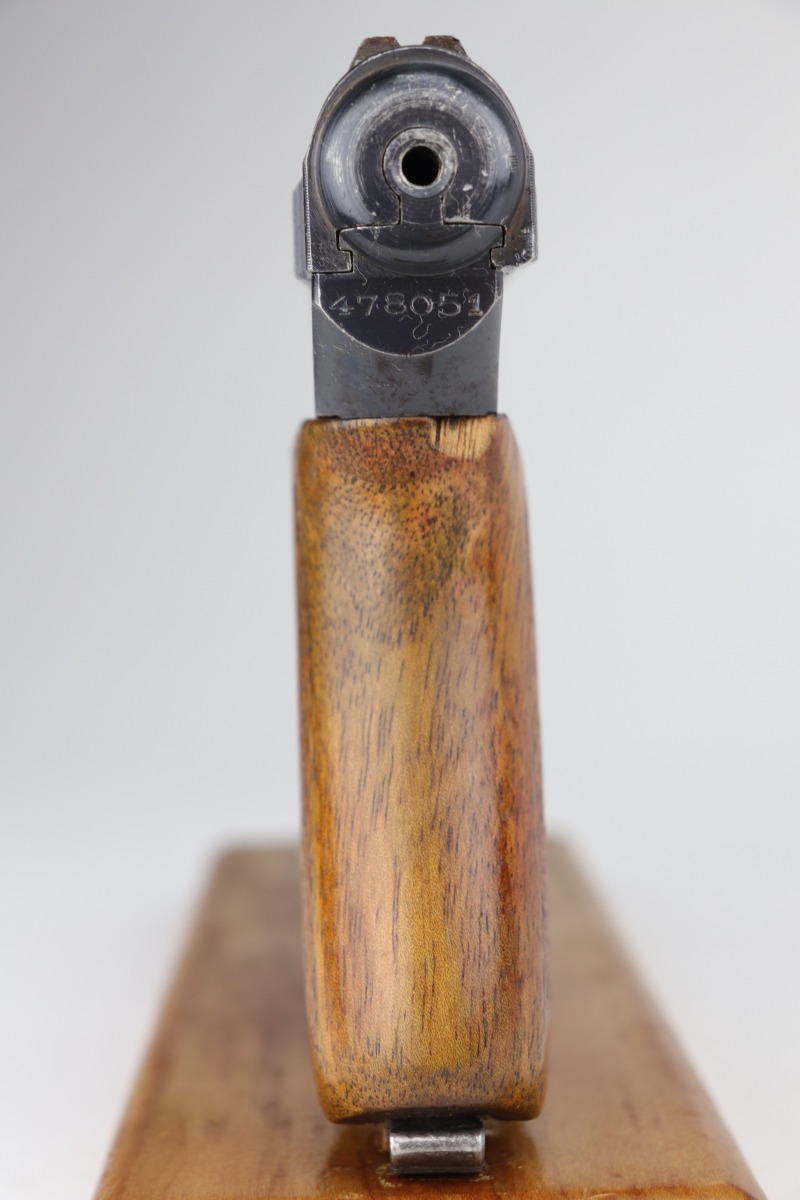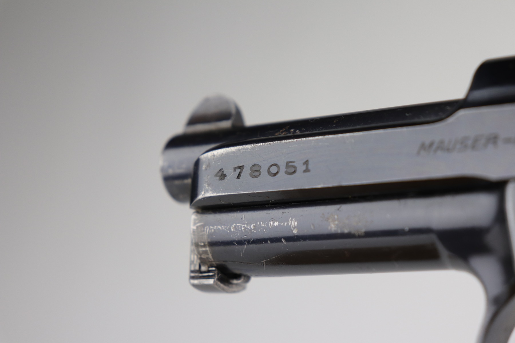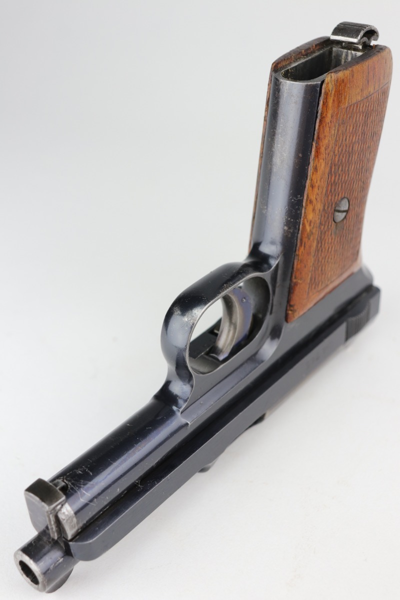 1/13/21 – This is a very nice example of a Mauser Model 1914/34 Transitional, made in about 1929-33. The only real difference between this and the earlier model is the slide legend. They made about 58,000 of this variation. This one is excellent, retaining about 95-96% of its original bluing. While there isn’t much actual finish loss, there are light scratches and handling marks throughout. There is also some spotty wear around the muzzle and on the front strap. It comes with a very nice grip – small chip near the spine. Also comes with a period-correct magazine. The slide has trouble staying back with this mag. The bore is excellent – shiny with strong rifling.