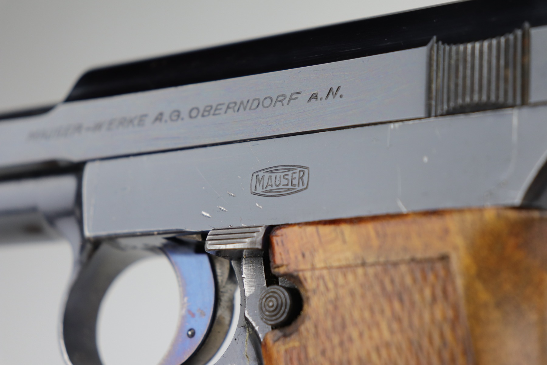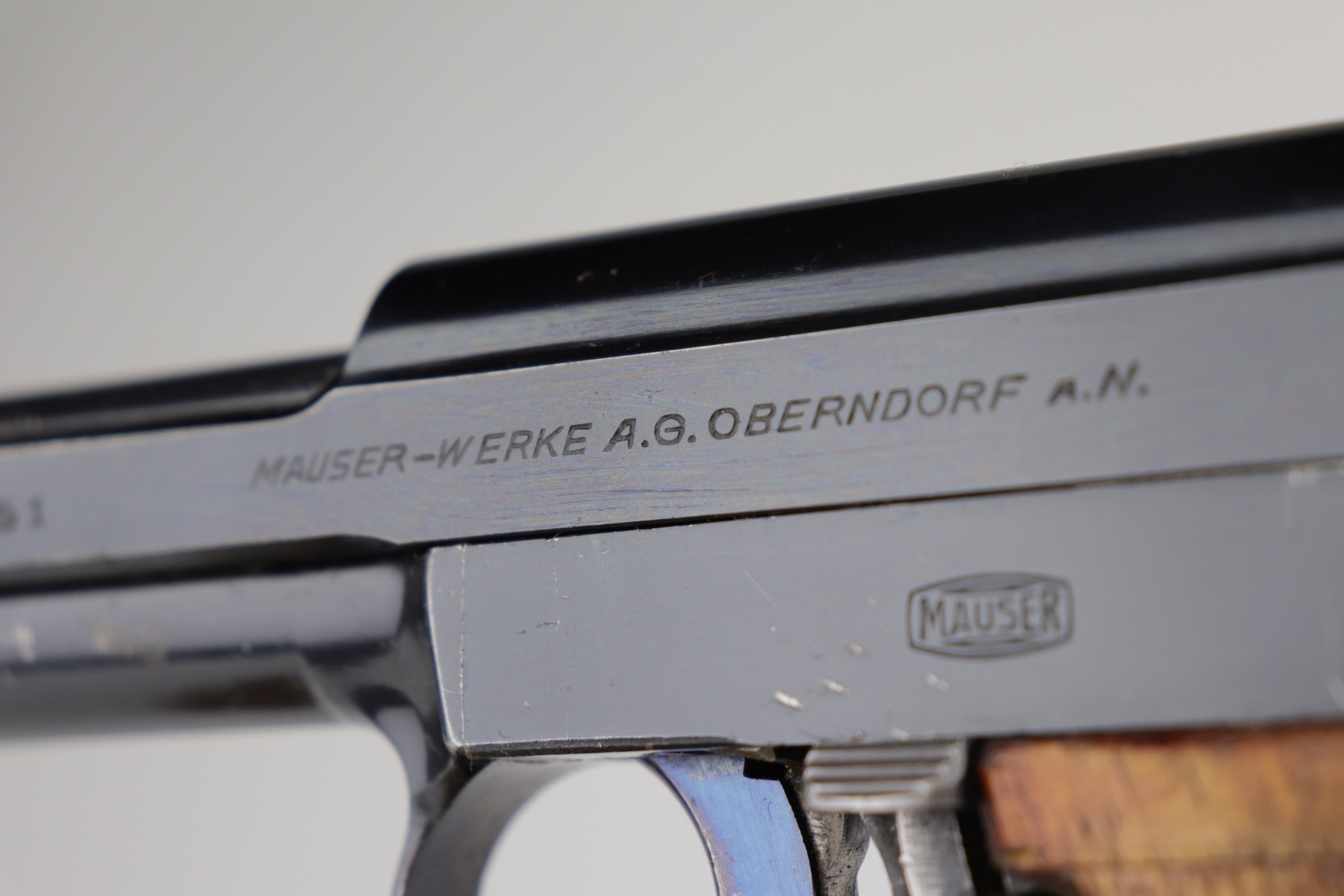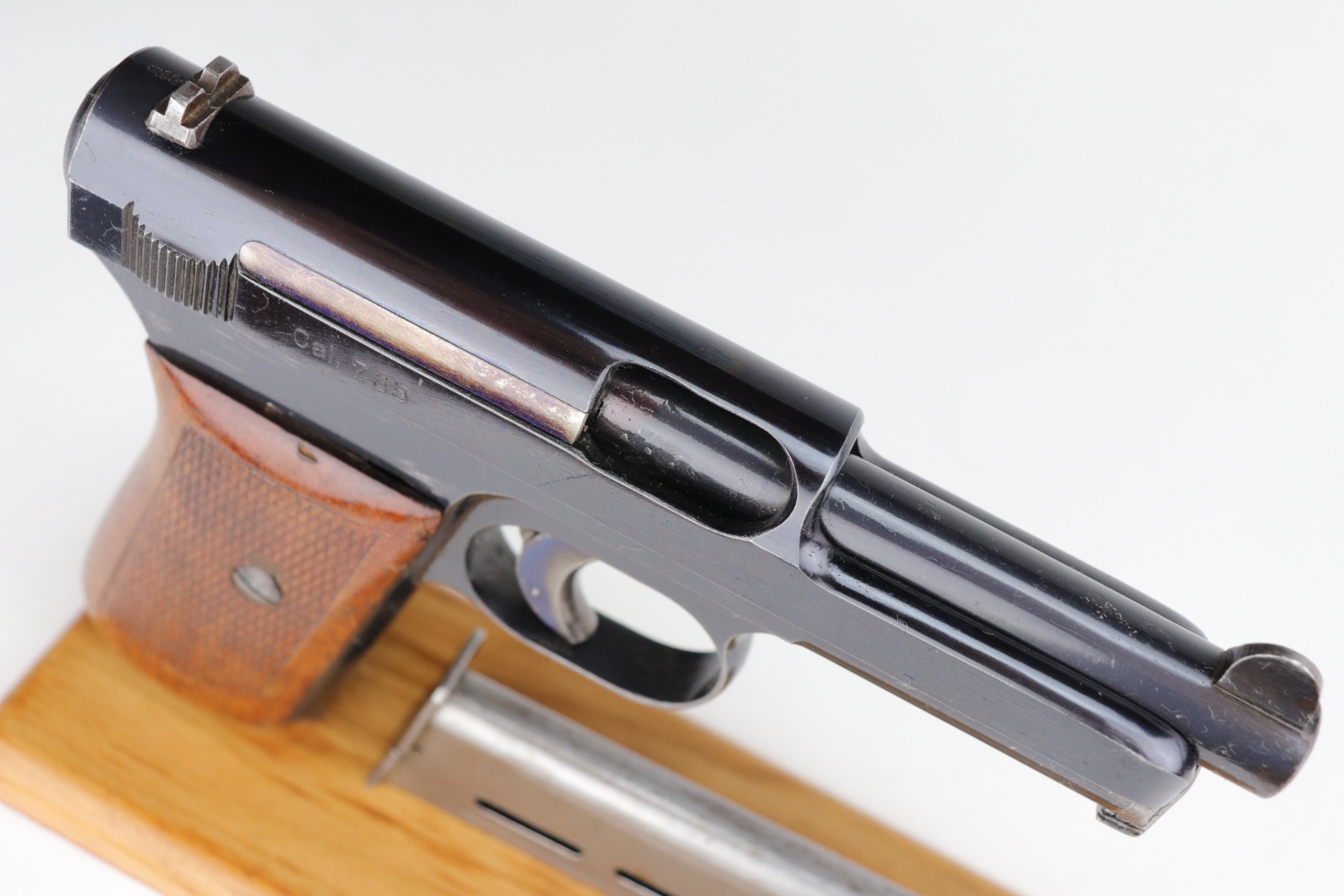 1/13/21 – This is a very nice example of a Mauser Model 1914/34 Transitional, made in about 1929-33. The only real difference between this and the earlier model is the slide legend. They made about 58,000 of this variation. This one is excellent, retaining about 95-96% of its original bluing. While there isn’t much actual finish loss, there are light scratches and handling marks throughout. There is also some spotty wear around the muzzle and on the front strap. It comes with a very nice grip – small chip near the spine. Also comes with a period-correct magazine. The slide has trouble staying back with this mag. The bore is excellent – shiny with strong rifling.